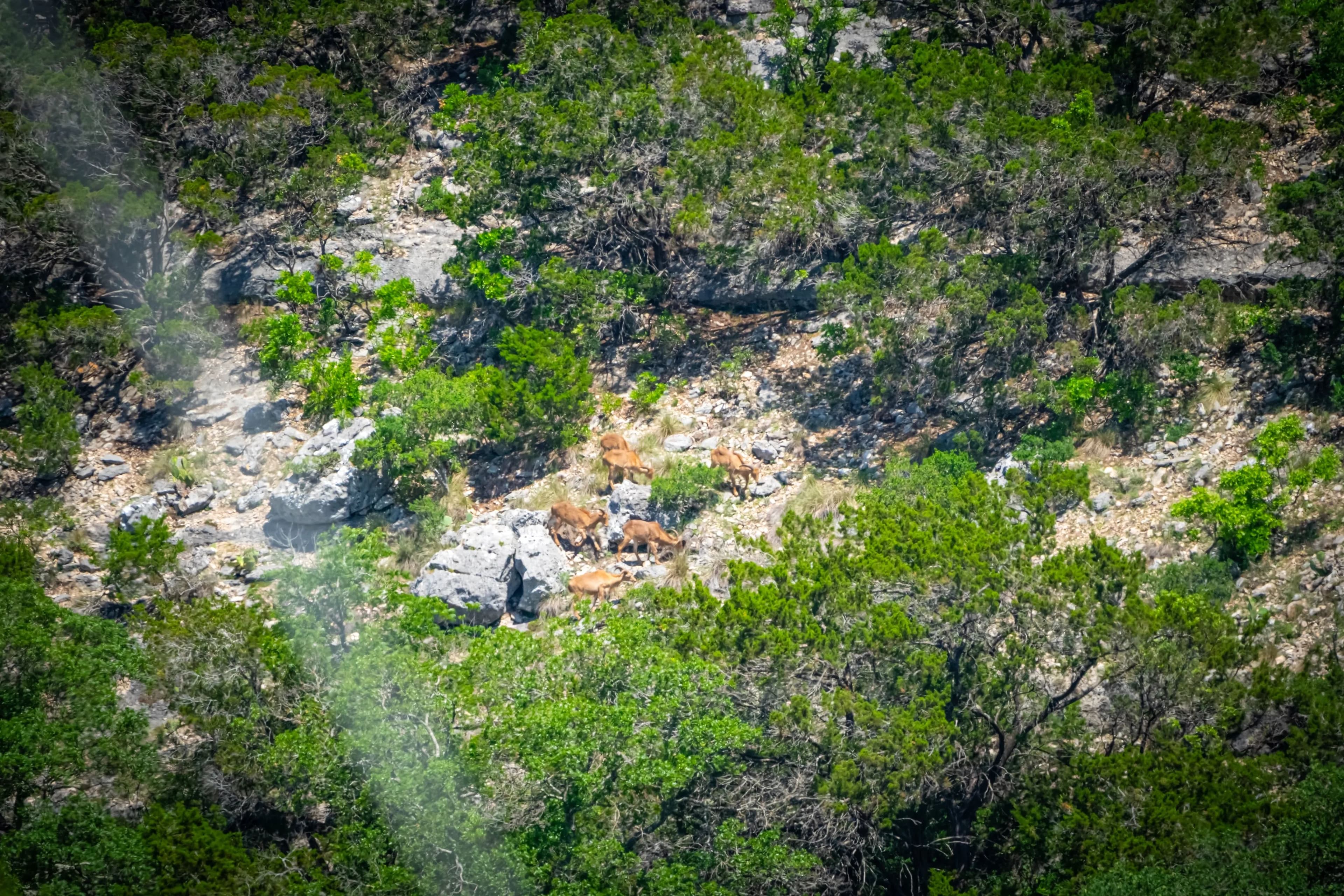 The ranch also is home, or is used by, an incredible diversity of wildlife. Native species, including white-tailed deer, Rio Grande turkey, dove, songbirds, waterfowl and predator species can all be found on the ranch. Free ranging exotics including aoudad, red deer, elk, sika deer and feral hogs are regularly found on the ranch.