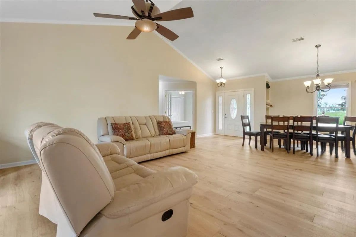 The contemporary ranch-style home boasts 3 bedrooms, 2.5 baths, an office, 2 living areas, and a mud room and is designed for comfortable country living.