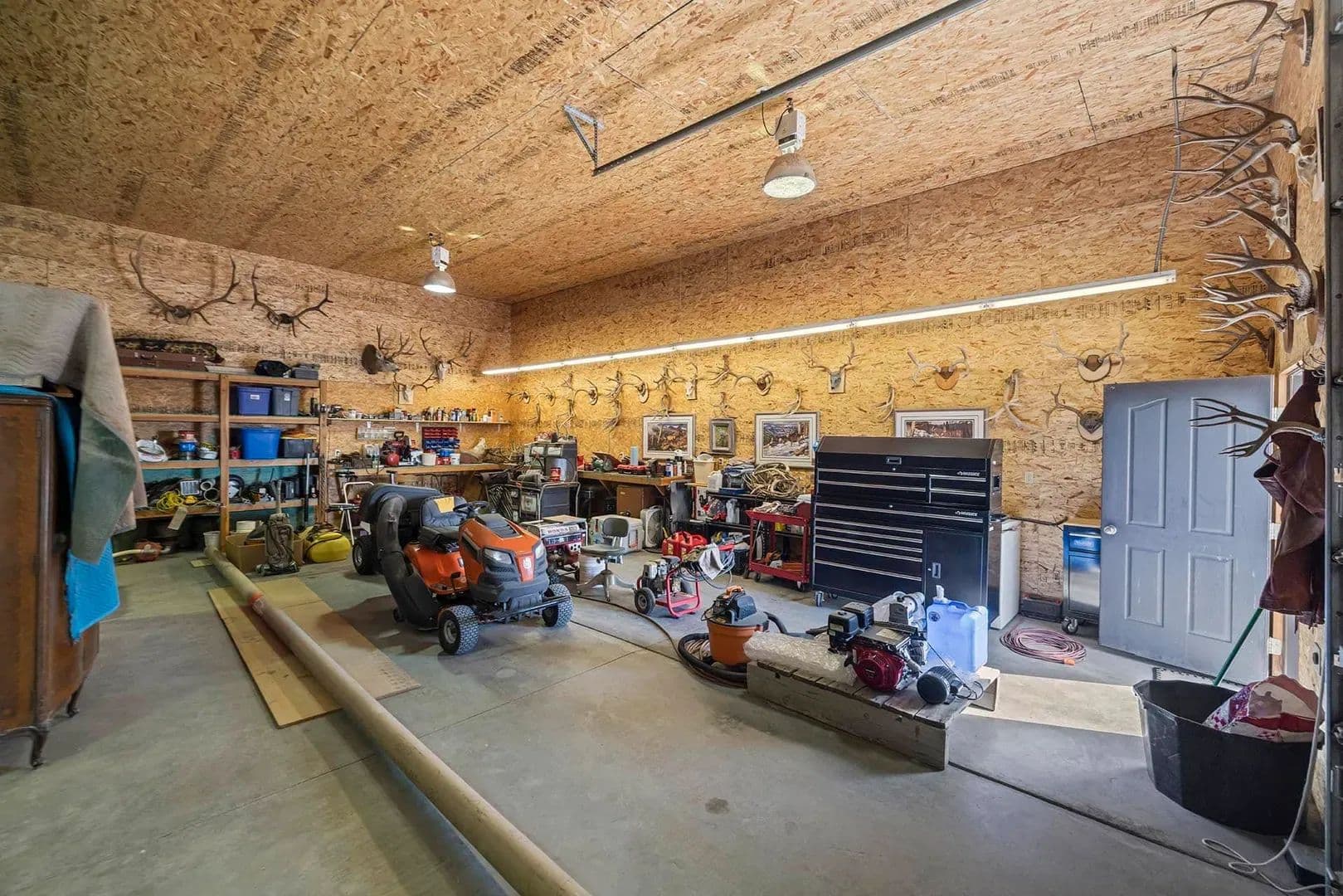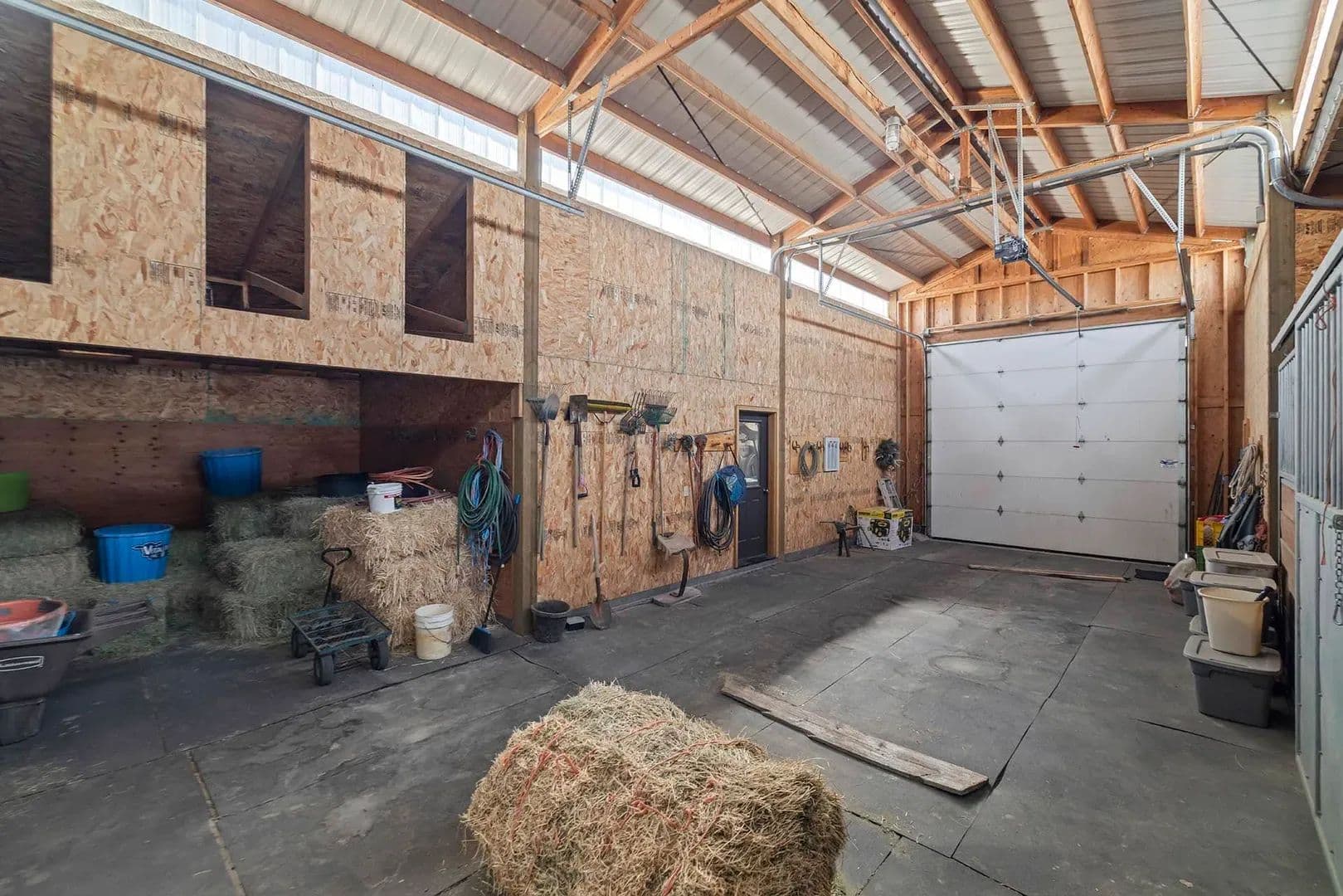 A short walk across the breezeway takes you to an oversized garage. Two outbuildings infuse function into the compound: the 44’ x 56’ barn offers large overhead doors on either end for easy pull-through access, two horse stalls, a climate-controlled office, a bathroom, and hot water. Just beyond that, the 39’ x 36’ shop includes finished flex space, a workshop area, and covered hay storage. Additional site features include loafing sheds, working corrals, water tanks, and fenced pastures rounding out a property ready to run cattle, keep horses, or both.