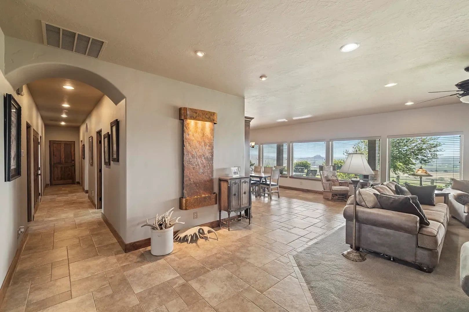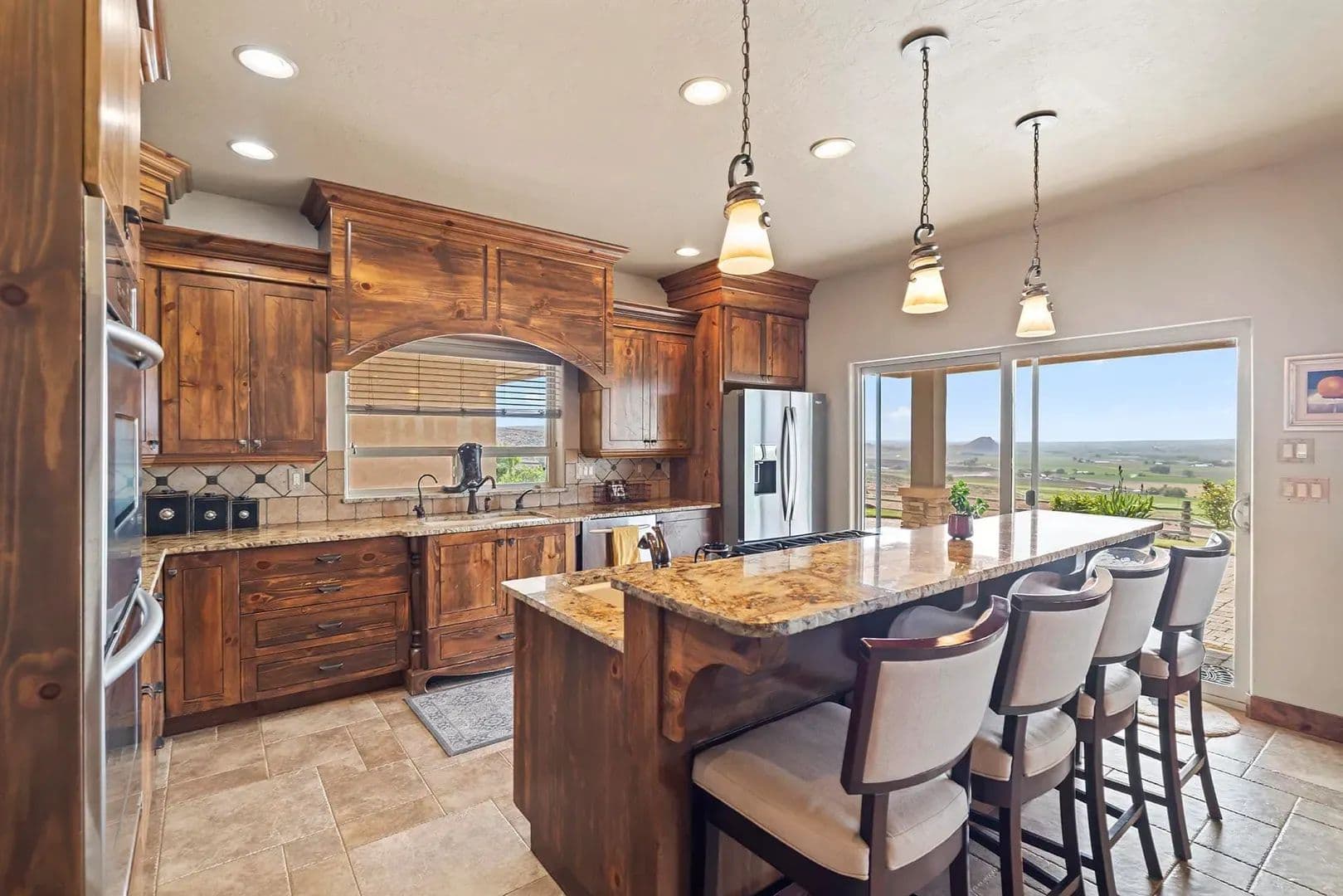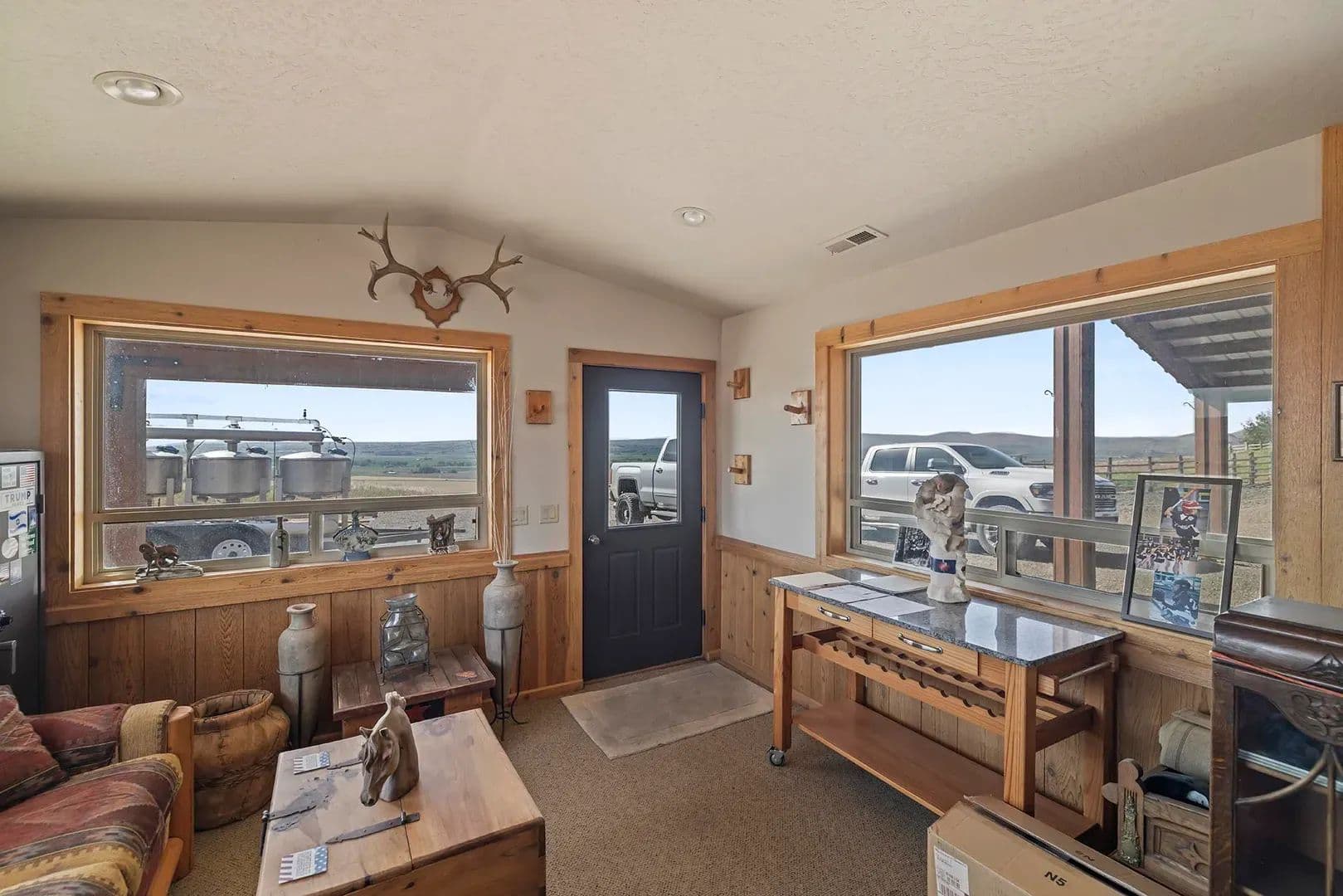 The setup here is clean, practical, and built with purpose. A 3,020± square-foot home anchors the property with a functional yet aesthetic layout, including travertine tile underfoot and a well-appointed kitchen. The home has a wide-open feel, with spacious common areas that flow naturally from kitchen to dining to living room, all lined with windows that pull in the view and natural light.