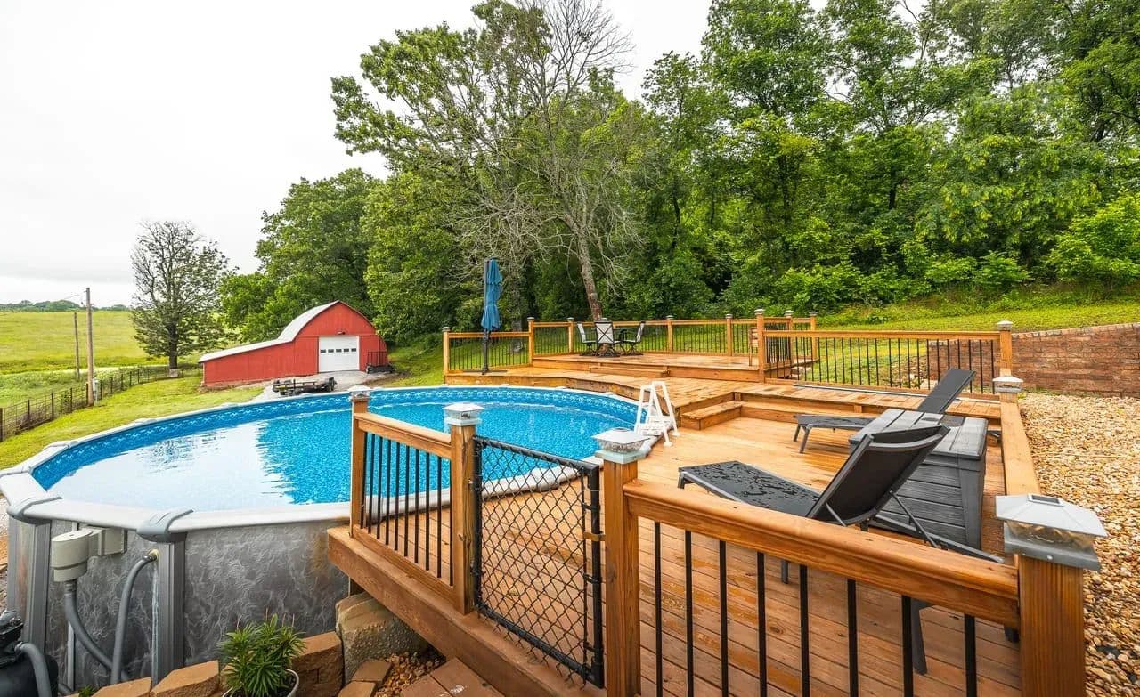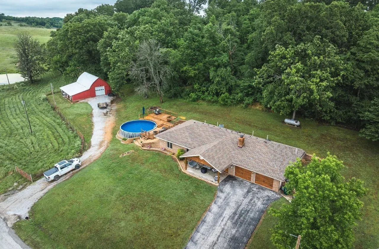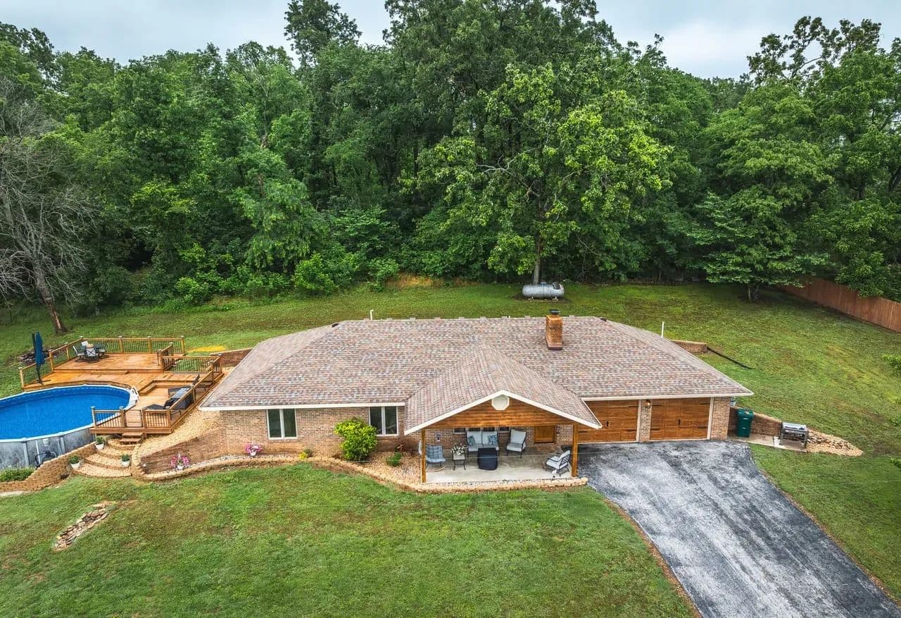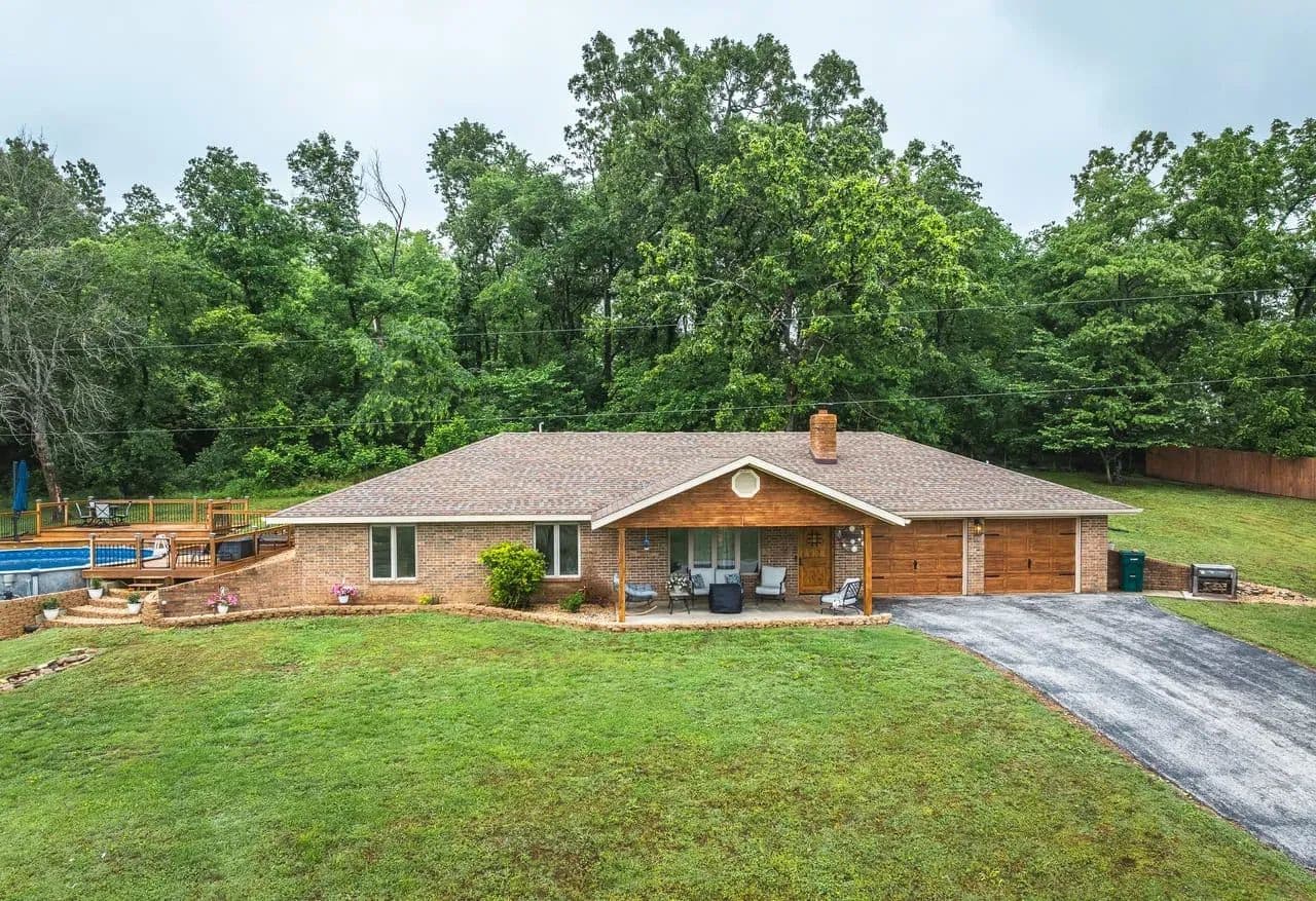 Charming 2BR/2BA Berm-Style Brick Home on 8+ Wooded Acres with Pool and Barn Don't miss this beautifully remodeled 2-bedroom, 2-bath berm-style brick home situated on approximately 8 mostly wooded acres, offering privacy, comfort, and space to entertain. This home features over 2,100 sq ft of living space, including a spacious primary suite with a fully updated bath showcasing dual vanities, large soaking tub and a large walk-in shower. The open-concept layout connects the living, dining, and kitchen areas for easy flow. The kitchen is equipped with modern finishes and automatic under-cabinet lighting, adding both function and ambiance. Enjoy panoramic views from the large covered front patio, or entertain guests on the multi-level deck that surrounds a 24x54 round above-ground pool. The attached 2-car garage adds convenience, while a large barn with lean-to offers ample storage for equipment, tools, or recreational toys. Property Features: 2 Bedrooms / 2 Bathrooms Approx. 2,100+ Sq Ft Remodeled interior with modern updates Primary bath with dual vanities & large walk-in shower Kitchen with automatic under-cabinet lighting Covered front patio with scenic views Multi-level deck surrounding 24x54 pool 2-car attached garage Large barn with lean-to for additional storage Approx. 8 mostly wooded acres Move-in ready and perfect for those seeking space, comfort, and outdoor enjoyment.