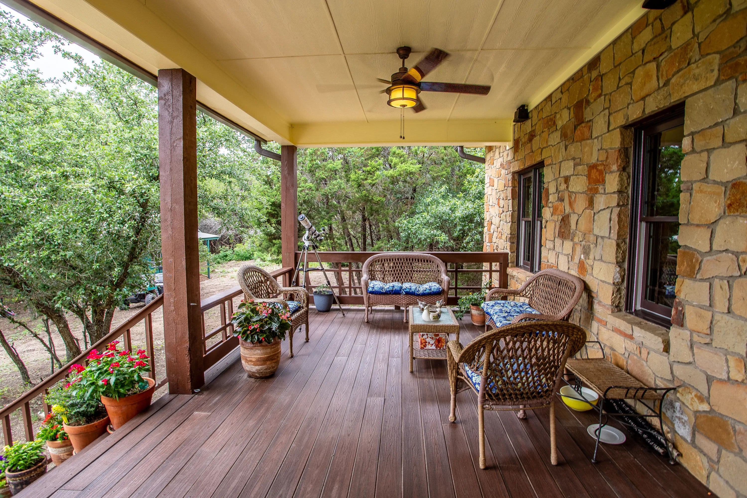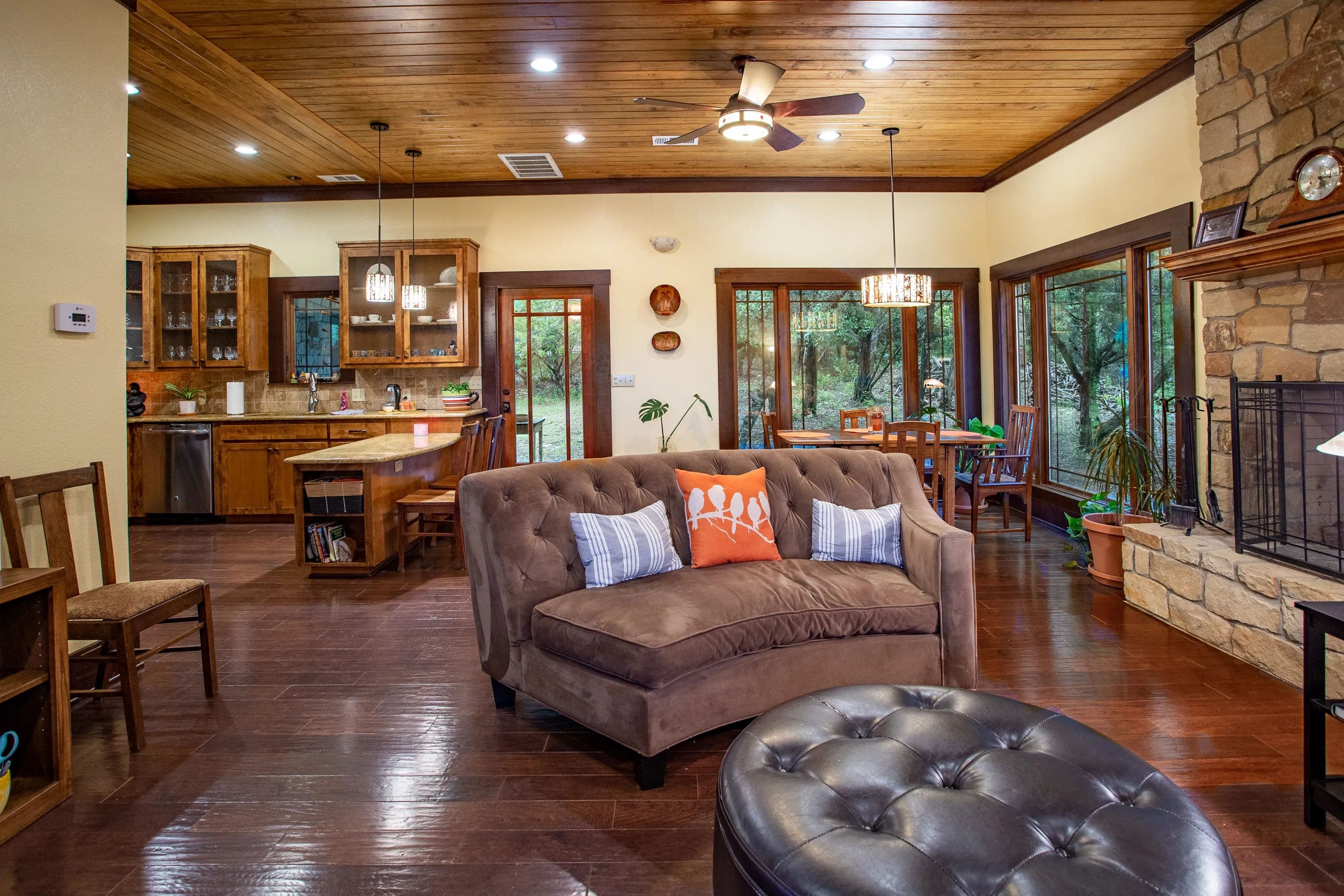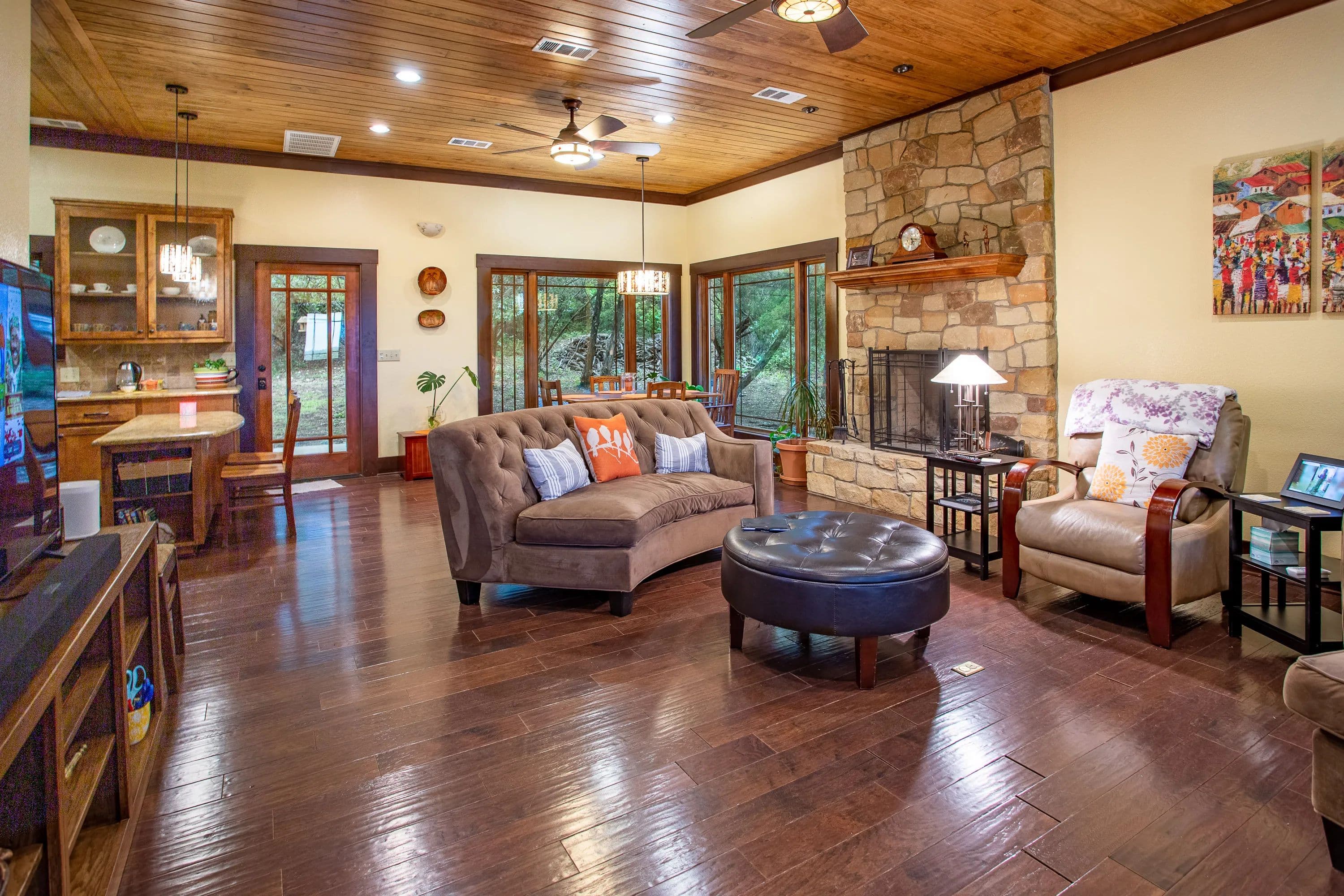 At the heart of the ranch, a charming two-story stone home, built in 2017, offers modern comfort with a rustic appeal. The home includes two spacious bedrooms, two full baths, and a versatile loft that can serve as a third bedroom or office. Large picture windows illuminate the open-concept living, dining, and kitchen areas, while a wood-burning fireplace adds warmth and character.