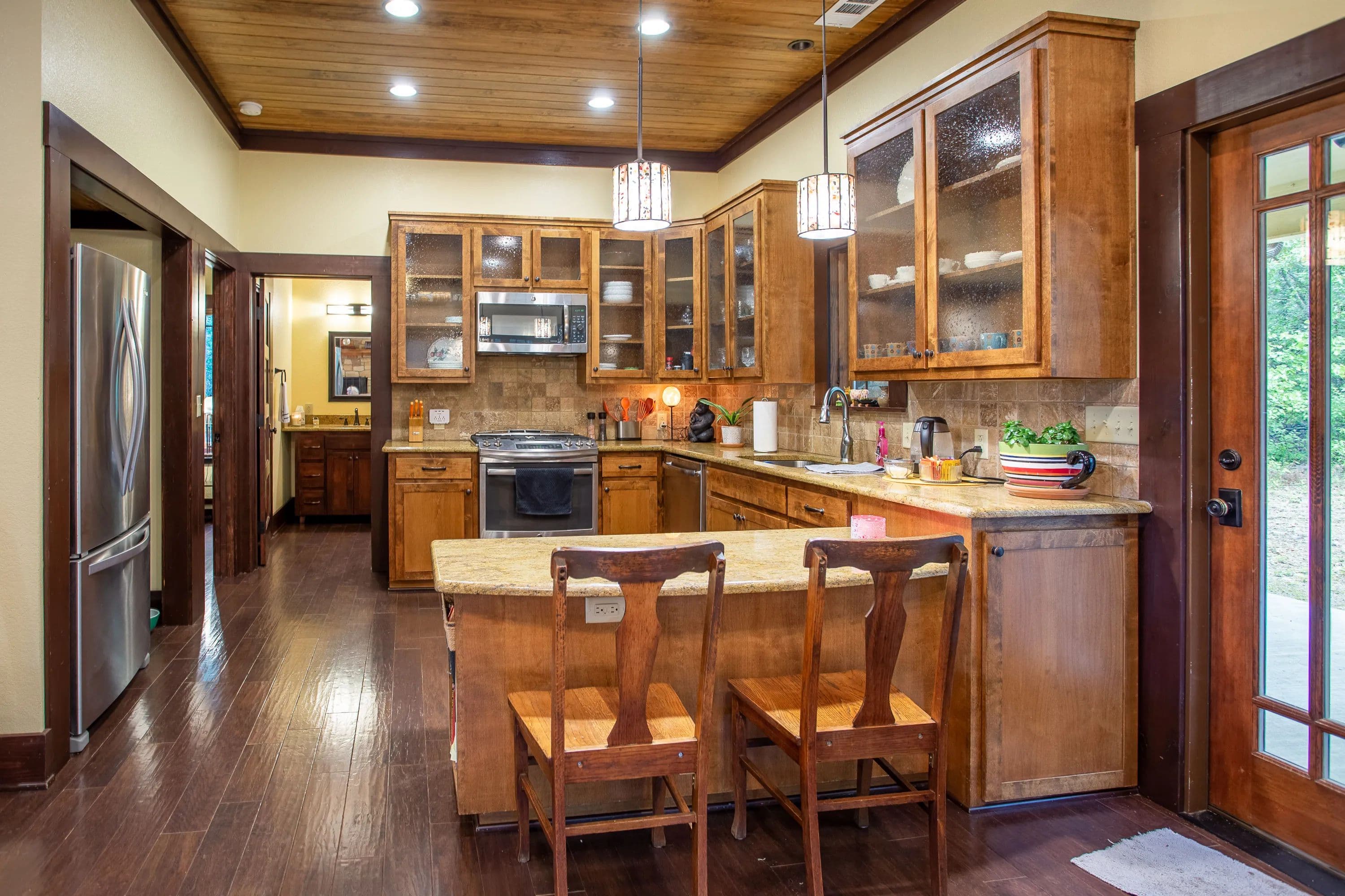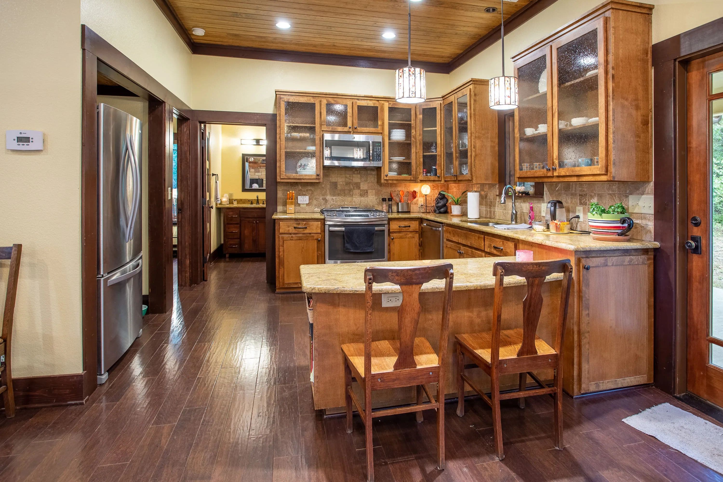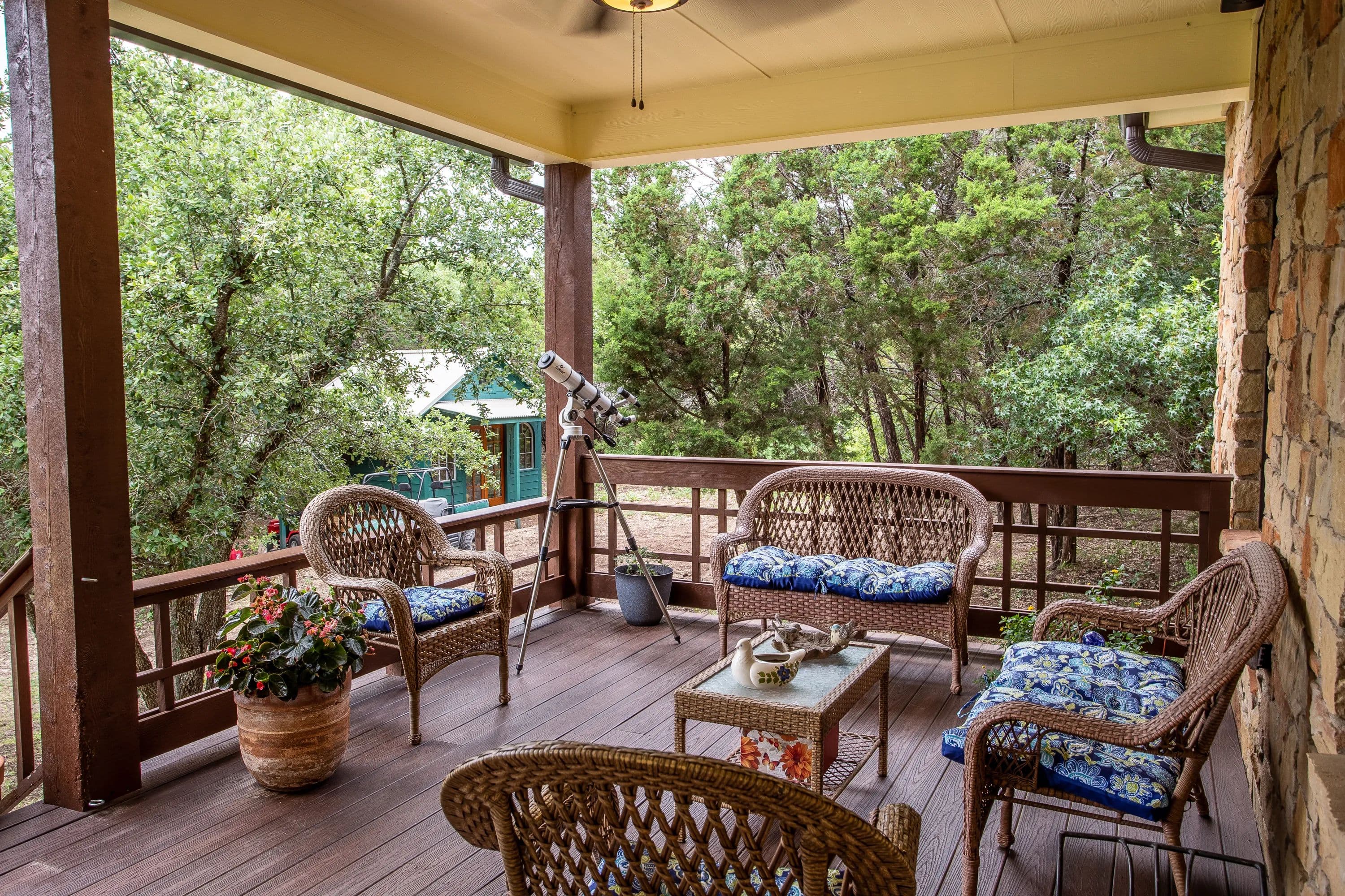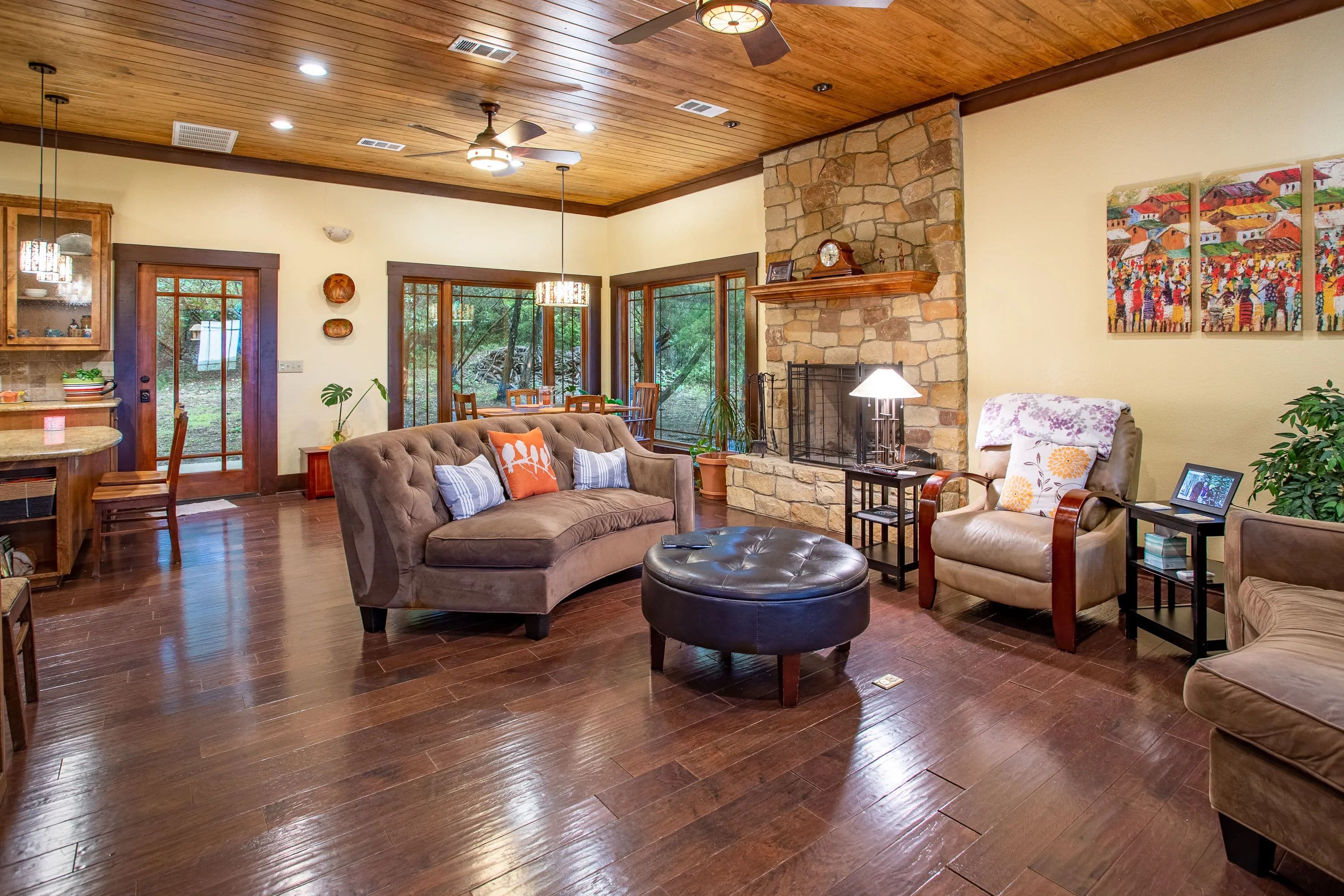 At the heart of the ranch, a charming two-story stone home, built in 2017, offers modern comfort with a rustic appeal. The home includes two spacious bedrooms, two full baths, and a versatile loft that can serve as a third bedroom or office. Large picture windows illuminate the open-concept living, dining, and kitchen areas, while a wood-burning fireplace adds warmth and character.