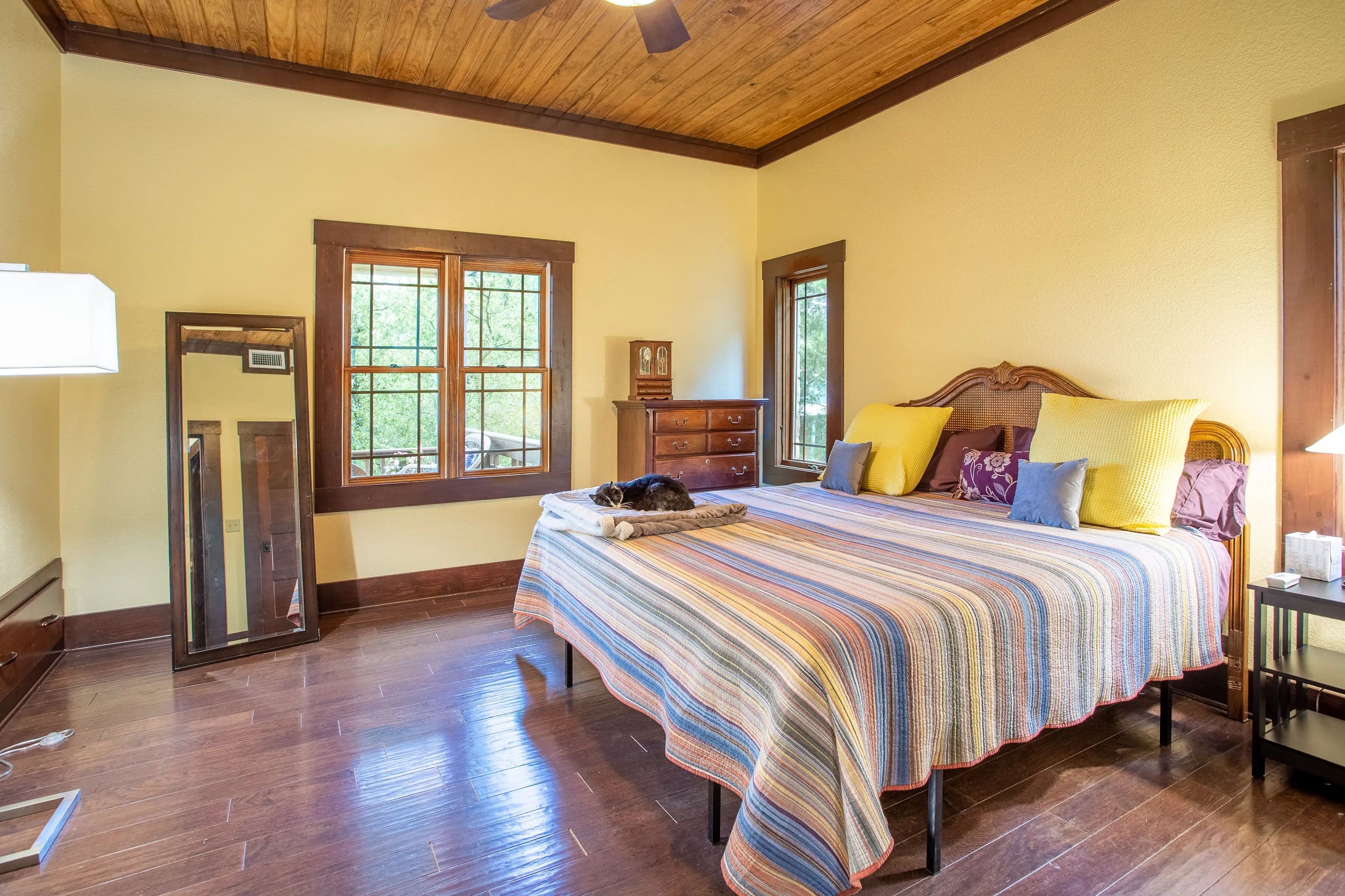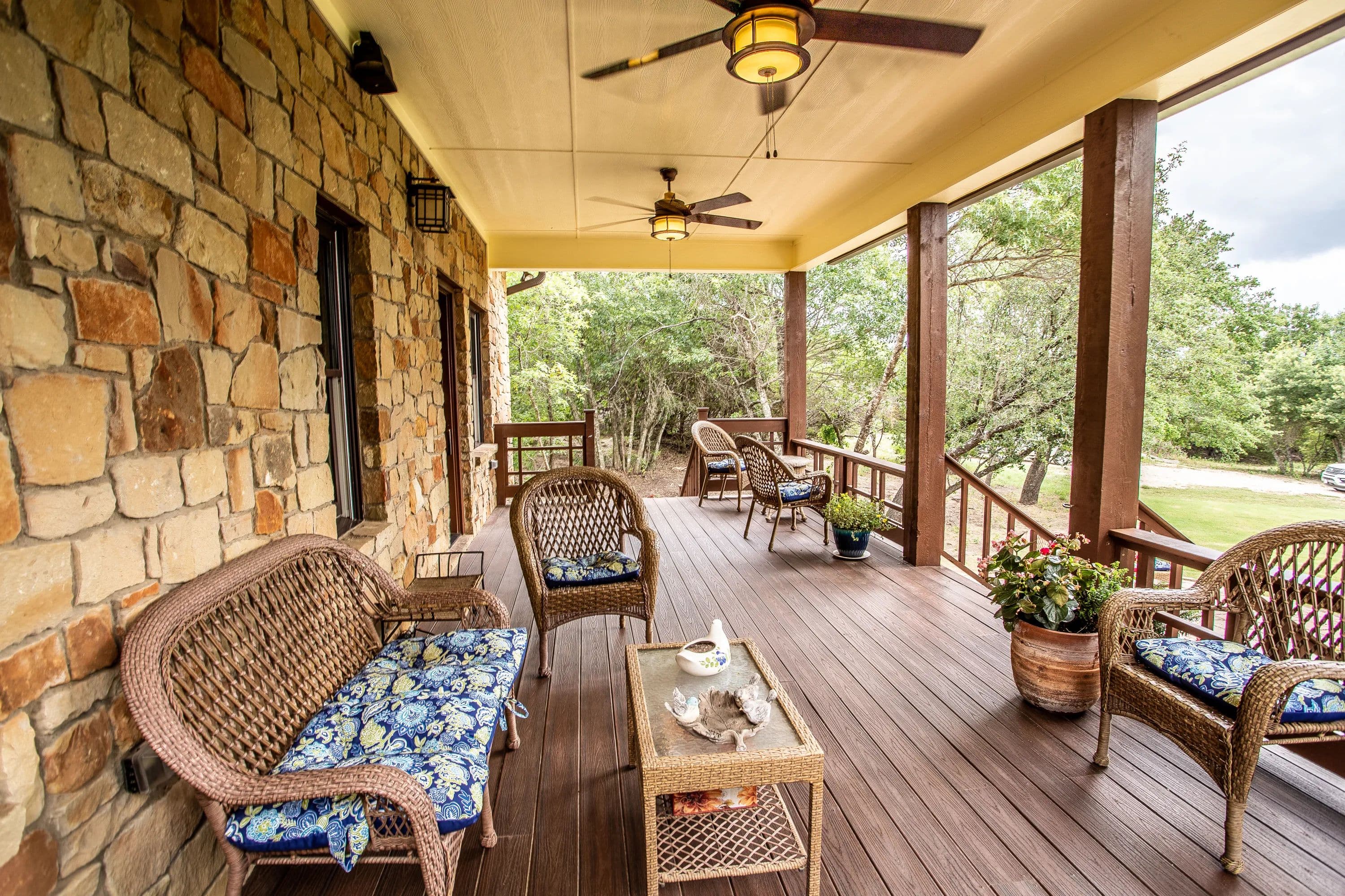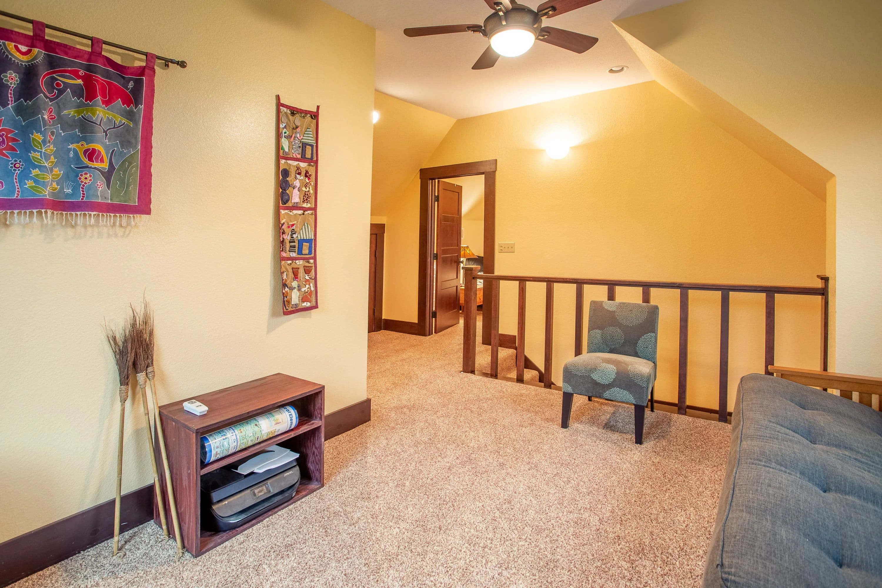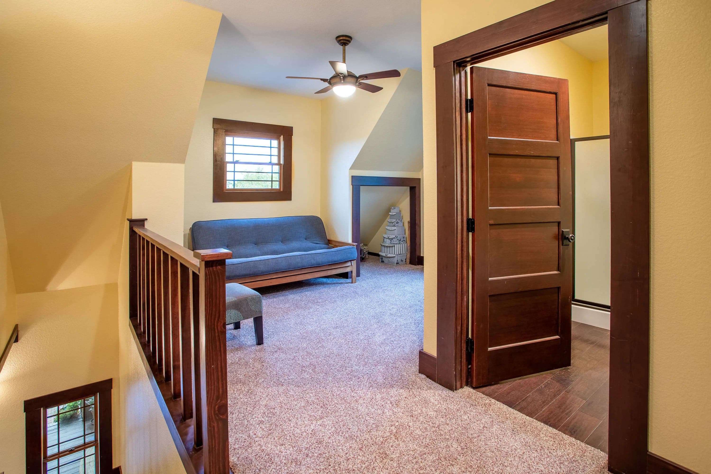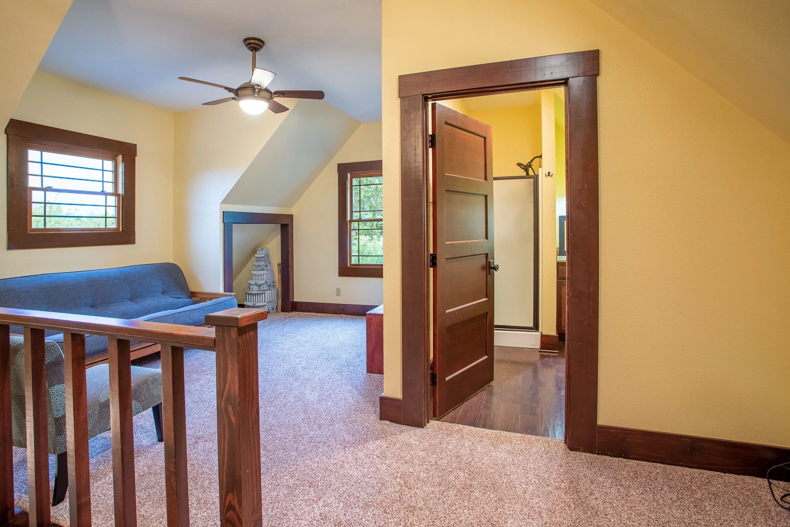 The master suite, along with a full bath and laundry, is conveniently located on the main floor. Upstairs, you'll find a guest bedroom, a second bath, and the loft. Step outside to a covered front porch with ceiling fans--a peaceful retreat for soaking in the scenic surroundings.