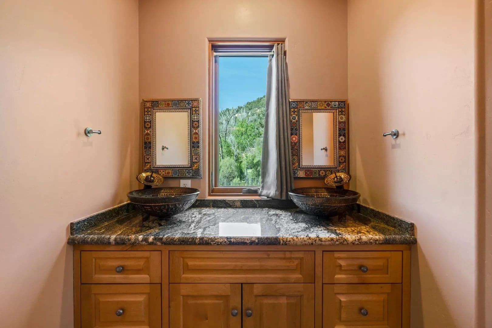 Improvements The main residence is a well maintained single level 2,808 SF southwestern style home with very nice finishes throughout. The home has 3 bedrooms, 2 full bathrooms, a half bathroom and 2-car attached garage. The home features 9′ ceilings with a beautiful Saguaro Rib ceiling detail in between open log beams. The exterior walls are 8″ thick for added insulation. The home has radiant in-floor hot water heat and double pass through wood burning fireplace that will keep you warm and cozy on the cold winter nights. The spacious kitchen features custom Alder cabinets, granite countertops, modern appliances and tile flooring. There is a covered front patio and a large back patio for outdoor entertaining on those nice summer evenings to enjoying the peace and serenity of Cherry Creek Valley. There is a whole property water filtration system and water softener in a separate heated building with workbench and enough room for a small workshop. Also on the property is a 1,000 gallon propane tank. The main residence has redundant heating with a propane boiler and an electric furnace fully installed.