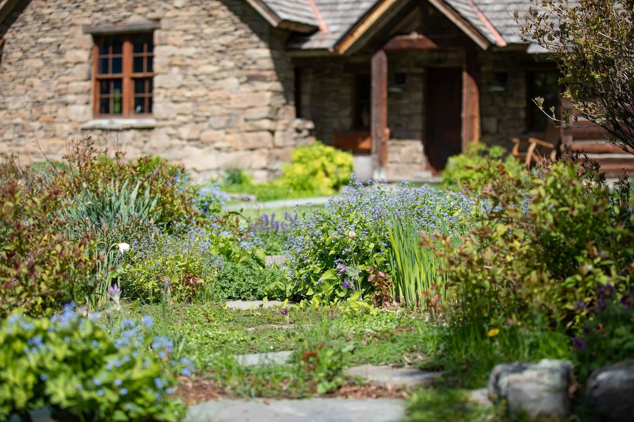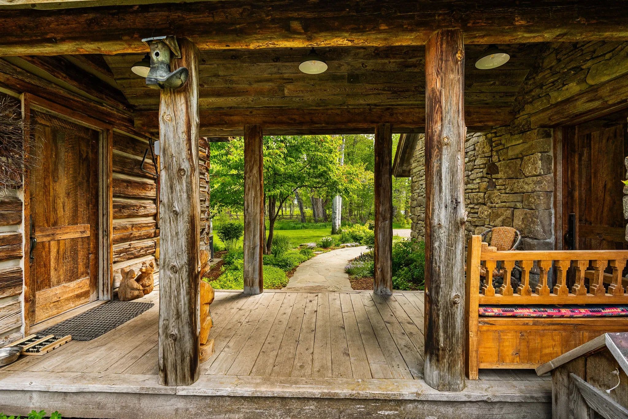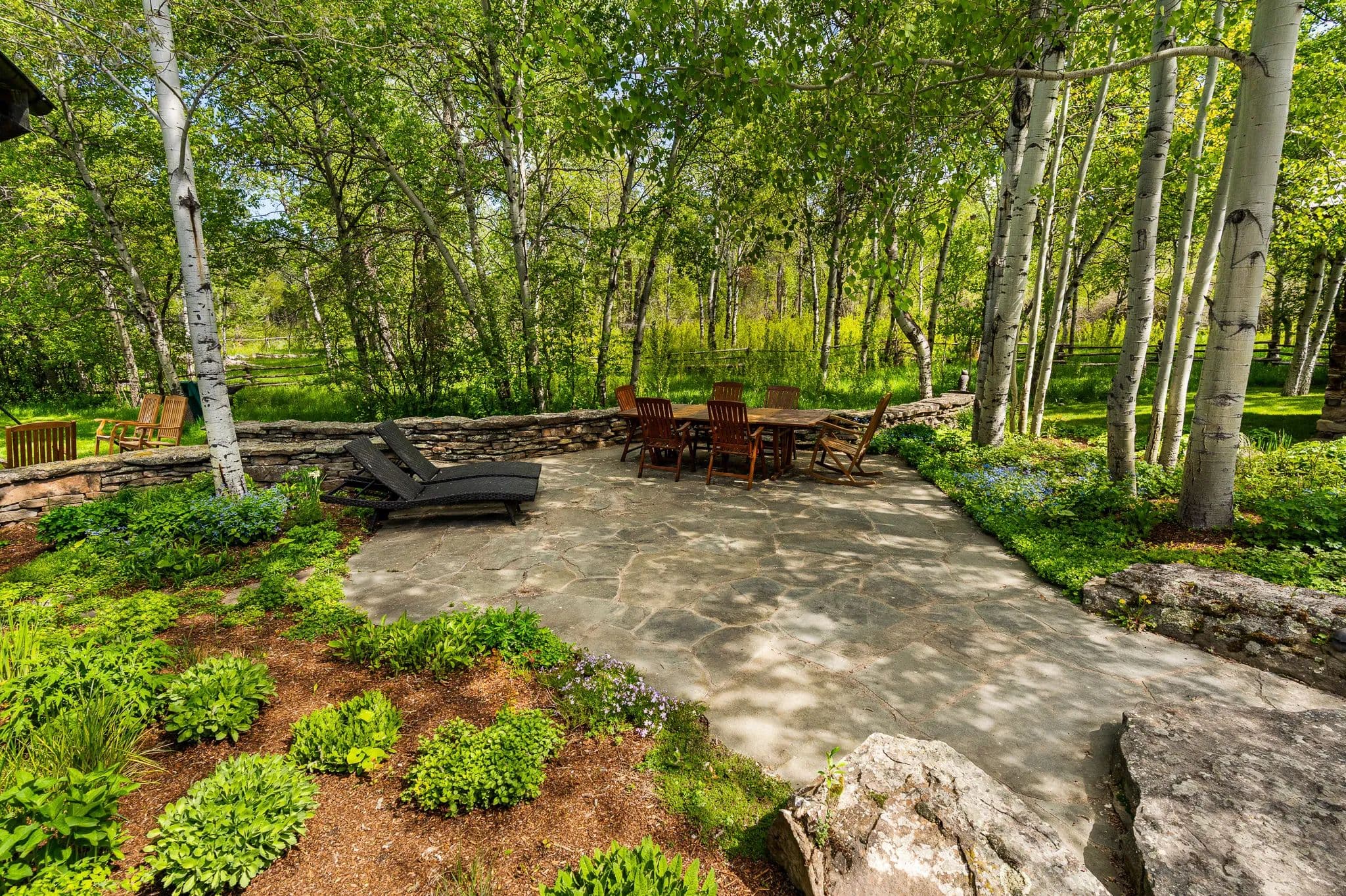 Crafted with natural stone and reclaimed wood, the elegant yet rustic residence merges effortlessly with its riparian surroundings, as if born from the land itself. Towering cottonwoods and aspens envelop the home, creating a private oasis bathed in soft, filtered light. Vibrant, artfully designed gardens bloom in harmony with Montana’s seasons, adding bursts of color to the native landscape.