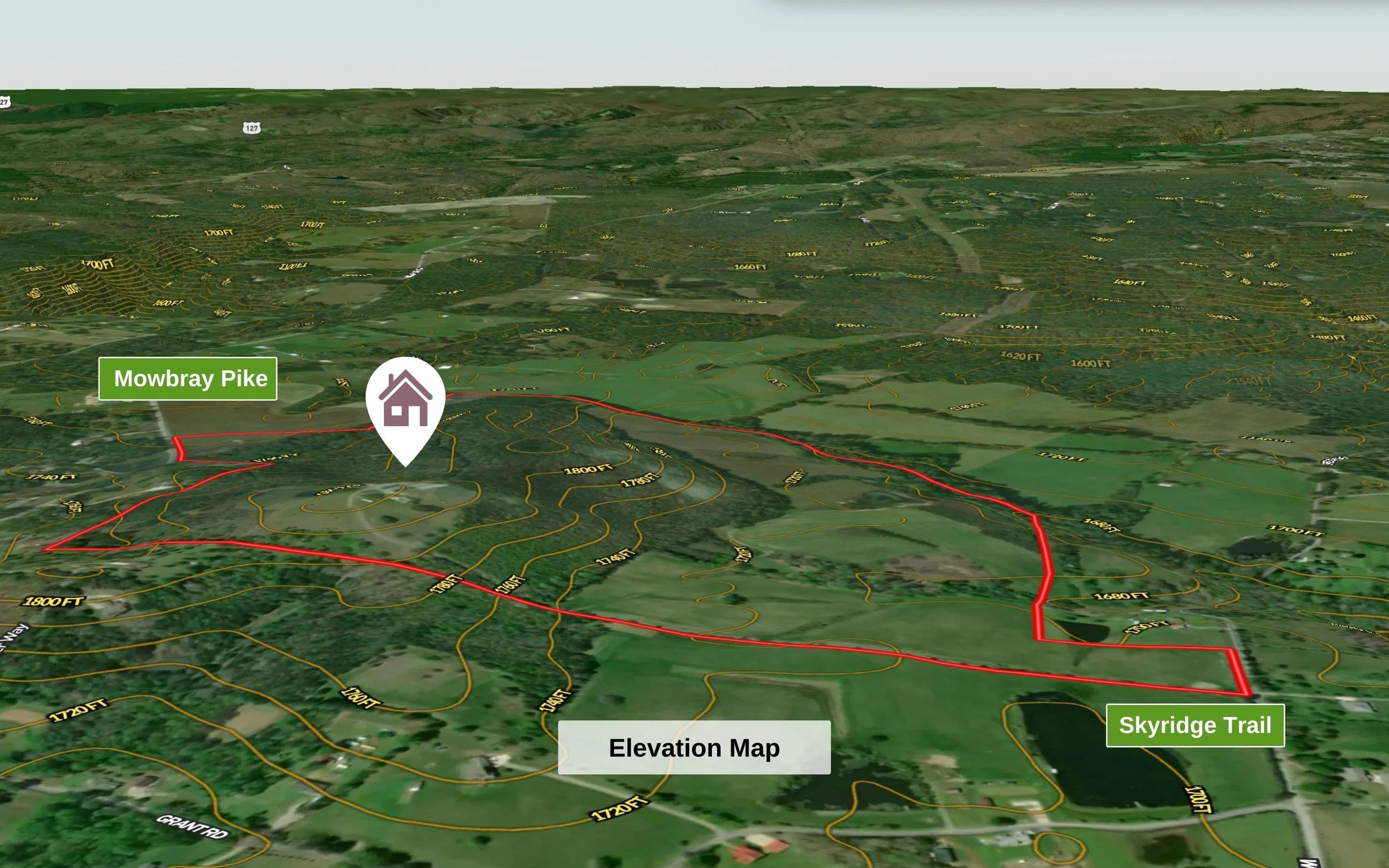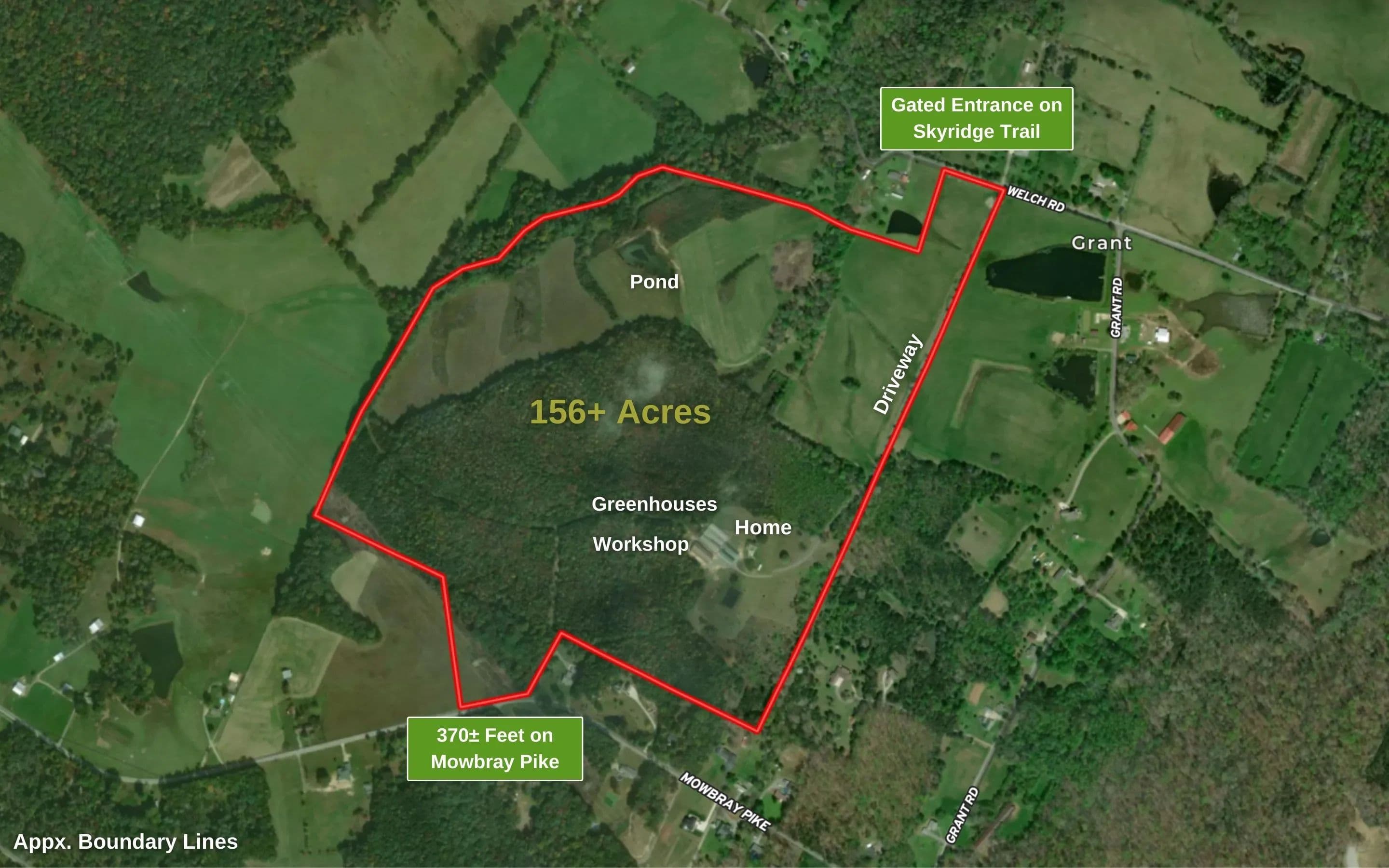 This rare property features a GATED entrance, 4 bedroom HOME, 5 GREENHOUSES, WORKSHOP, and PONDS. Accessed by a private driveway on Skyridge Trail with additional 370+/- feet of frontage on Mowbray Pike. 2-LEVEL barn/workshop with lean-to offers ample room for equipment storage.