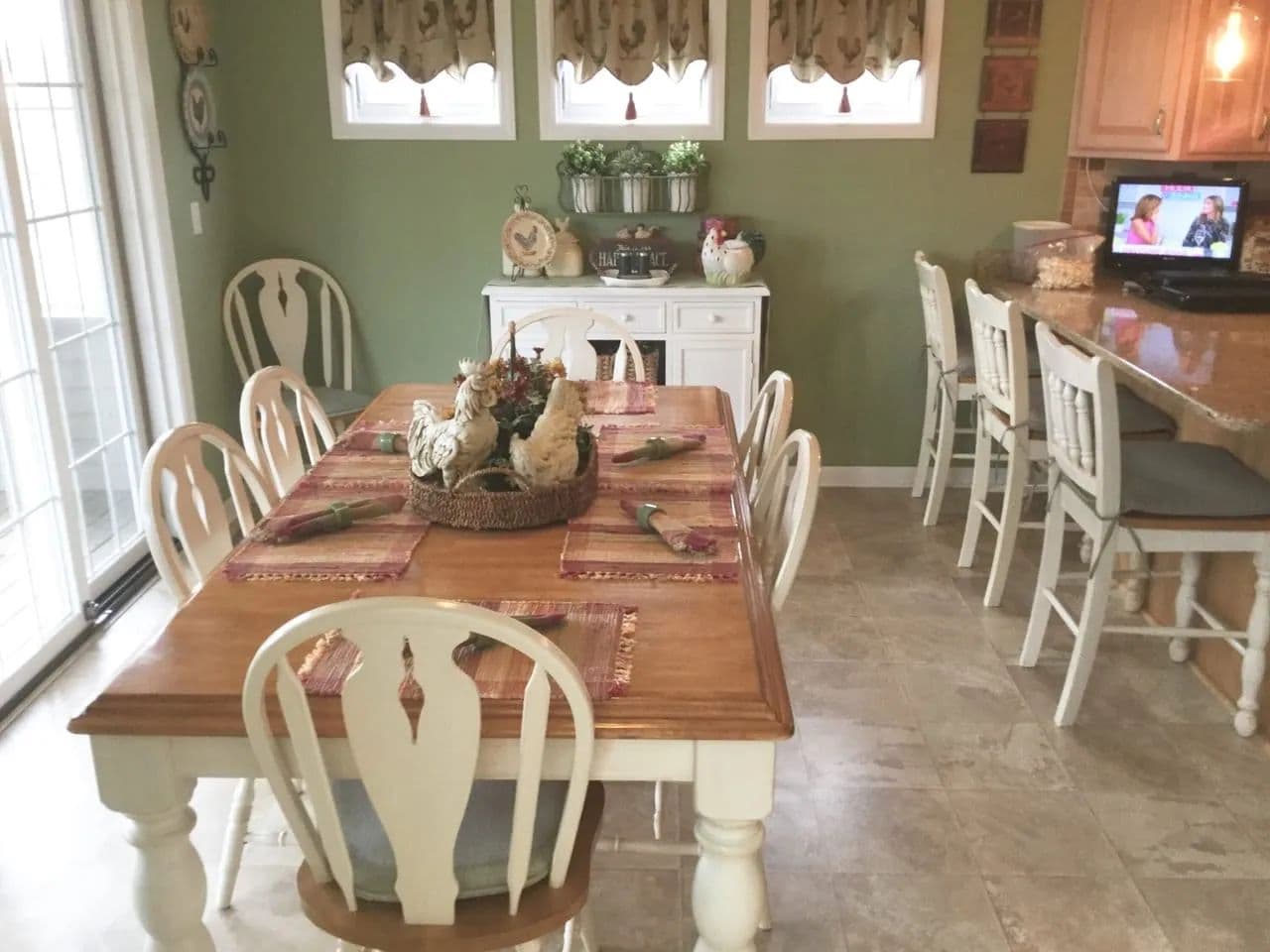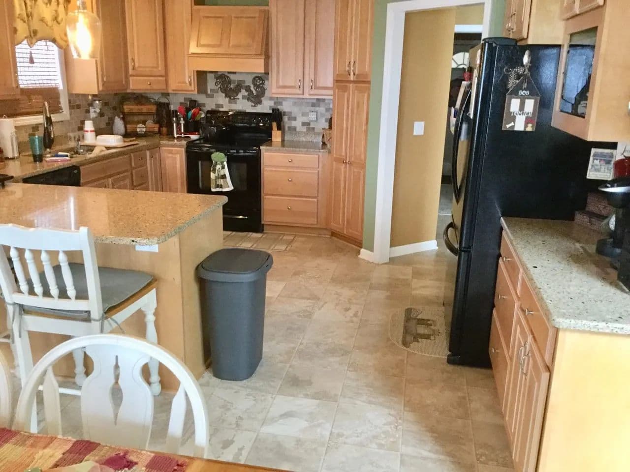Open kitchen with bar seating + breakfast nook; sliders to the screened porch