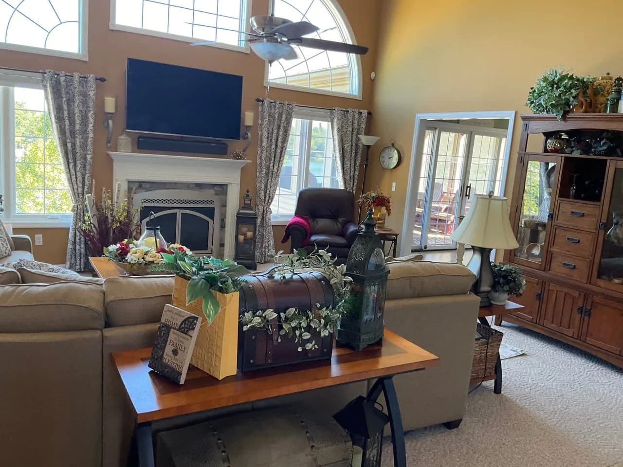 14’ vaulted living room with floor-to-ceiling lake windows & central fireplace