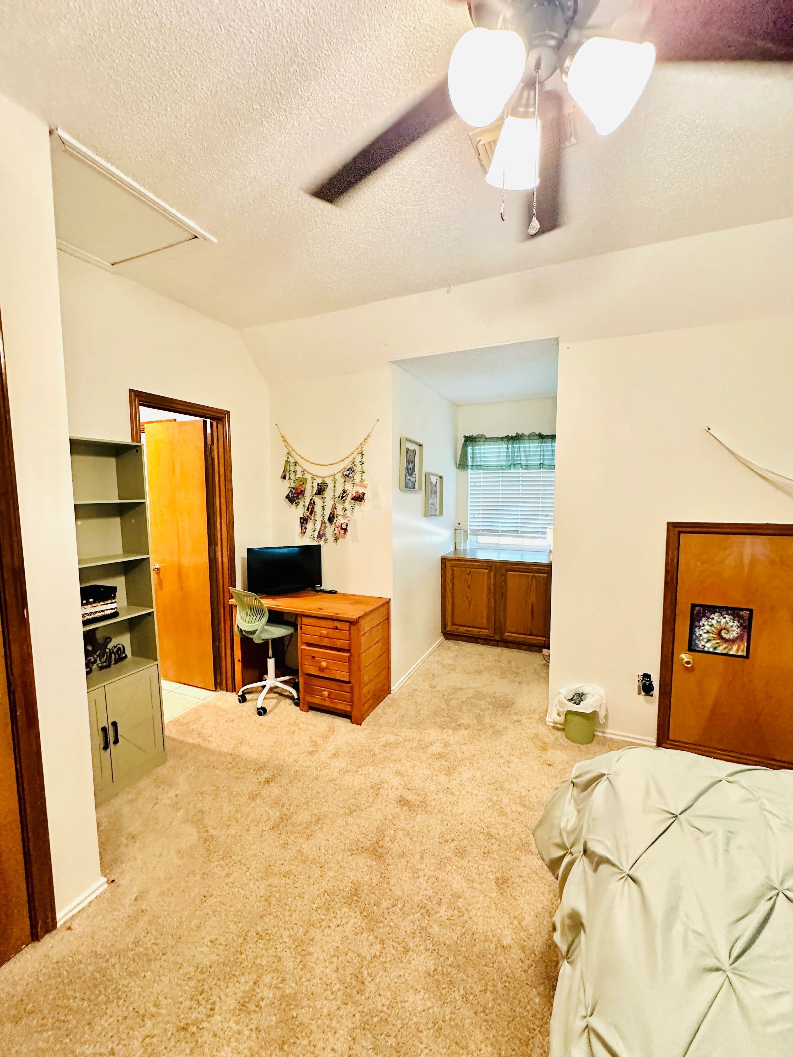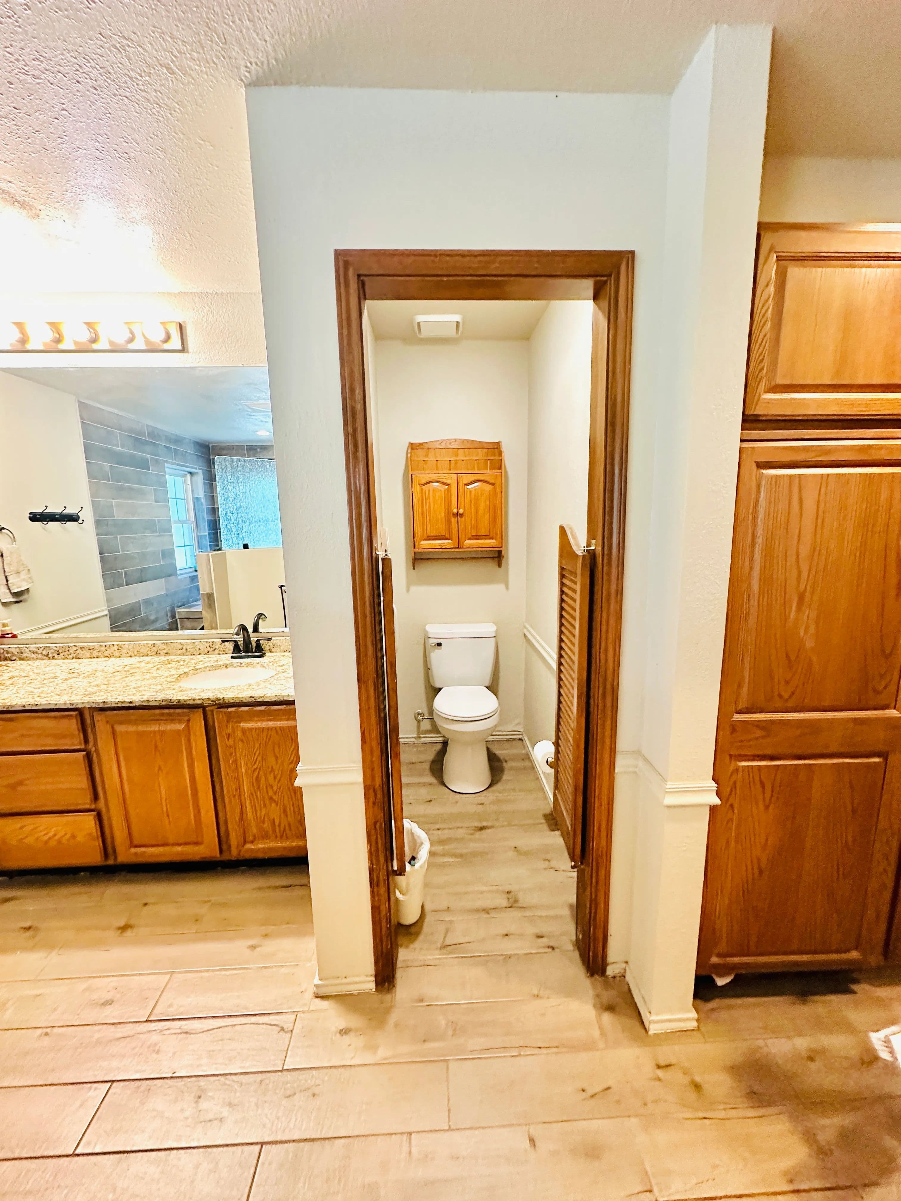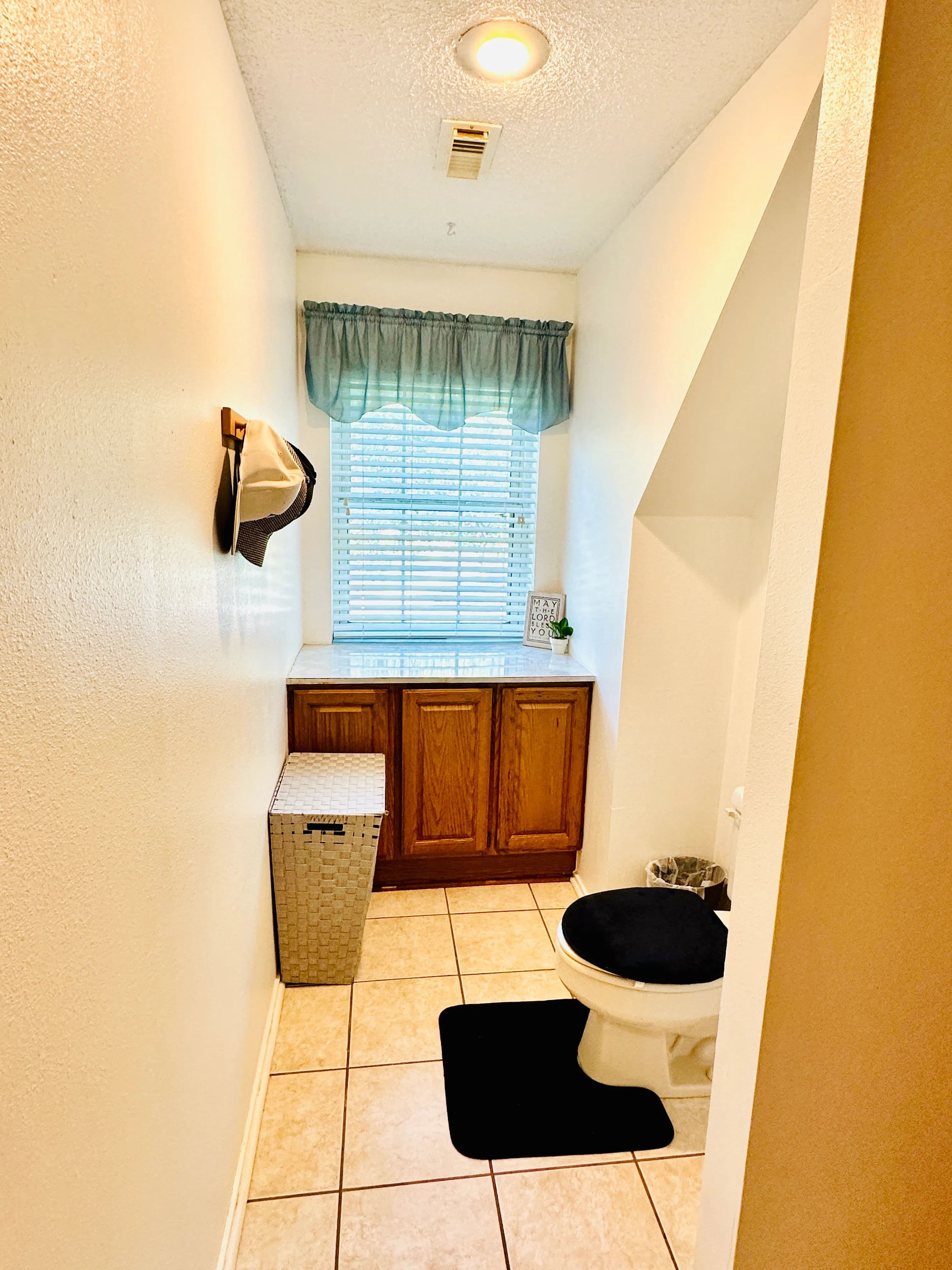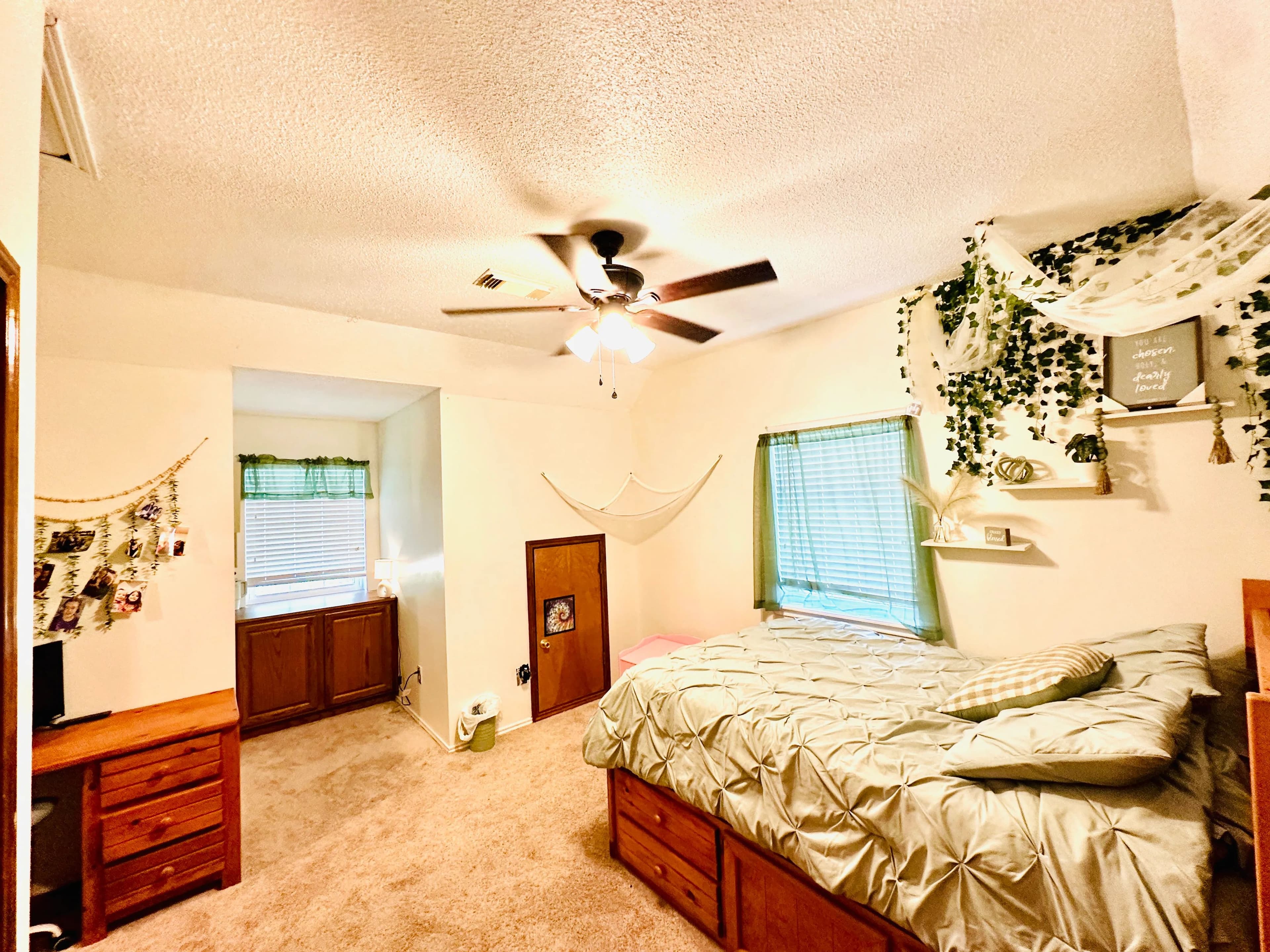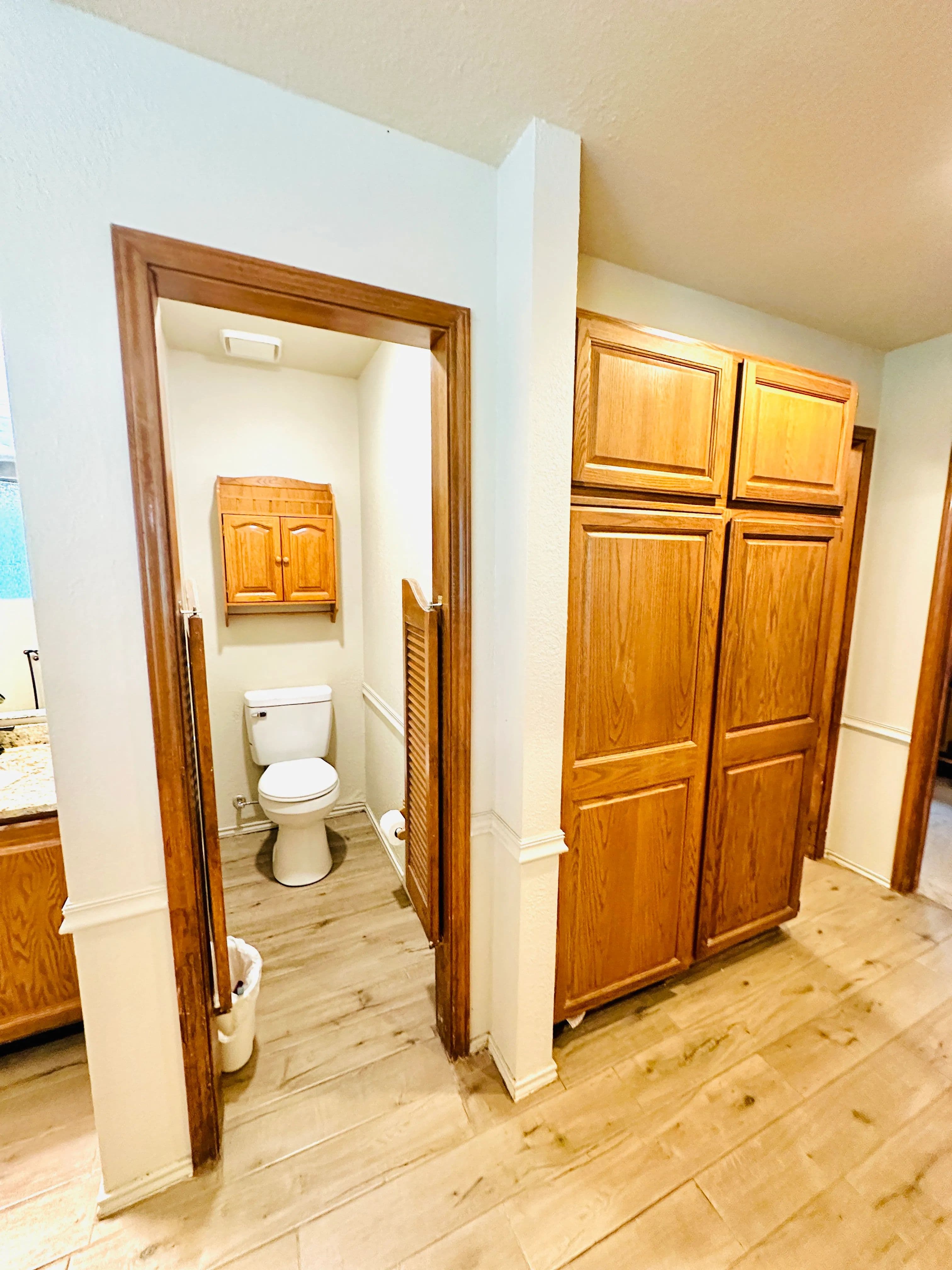 The primary bedroom is on the 1st level and has carpet, but the ensuite bath has ceramic wood-look tile with a walk-in shower. The bathroom has solid oak cabinets including linen storage, dual sinks and a water closet with saloon style doors. There is another bedroom on the first floor as well as a half bath and laundry room. Upstairs has 2 bedrooms with seating and storage in the dormers and a Jack & Jill bathroom with separate vanities for each bedroom.