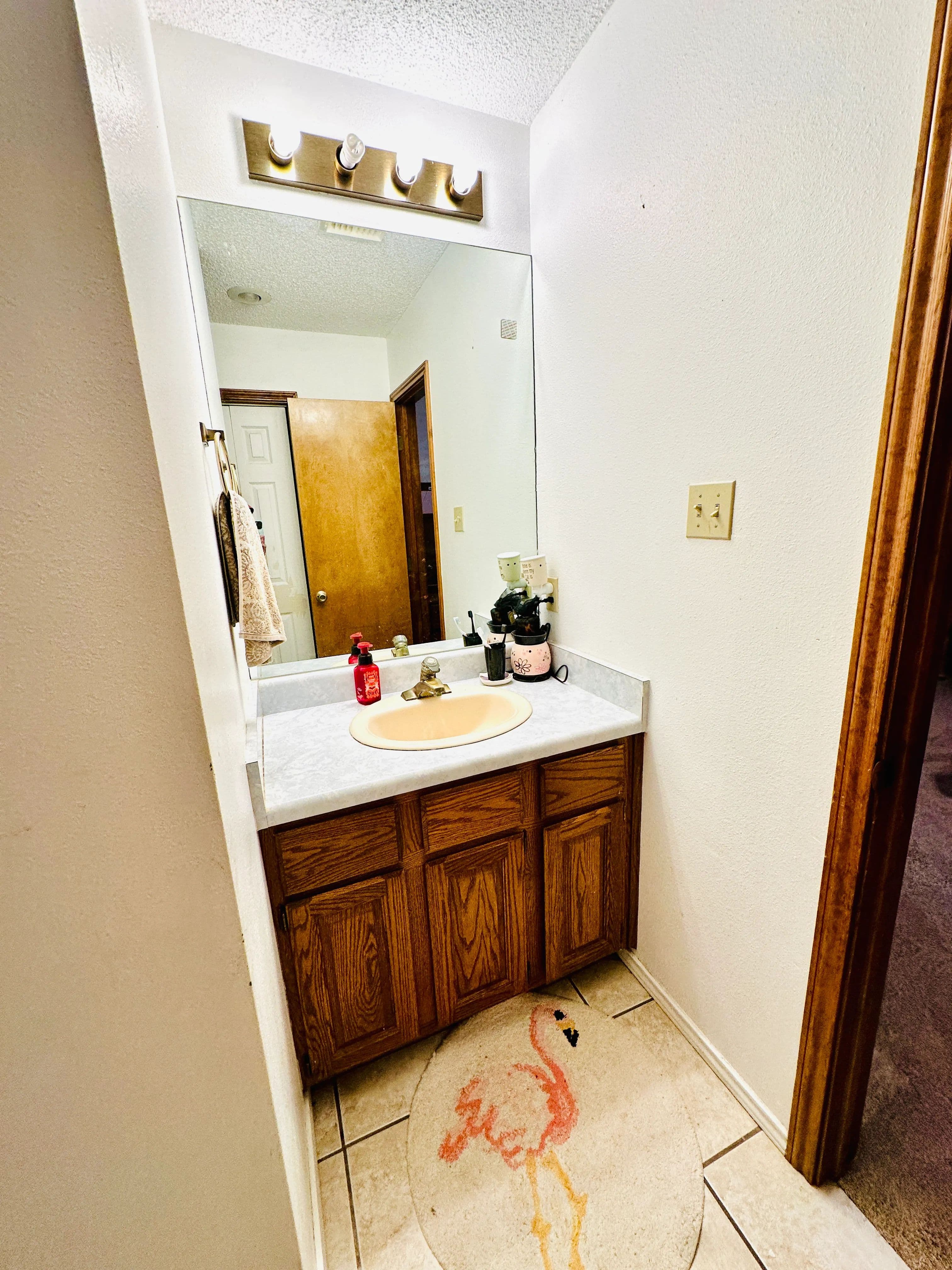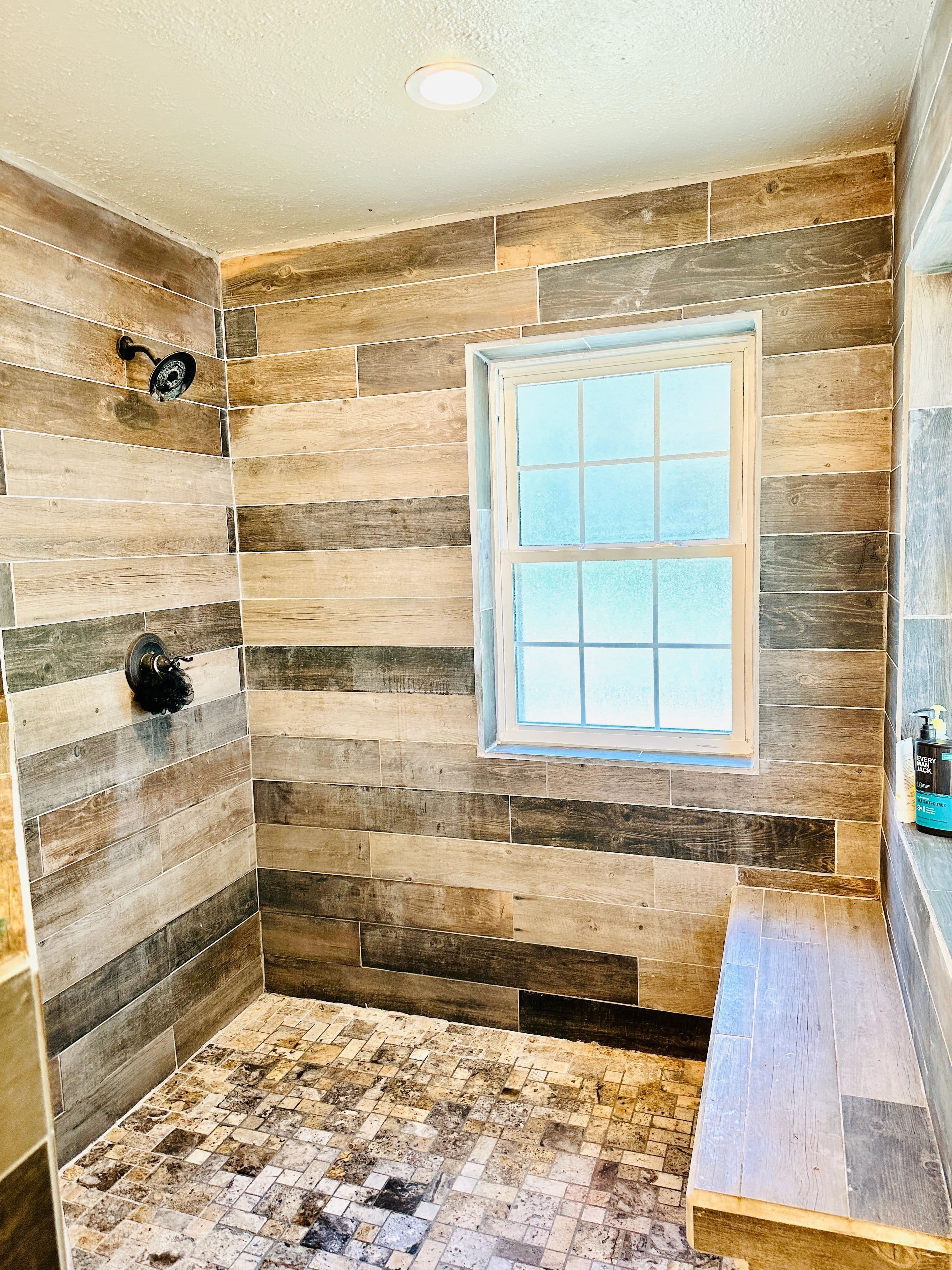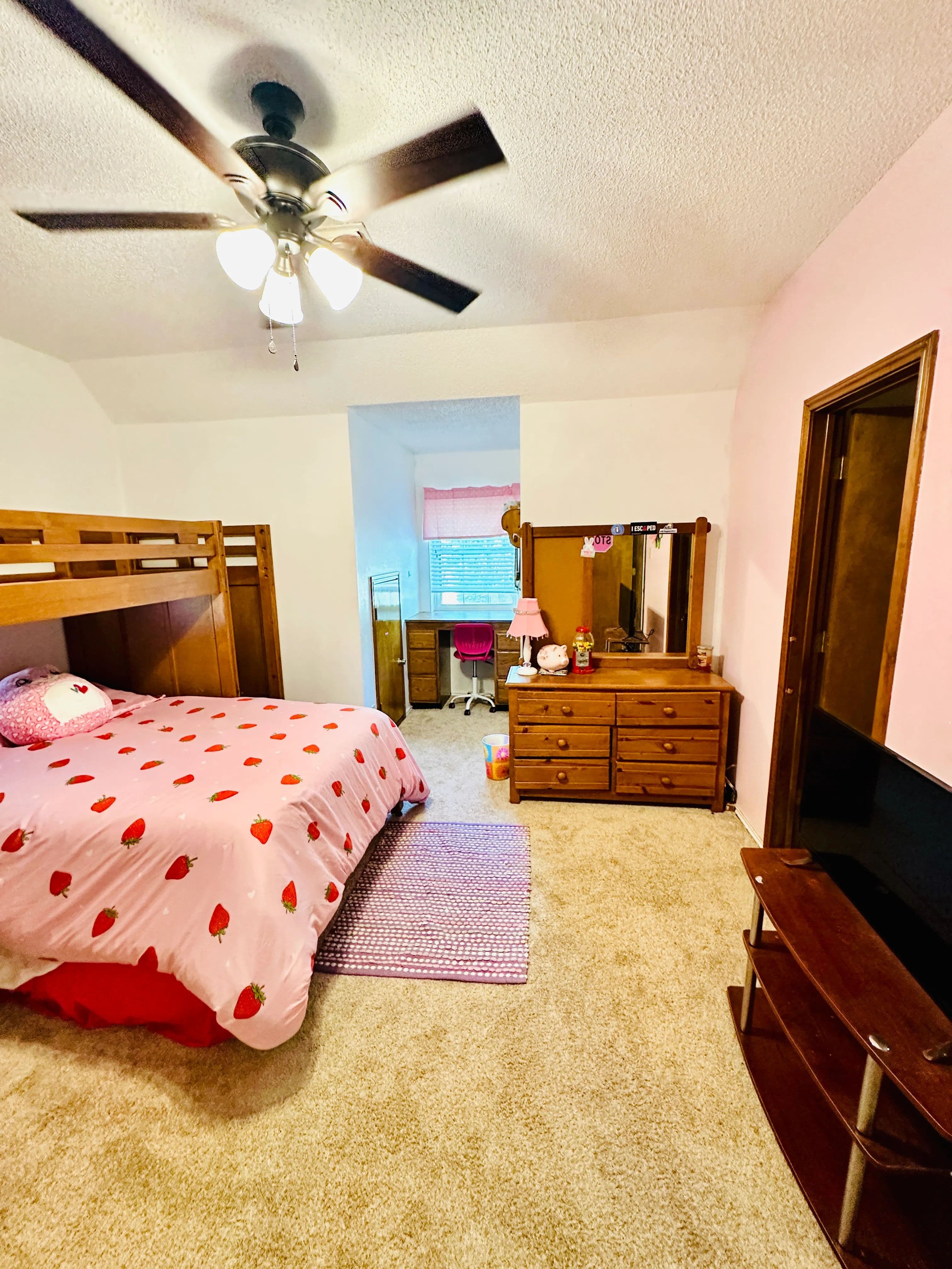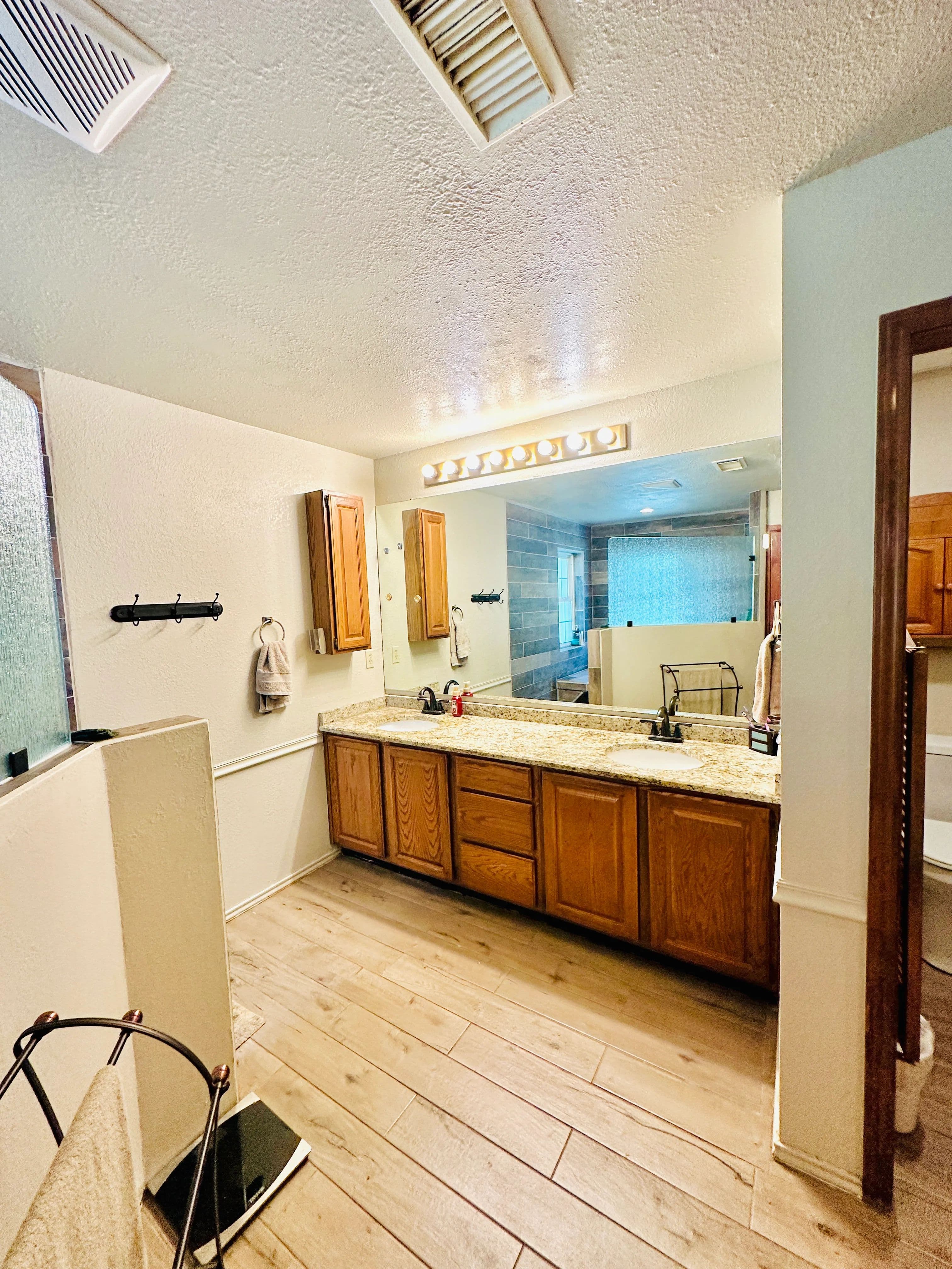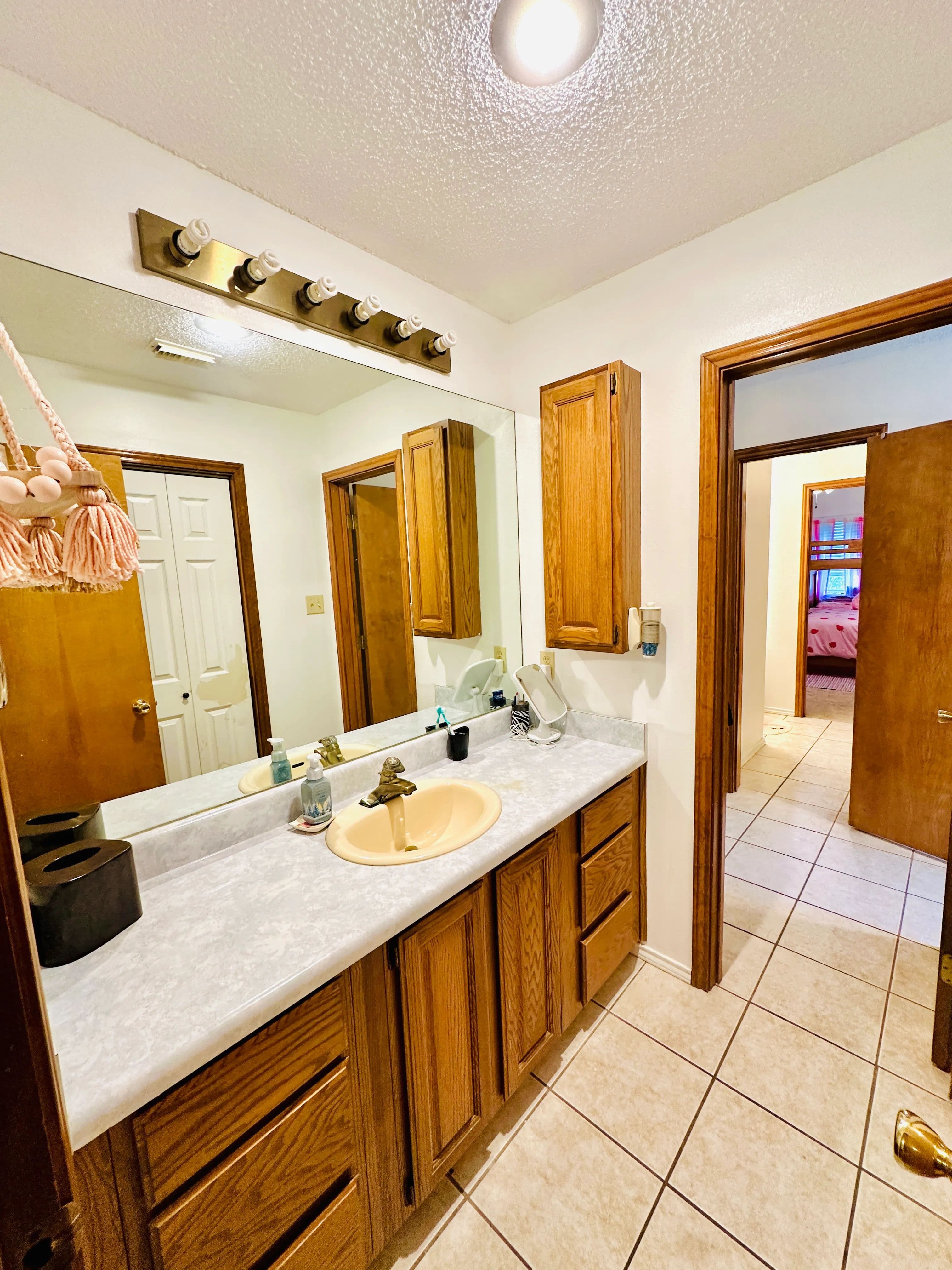 The primary bedroom is on the 1st level and has carpet, but the ensuite bath has ceramic wood-look tile with a walk-in shower. The bathroom has solid oak cabinets including linen storage, dual sinks and a water closet with saloon style doors. There is another bedroom on the first floor as well as a half bath and laundry room. Upstairs has 2 bedrooms with seating and storage in the dormers and a Jack & Jill bathroom with separate vanities for each bedroom.