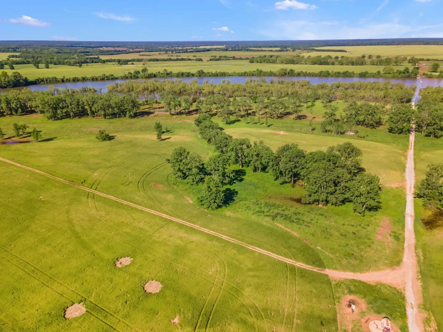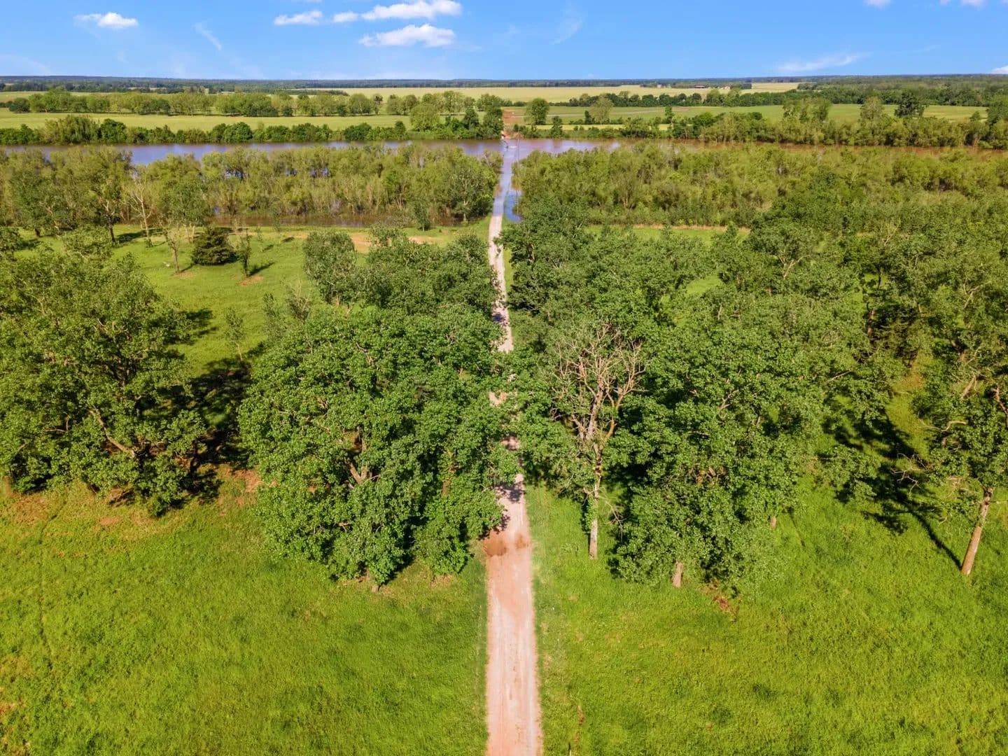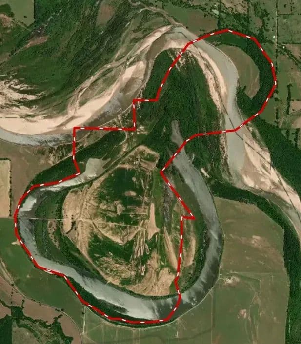 Duck Island is a 1,586 acre hunting and fishing oasis surrounded by the Red River to the north and a 390 acre private lake to the south. A gated entrance grants access to the only road in to this sportsman's paradise with a huge private lake, open fields, dense woods and scattered trees that lure every species of wildlife in north Texas and southern Oklahoma. Land The island was created when the Red River changed course from a south sweeping oxbow to a more direct path to the east. The result was an island that spans the Texas and Oklahoma border completely cut off from all sides. The channel carved out by the river became an expansive 390 acre crescent shaped lake with steep banks to the south and shallow banks on the island’s shore. A road was built across the lake, 700 acres of the island was cleared and a pivot irrigation sprinkler installed using water from the lake to irrigate the fertile alluvial soils. The remaining 850 acres varies from riparian habitat to scattered trees and dense woods.