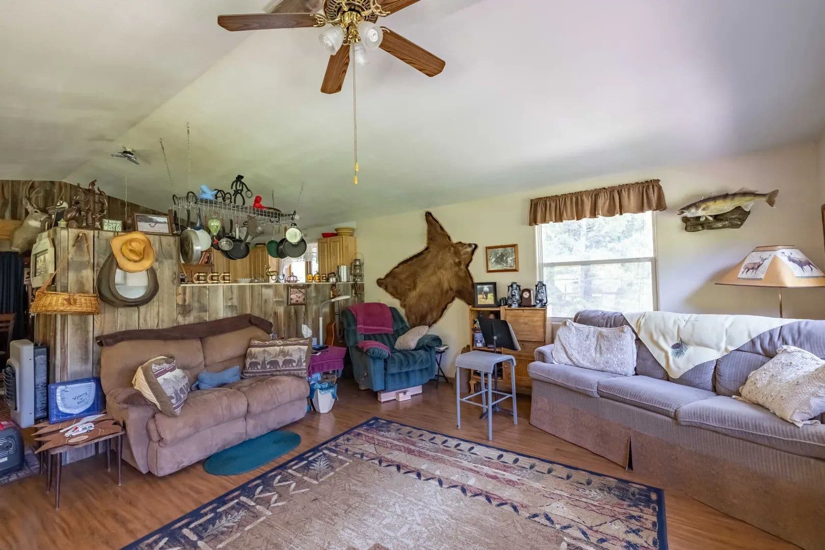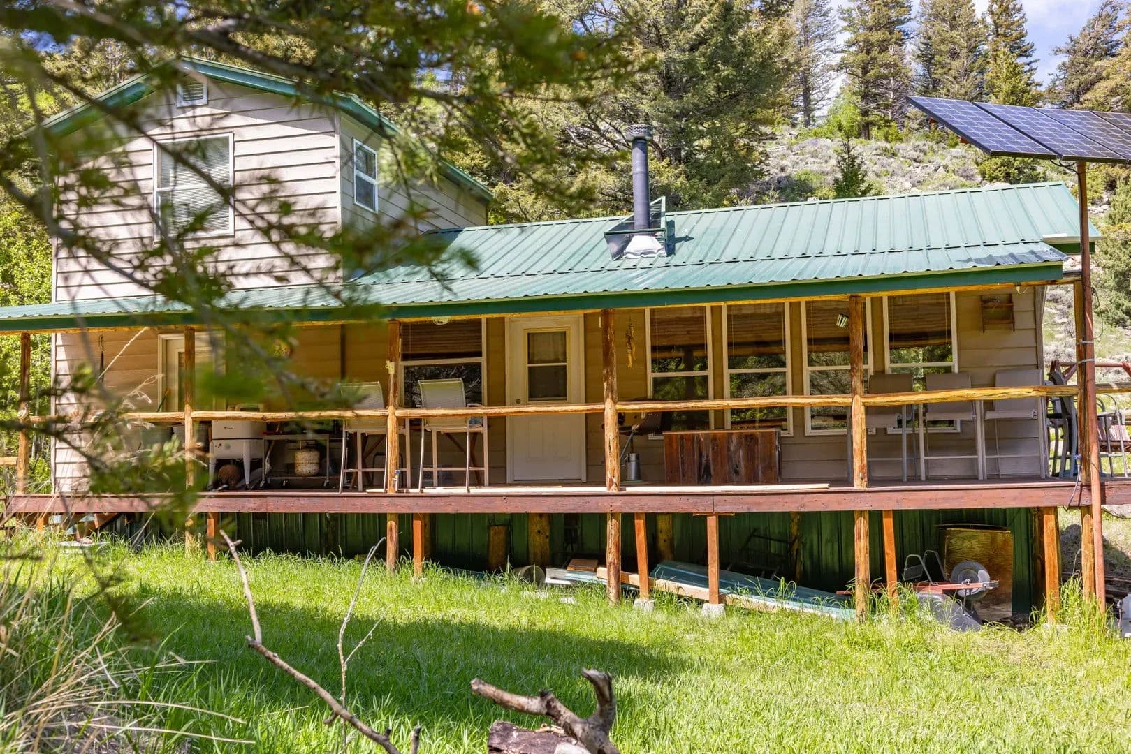 Improvements The 1,120 square foot cabin features two bedrooms and two bathrooms, powered by solar with a private well. The open concept living area with vaulted ceilings and large windows bring in natural light and showcase the surrounding forest. The kitchen includes plenty of counter space, room for dining, and flows into the cozy living room centered around a wood stove. A wraparound covered deck offers the perfect place to watch wildlife or keep an eye on family fishing in the nearby ponds. Heat is provided by wood or propane. The property also includes a 10×12 bunkhouse with a front deck, a 10×20 storage shed, and a well-built outdoor cooking area with its own large rock counter, ideal for campfire meals and family gatherings.