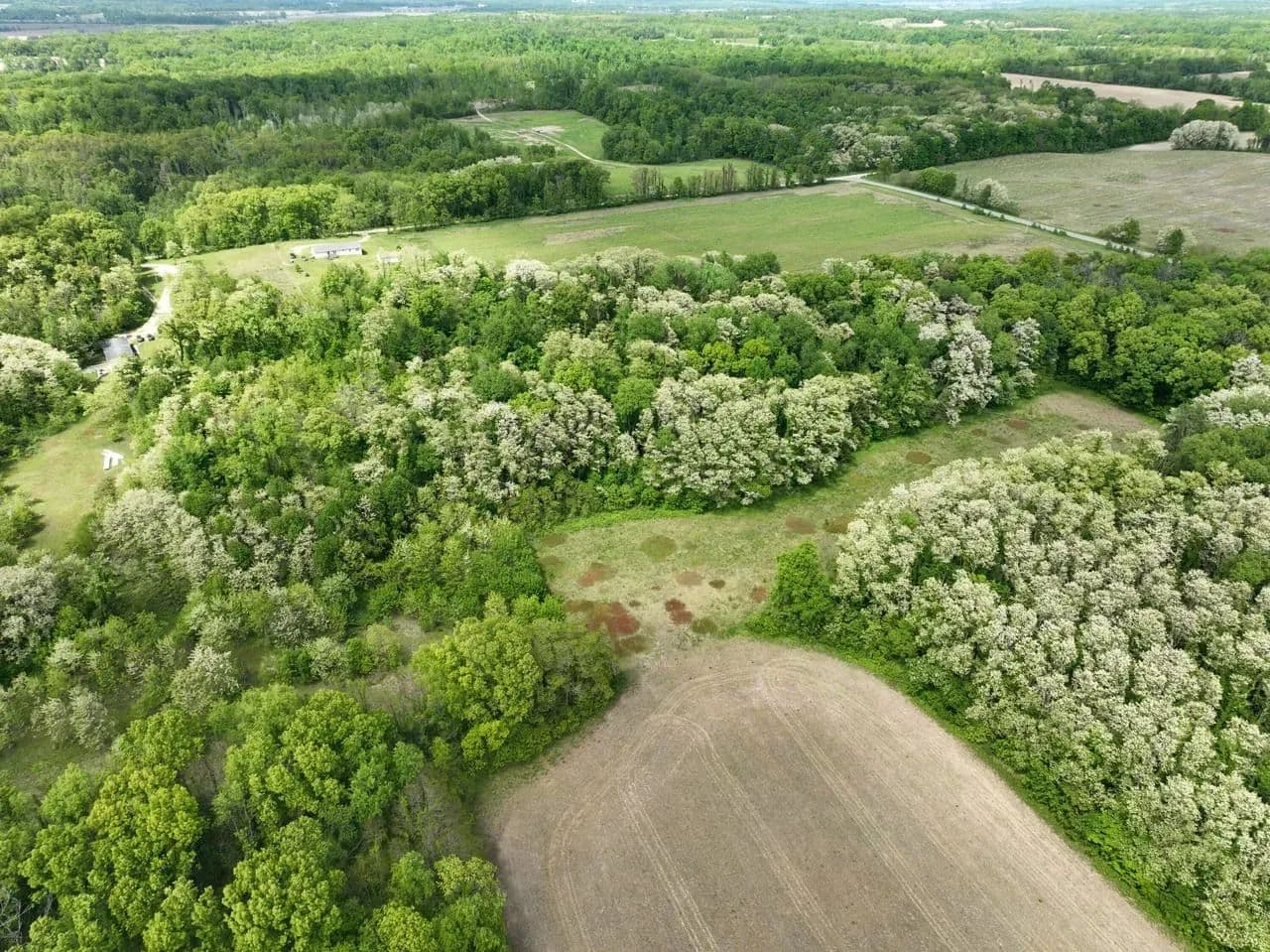 Currently enrolled in a CRP program. The front field (approximately 6.5+/- acres) consist of grasses, flat and dry land. The middle of the property consist of a wooded ridge (approximately 8.5+/- acres). Then a soft sloping down hill to a hidden field (approximately 3+/- acres)
