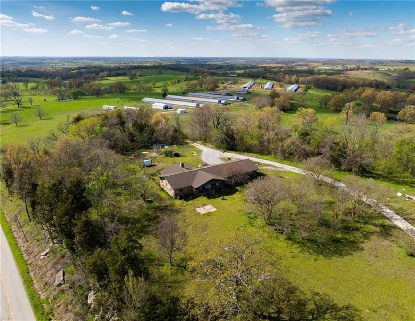 This 34.26-acre property at 14960 Denver Road in Omaha, Arkansas, offers panoramic 360° views of the rolling Ozark Mountains and a rare combination of privacy, potential, and location. Just 20–25 minutes from Branson, Missouri, and only 15 minutes to Harrison, Arkansas, it provides the convenience of nearby amenities with the serenity of rural living. The main home, built in 1965, features 3 bedrooms and 2 full bathrooms across 2,130 heated square feet. While the home is ready for remodeling, it offers a solid foundation for creating a personalized retreat. Several older mobile homes are also located on the property, offering opportunities for guest accommodations, multi-generational living, or rental income. Additional improvements include poultry barns-currently inactive but usable for agricultural purposes or storage-a large barn, guest house, metal shop, well house, and multiple outbuildings, totaling approximately 9,000 square feet of detached structures. A standout feature is the former rock quarry, now transformed into a peaceful fishing pond with stunning views, perfect for outdoor enjoyment. The land is a mix of cleared, level, and rolling terrain, with characteristics suited for a hobby farm, homestead, or investment project. Utilities include DSL, electric, propane gas, satellite, septic, public water (available and connected), and a private well. With its natural beauty, flexible use options, and strategic location near major routes, this property offers exceptional potential in a desirable corner of the Ozarks.