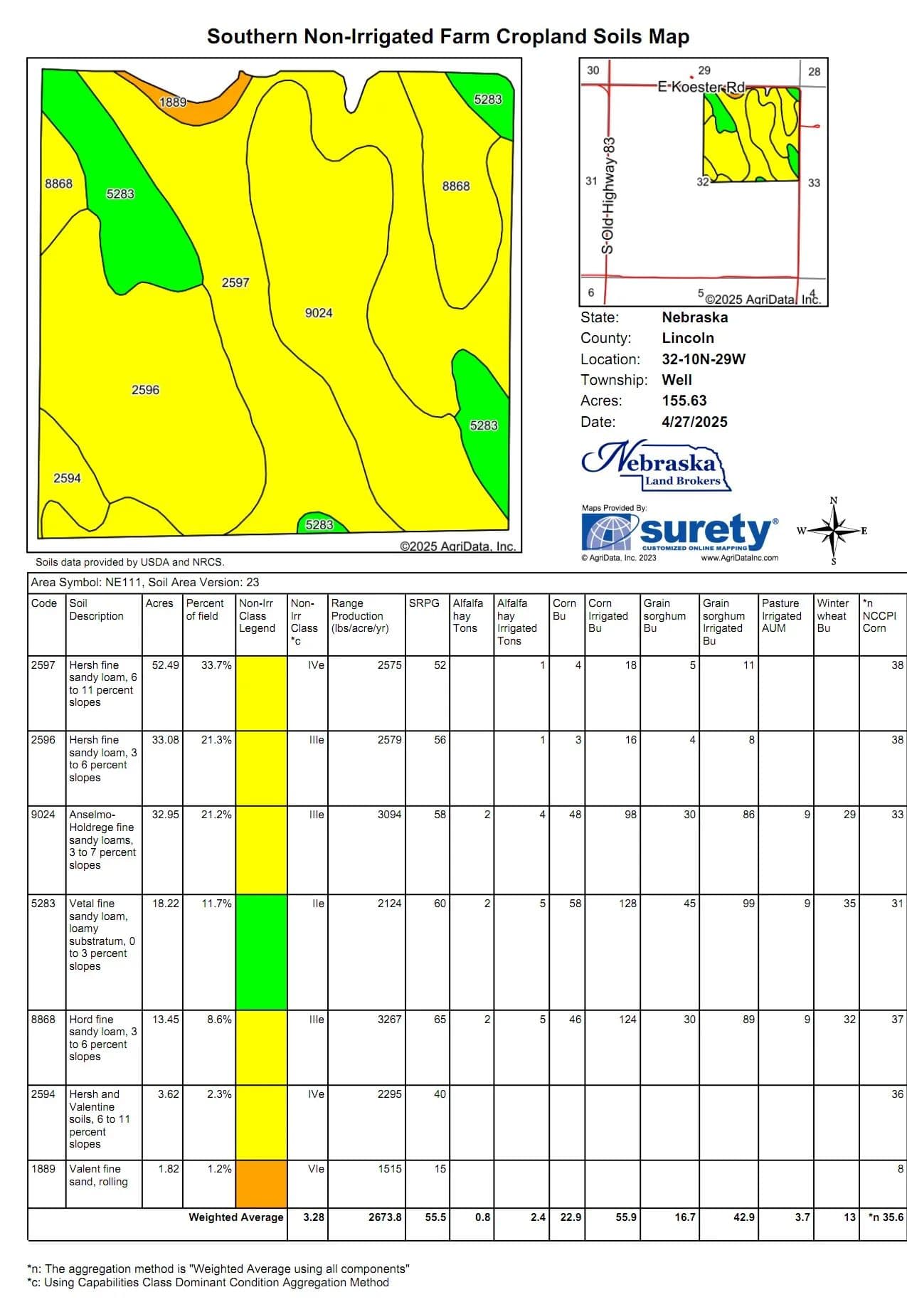 CROPLAND SOILS: 11.7% Class II Vetal fine sandy loam with 0 – 3% slopes, 51.1% Class III Hersh, Anselmo and Hord fine sandy loams with 3-7% slopes and 33.7% Class IV Hersh fine sandy loams with 6 - 11% slopes.