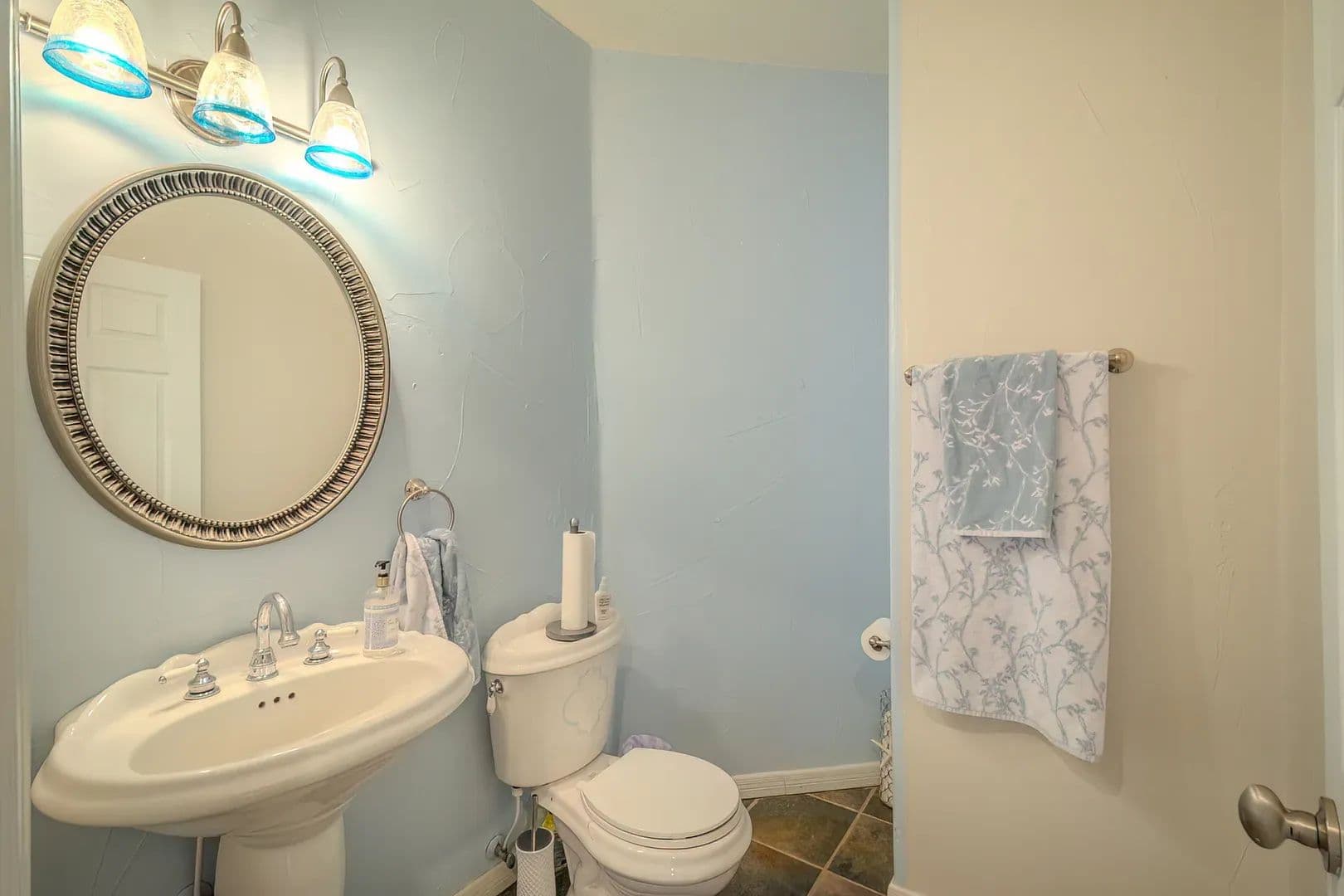 The main-level primary suite offers a private retreat with its own wood-burning fireplace and direct outdoor access. Three additional bedrooms provide flexibility for family, guests, or workspace, while two full bathrooms and a guest powder room are stylish and well-appointed.