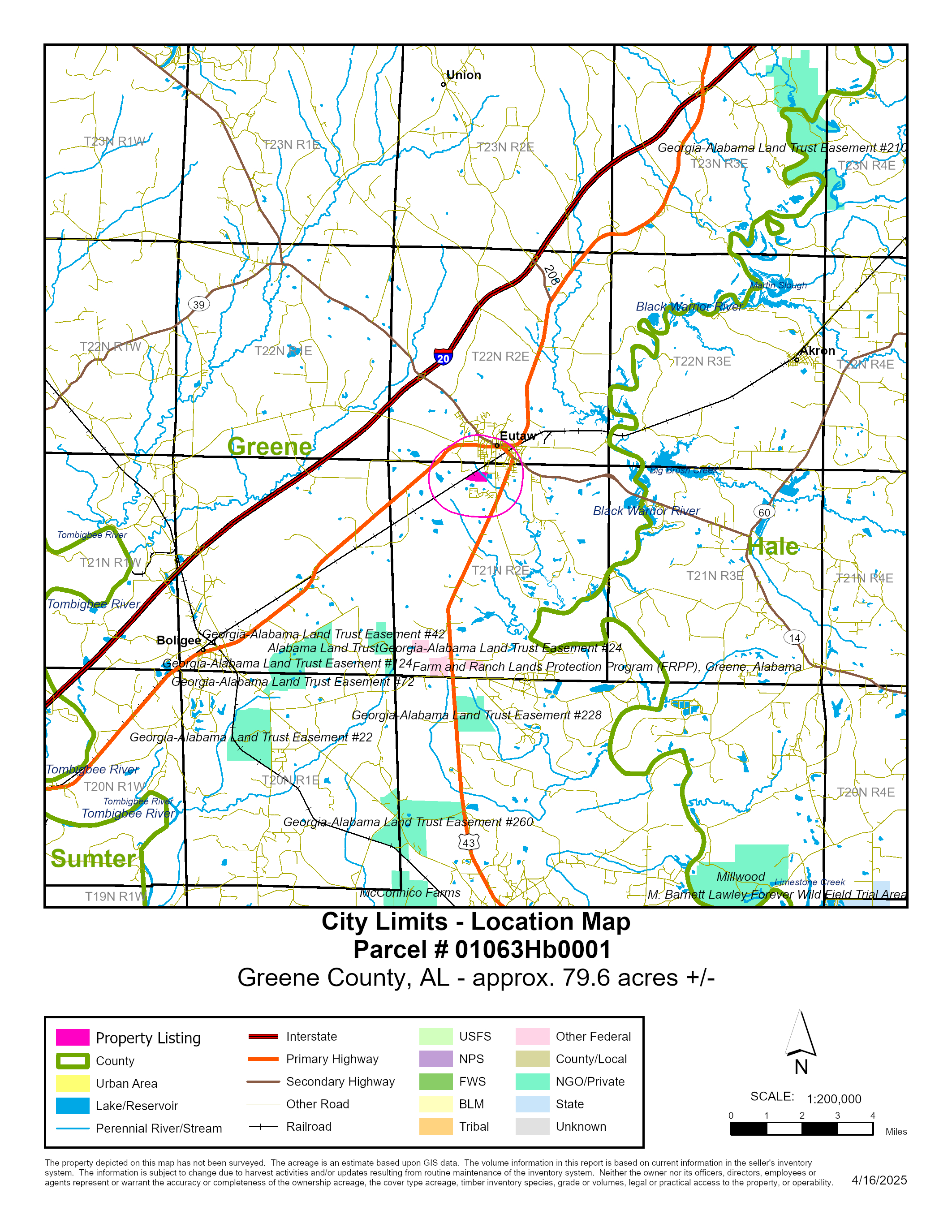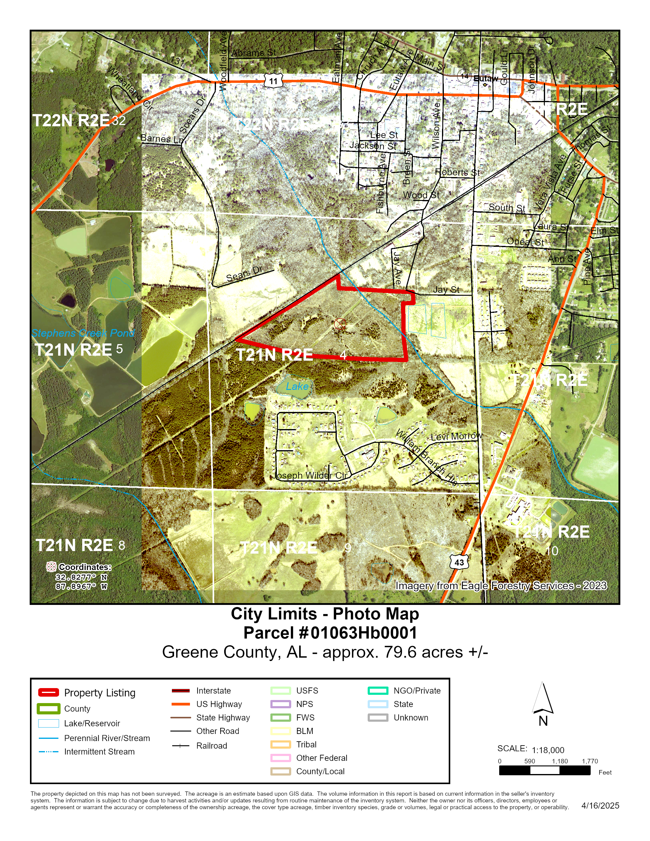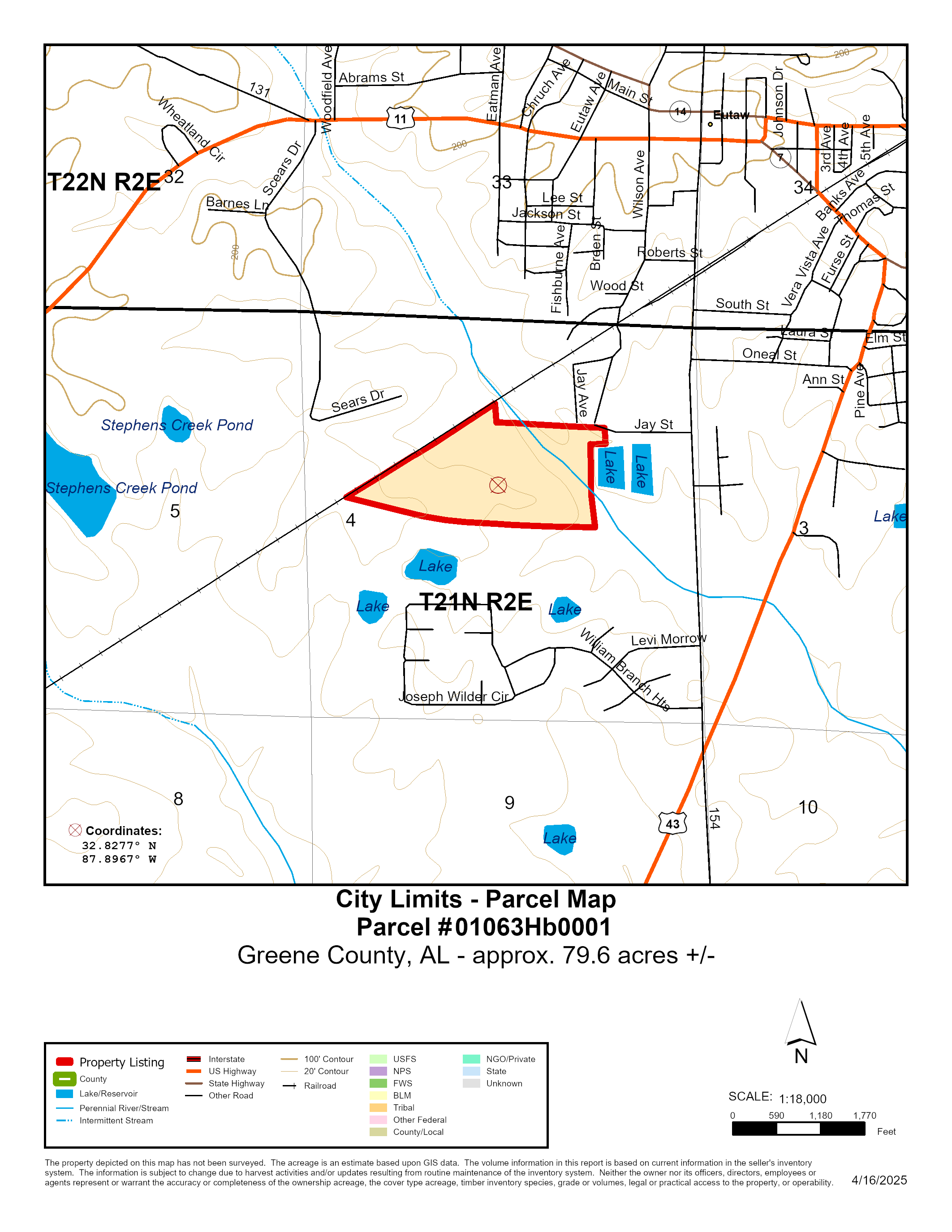79.6 ± acres in Greene County, AL, located inside the city limits and just 1 mile from Eutaw with paved access via Jay Street. This versatile tract sits 4 miles from Exit 40 on I-59/20 and only 24 ± miles from Demopolis, AL. The property features 48 ± acres of pine plantation established in 2021, with the remaining acreage in mature pine and hardwoods. Ideal for timber investment, hunting, and recreation, it includes established wildlife food plots and a power line right-of-way running diagonally through the tract. ATV trails and the right-of-way provide internal access. White Creek also runs diagonally across the property, enhancing its appeal for wildlife and habitat diversity. The tract is bordered by the Norfolk Southern rail way along the northwest boundary.