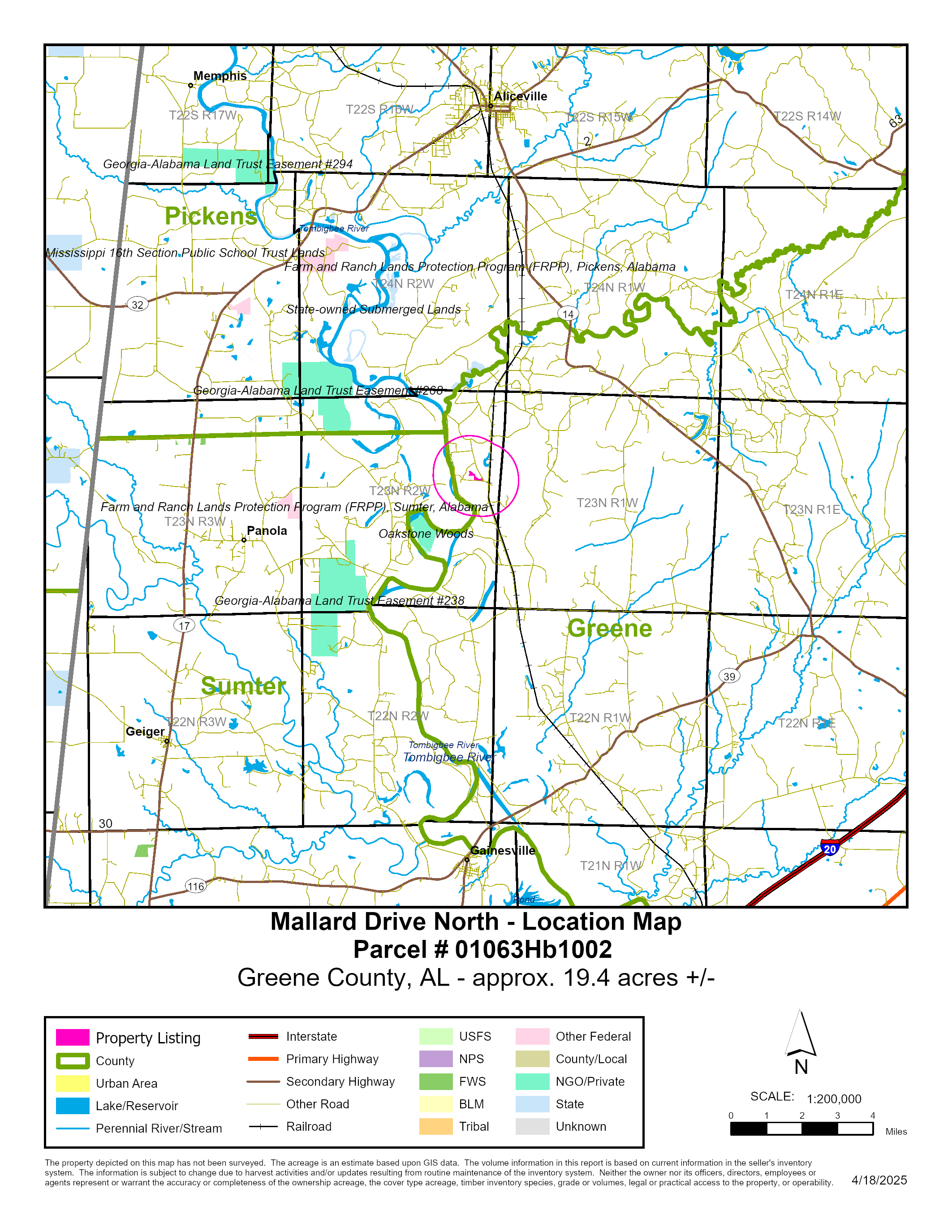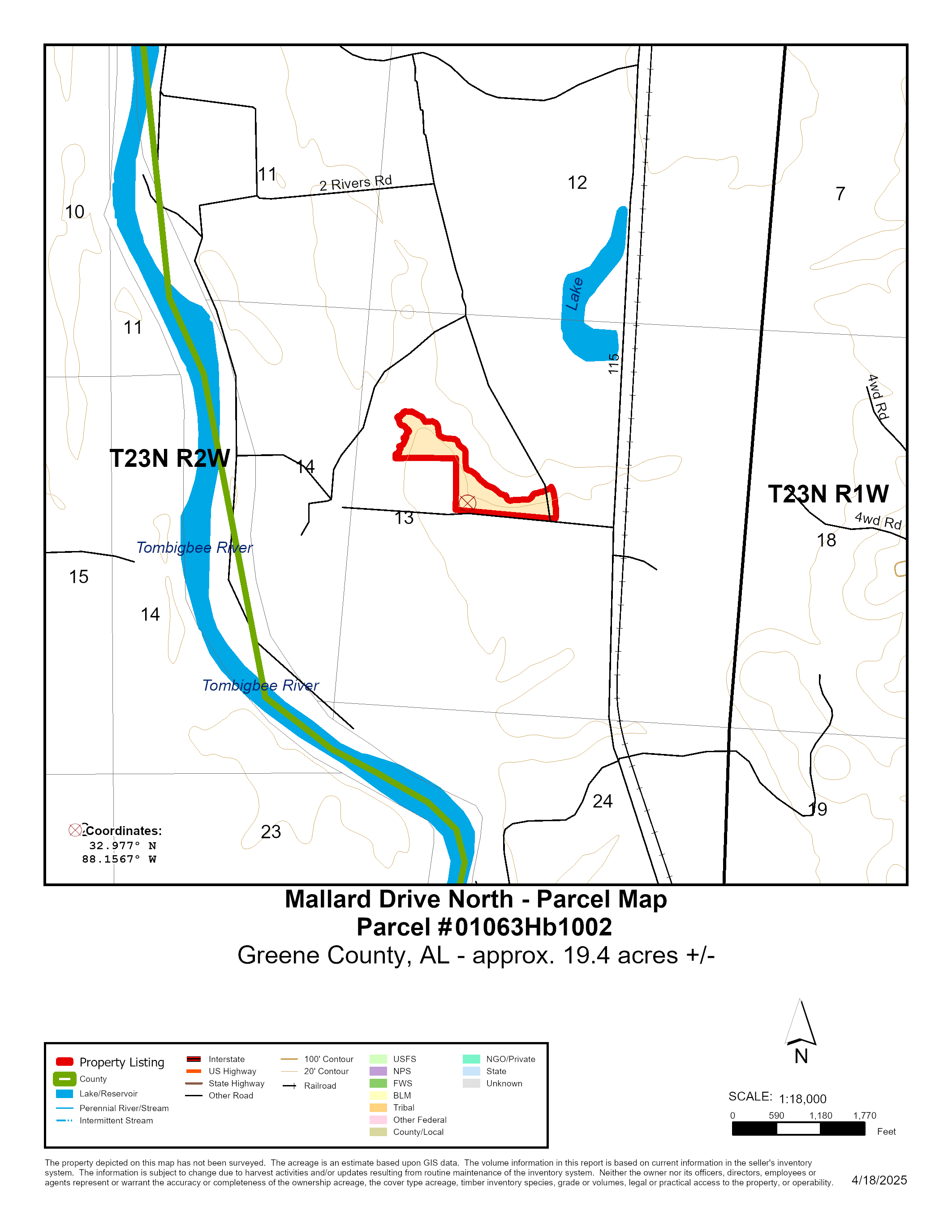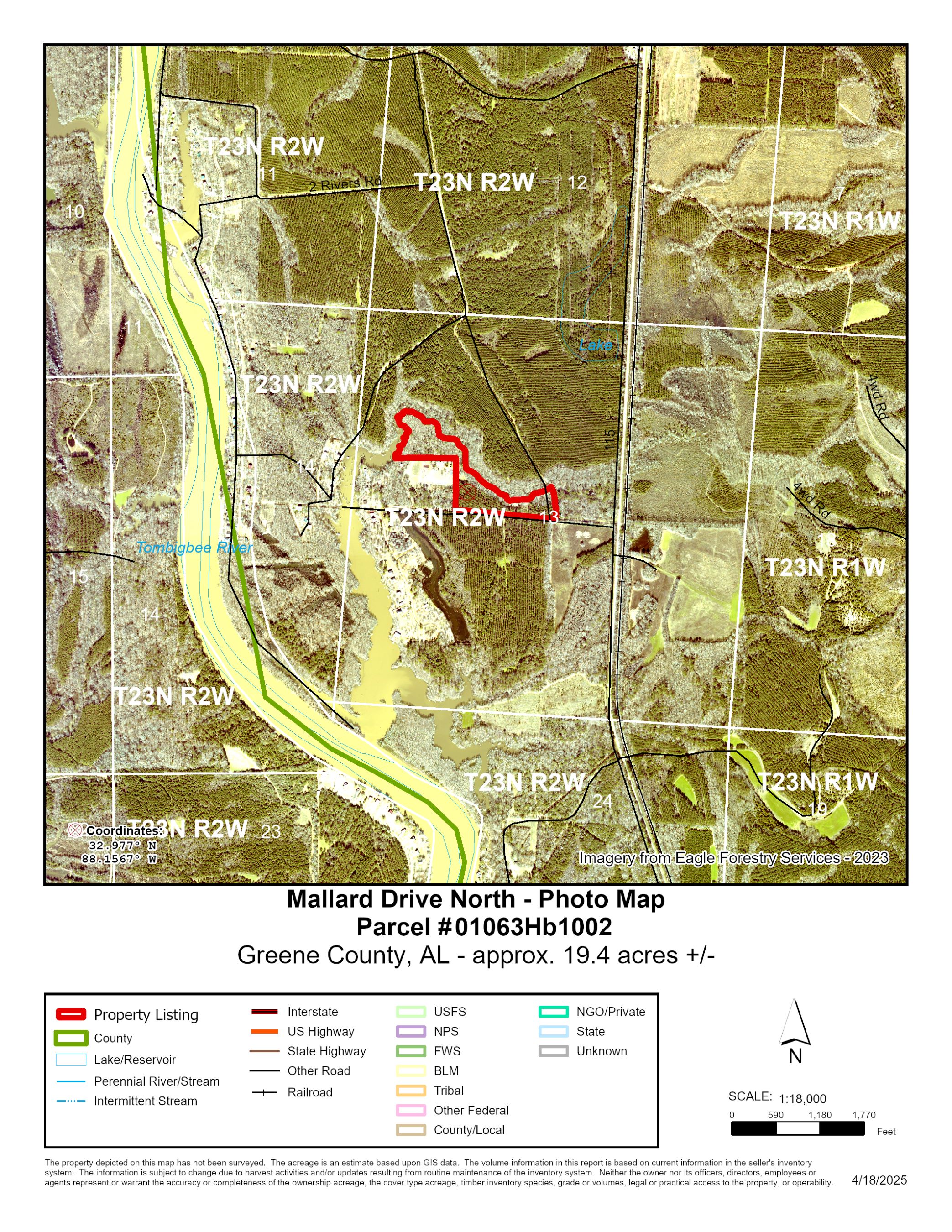 19.4 ± acres in Greene County, AL with frontage on Mallard Drive—an excellent opportunity for recreation, investment, or a future homesite. Approximately 8 acres have been clearcut, offering space for reforestation, development or food plots, while the remaining 11 acres feature mature hardwoods that provide natural beauty and great wildlife habitat. Located just ½ mile from the Tombigbee River, this property is ideal for outdoor enthusiasts who enjoy fishing, deer hunting, and small game. Electricity and public water are available along Mallard Drive, adding convenience for building a home or hunting cabin. Situated just 16 miles from Aliceville, 20 miles from Eutaw, and 50 miles from Tuscaloosa, it’s close enough for a quick escape yet offers the peace and privacy of the countryside.