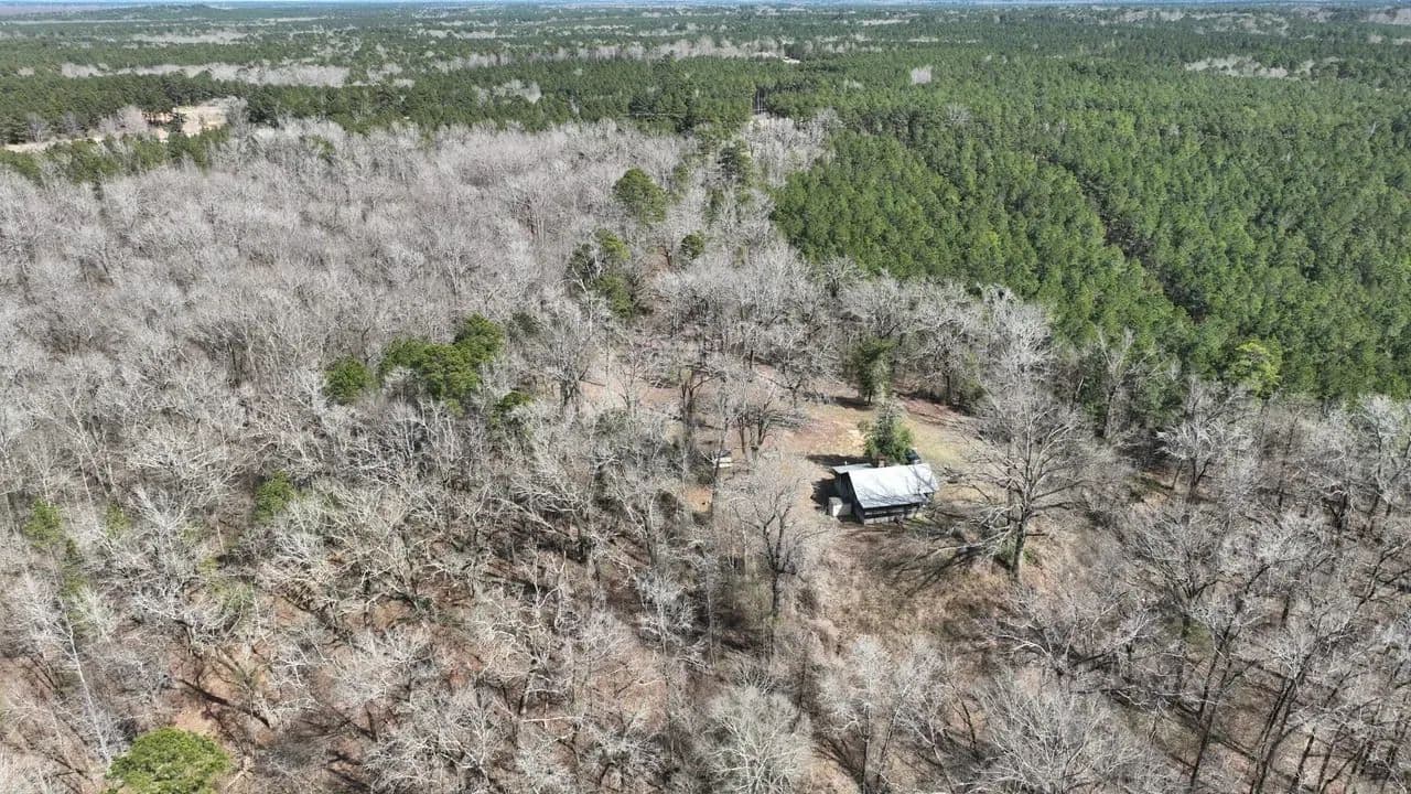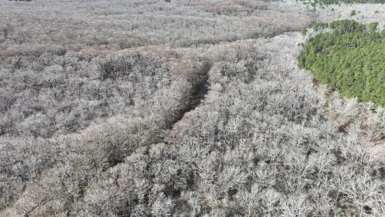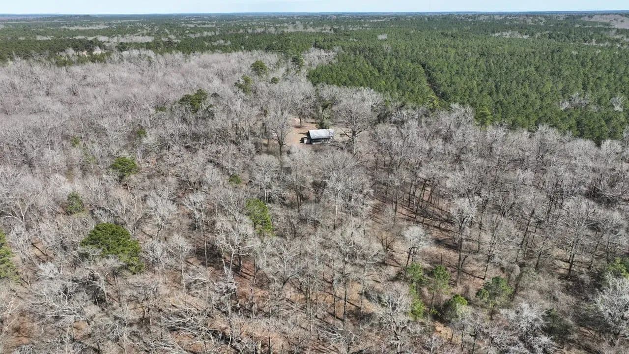 Atop one of the ridgelines sits a rustic cabin with a stone chimney, electricity, and water wells, offering a perfect basecamp for hunting, fishing, or quiet seclusion.