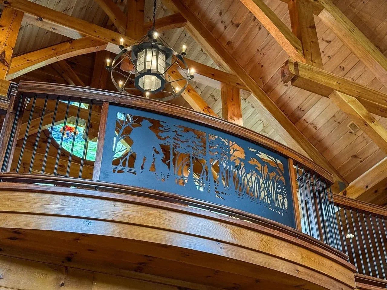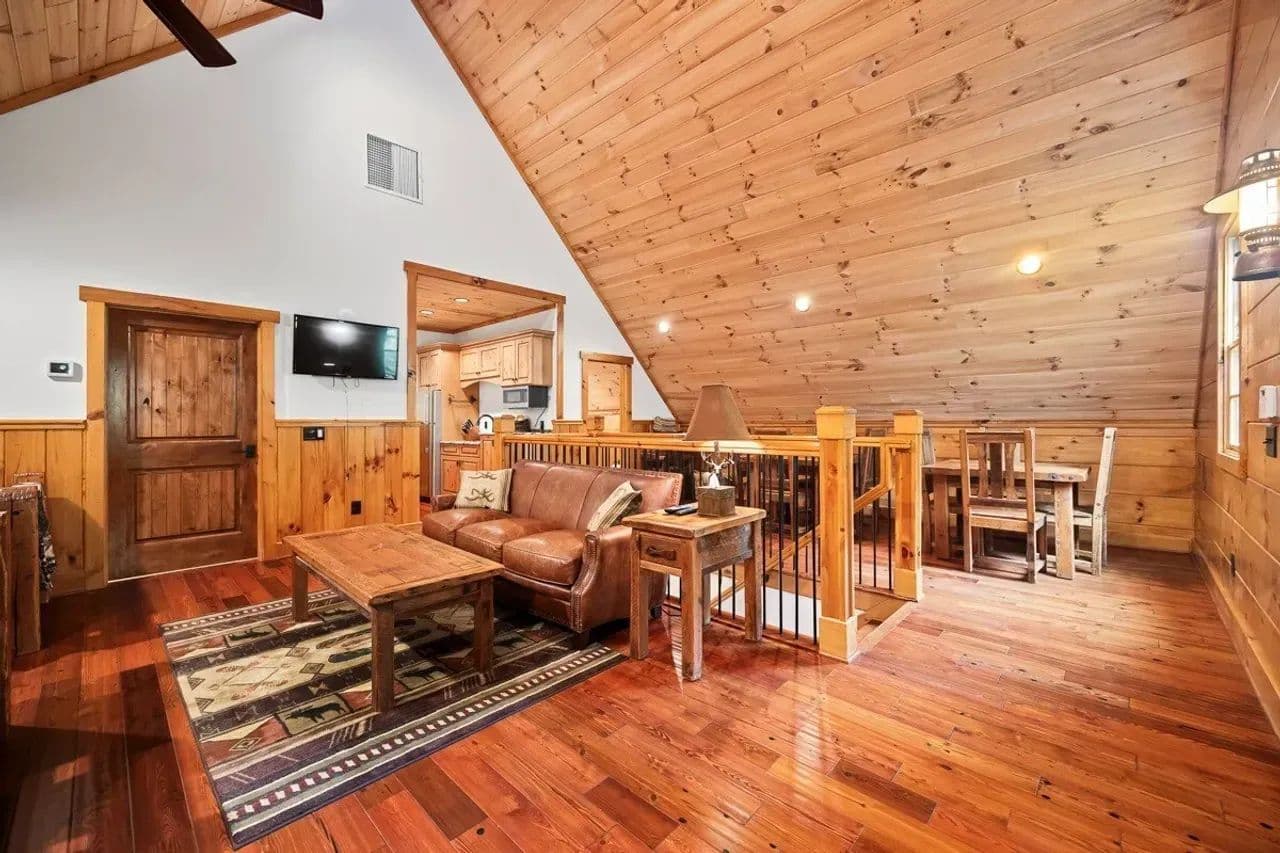 Custom Interiors: Every detail, from the custom-made doors and casings, designer metal chandeliers, to the reclaimed barn wood, exudes rustic elegance. The lodge features a stunning cypress tree centerpiece that appears to grow through the floor, illuminated by a spotlight for a magical effect at night. A high-end Yamaha Clavinova electronic keyboard is also included, housed in the storage room.