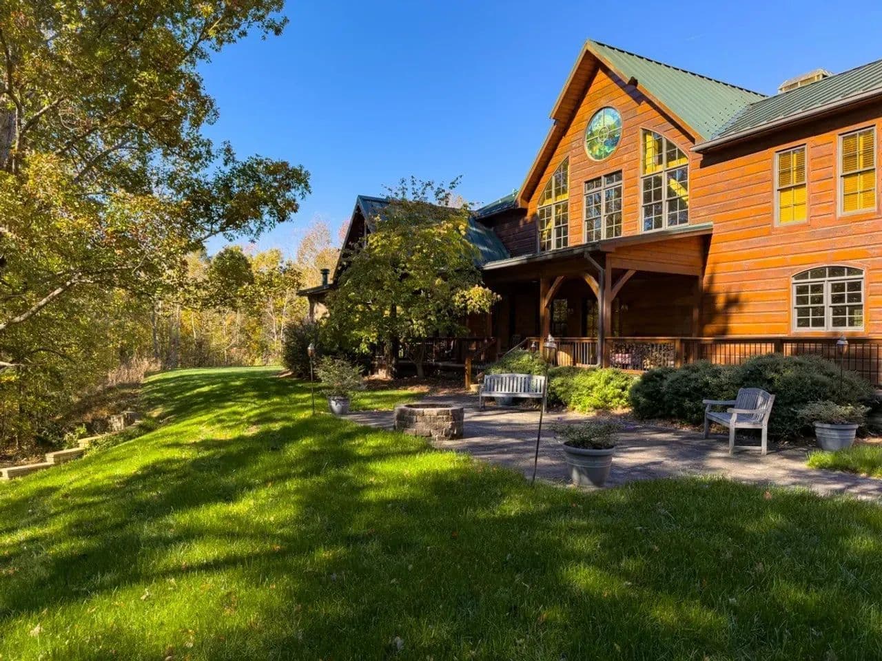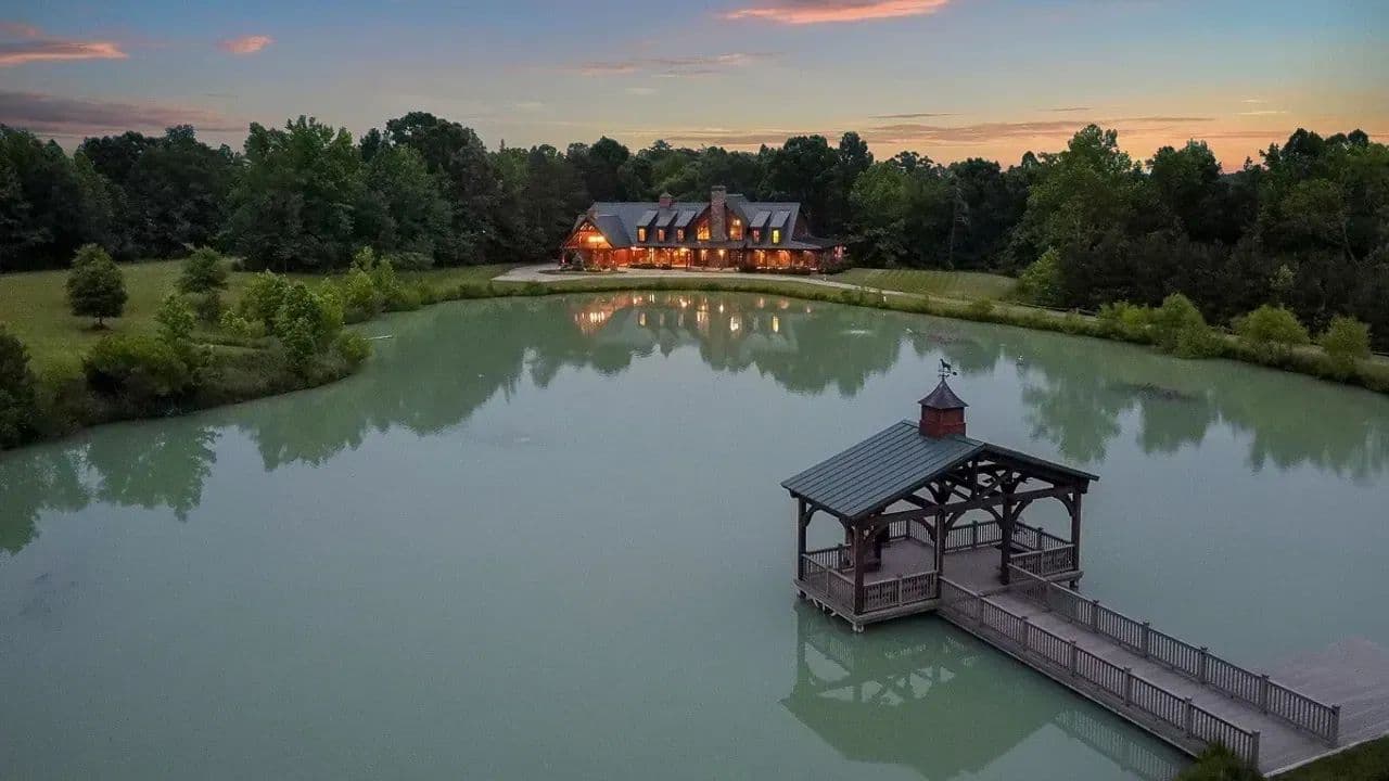 Outdoor Amenities: A 2-acre stocked pond with dock and aeration, full outdoor kitchen, fire pit, porch swings, and outdoor furniture for entertaining up to 50 guests.