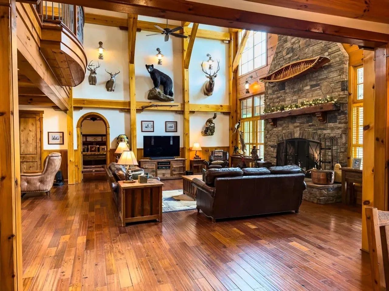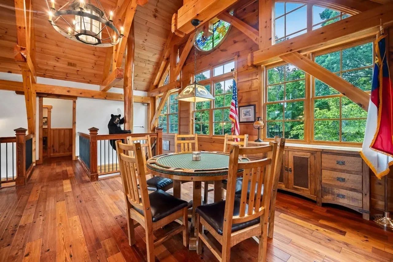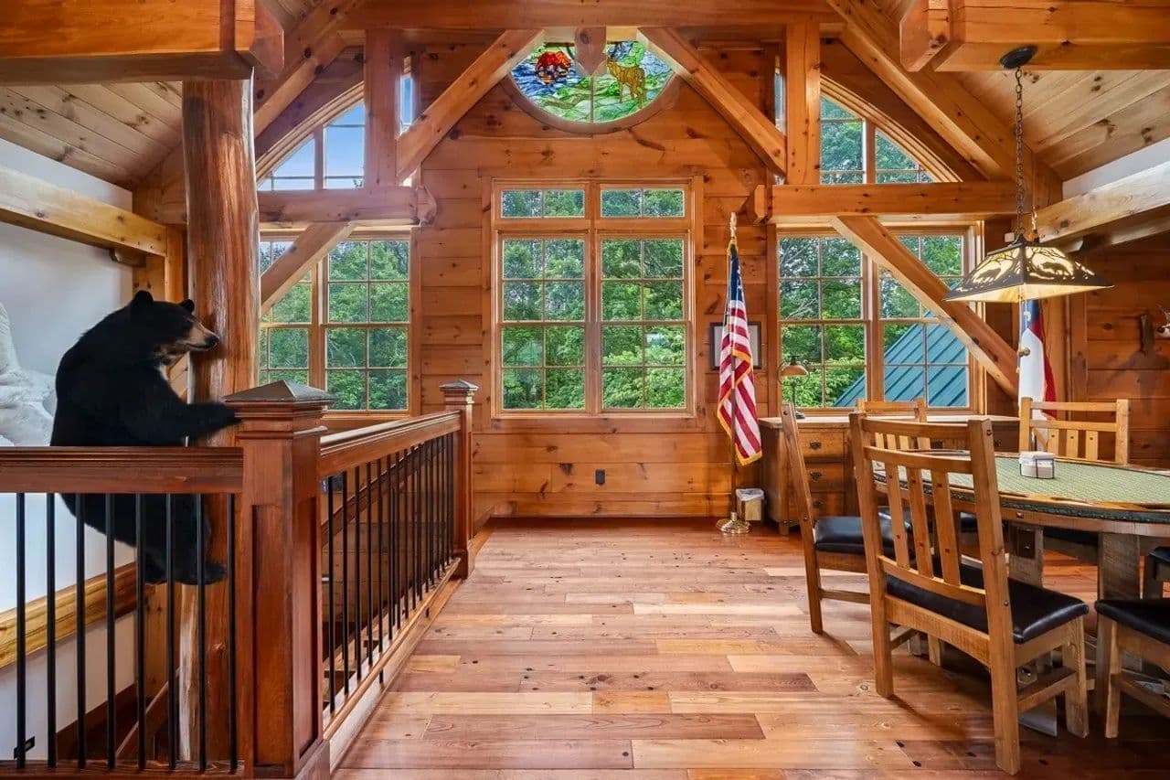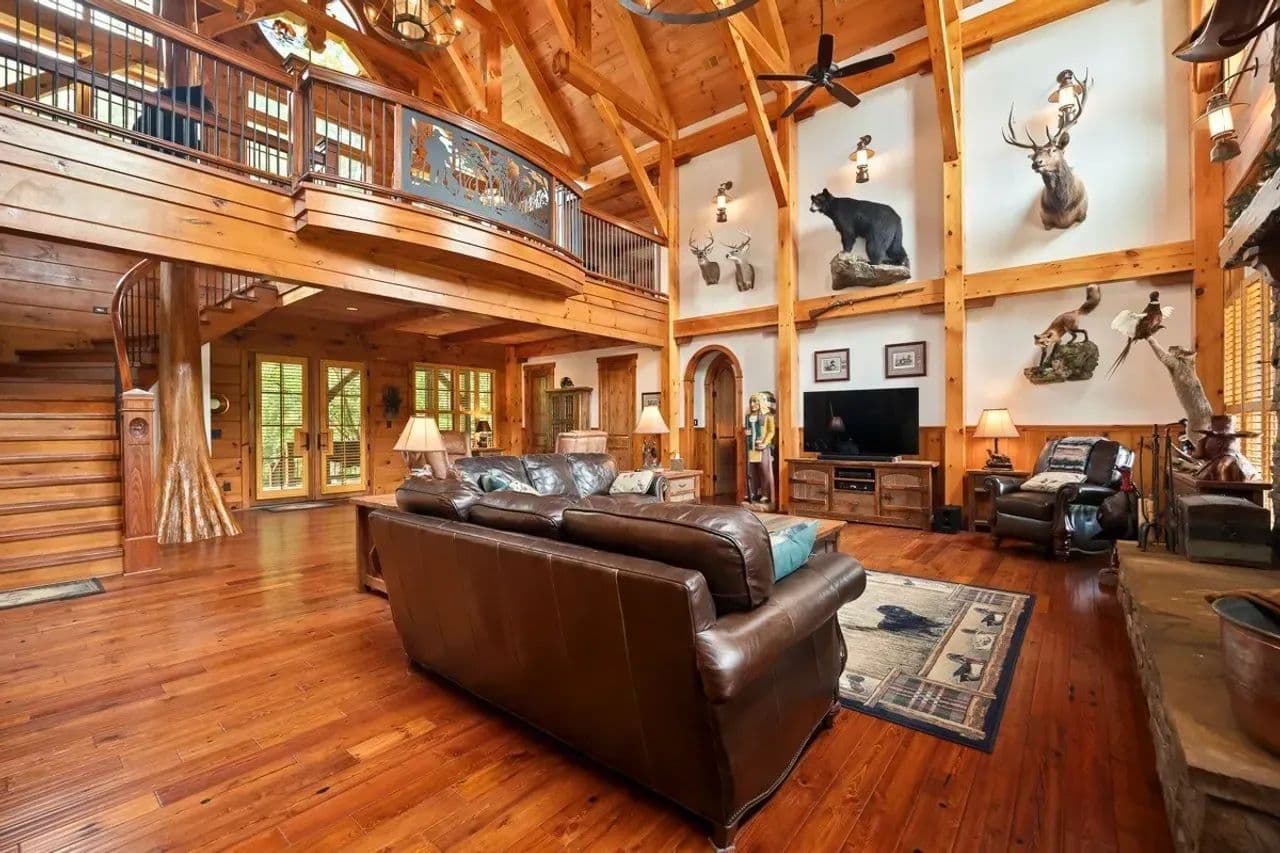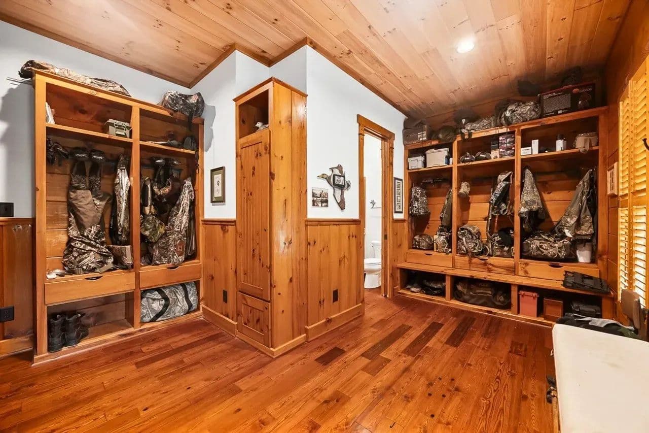 Unique Features: With hunters in mind, the south wing of the lodge includes a locker room with lockers for changing and storing hunting gear. Just above it is the large bunk room for hosting hunters or guests, and both have a full bath for convenience. Custom chandeliers, decorative metalwork, a wildlife-themed stained-glass window, and an extra-large wood-burning fireplace with a gas log starter, which adds unmatched character. There is even a hidden safe room.