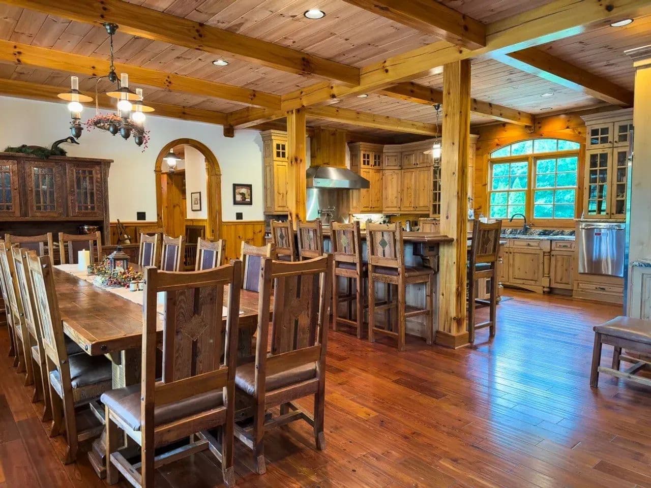 Custom-Built Lodge: Gourmet kitchen with Viking appliances, cypress tree centerpiece, hidden safe room, wildlife-themed stained-glass window, a Yamaha Clavinova electronic keyboard, large walk-in industrial cooler for wild game harvests and other food, and capacity to sleep up to seventeen guests.
