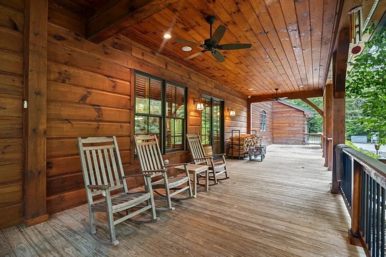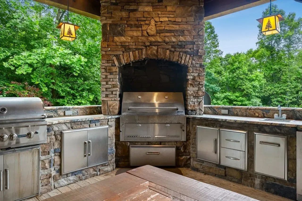 Outdoor Living: The expansive back porch boasts a full outdoor kitchen with gas and charcoal grills, running water, and prep space, perfect for hosting up to 50 guests. Porch swing, rocking chairs, and a fire pit create inviting spaces for relaxation and marshmallow roasting. All outdoor furniture, including folding tables and chairs for large gatherings, are included in the sale.