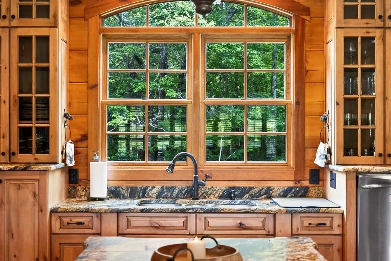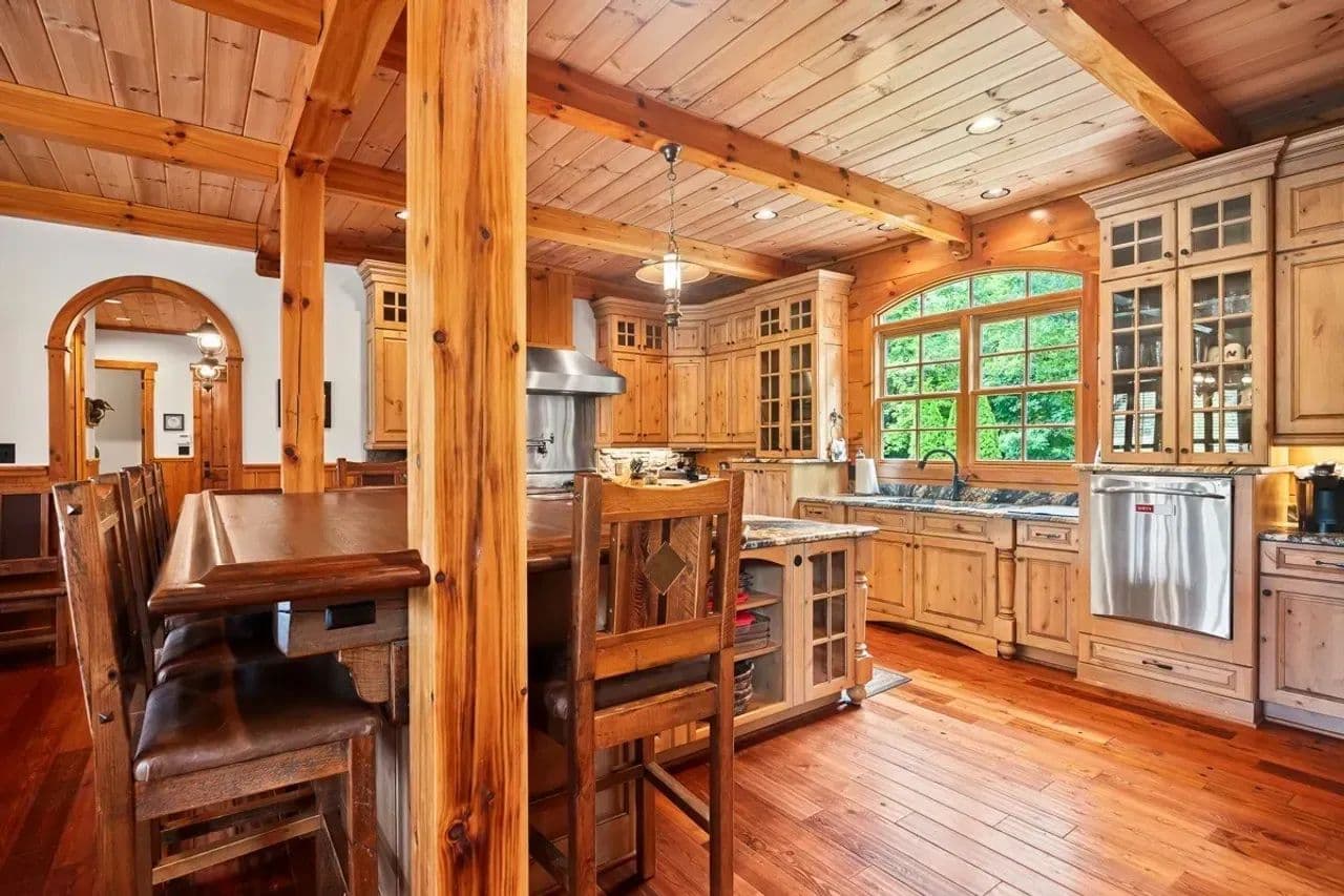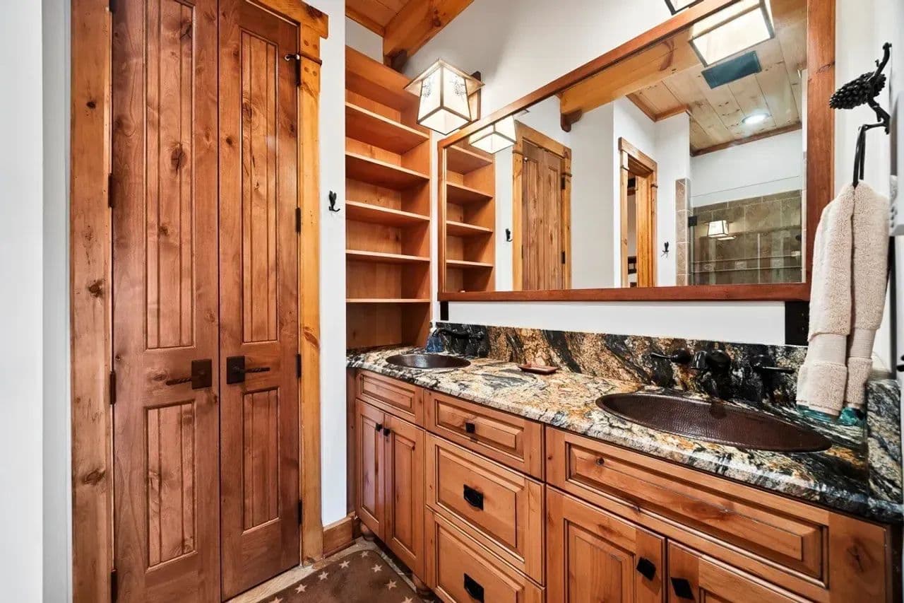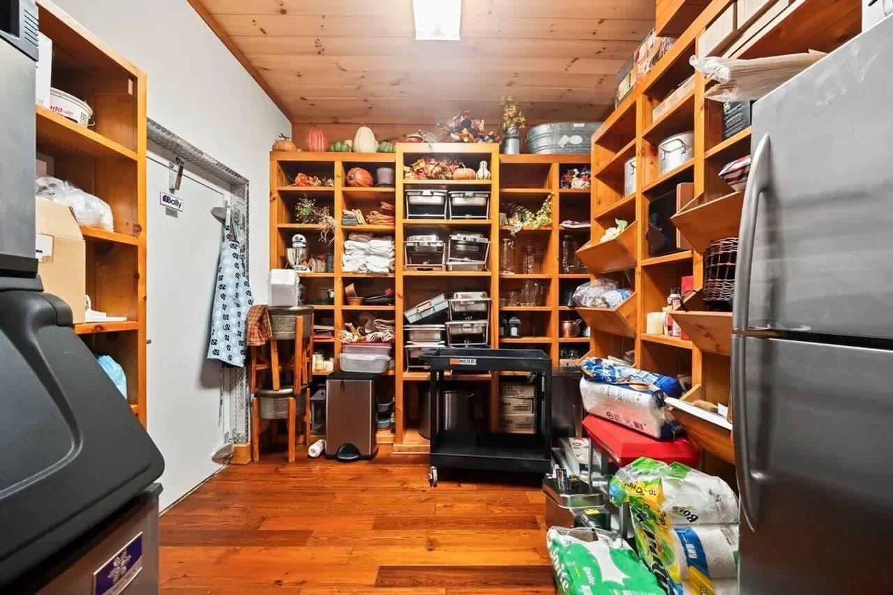 Gourmet Kitchen: Equipped with a Viking six-burner gas range with griddle, double ovens, side-by-side refrigerator/freezer, dishwasher, and ample cabinetry—a cook’s dream. The kitchen counters, bar and prep areas are topped with beautiful, leathered granite; and a large walk-in industrial cooler is available for refrigerating wild game harvests, enhancing the lodge’s utility for hunters and large gatherings.