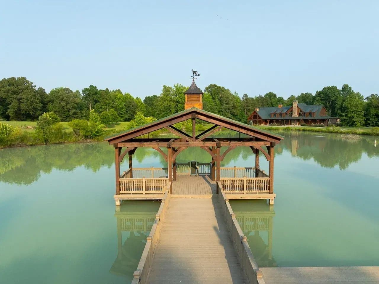 The Dock: The eastern white pine timber frame at the dock reflects the same architectural style as the lodge, complete with its own matching custom weathervane. The dock comes with two ceiling fans, lighting & electrical, and solar powered fish feeder that is programable, and the planks and railing are of a trex-like composite material that’s low maintenance and made to last. Small boats, canoes, or kayaks can be stored on the adjacent launch platform, and it has also been used for wedding ceremonies.