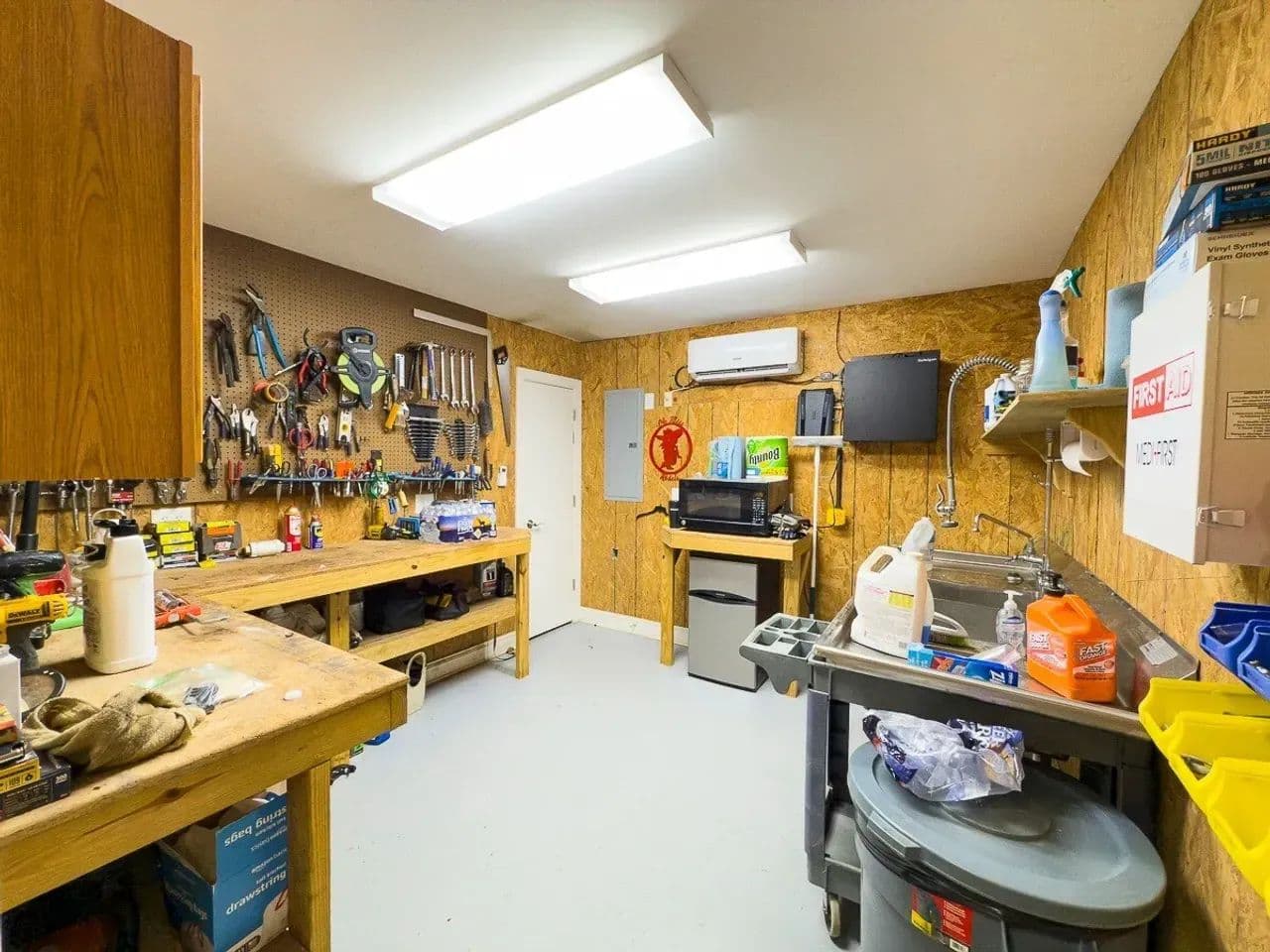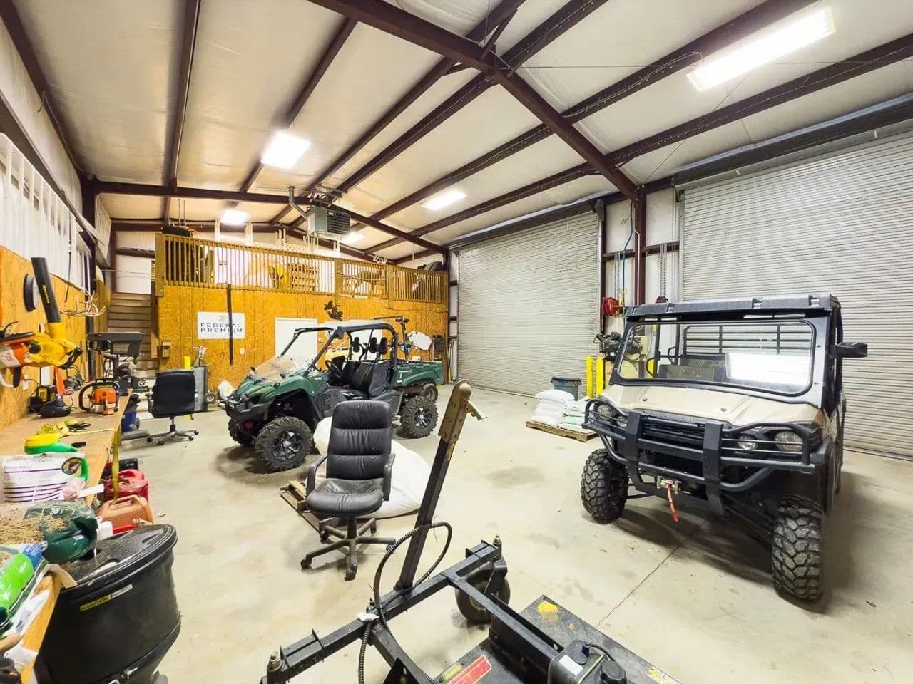 Shop: The 100’ x 30’ shop features an office with a half bath, a large garage for four ATVs, built-in shelving, bulk storage, small workshop room, two roll-up doors, an electric hoist, an upstairs storage area, and a floor drain. It operates on its own electrical service.