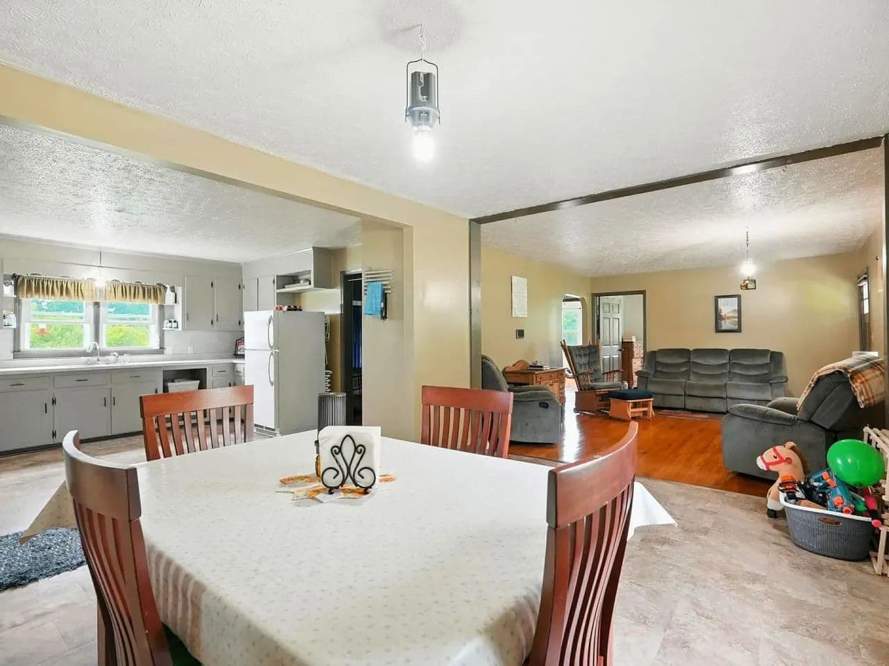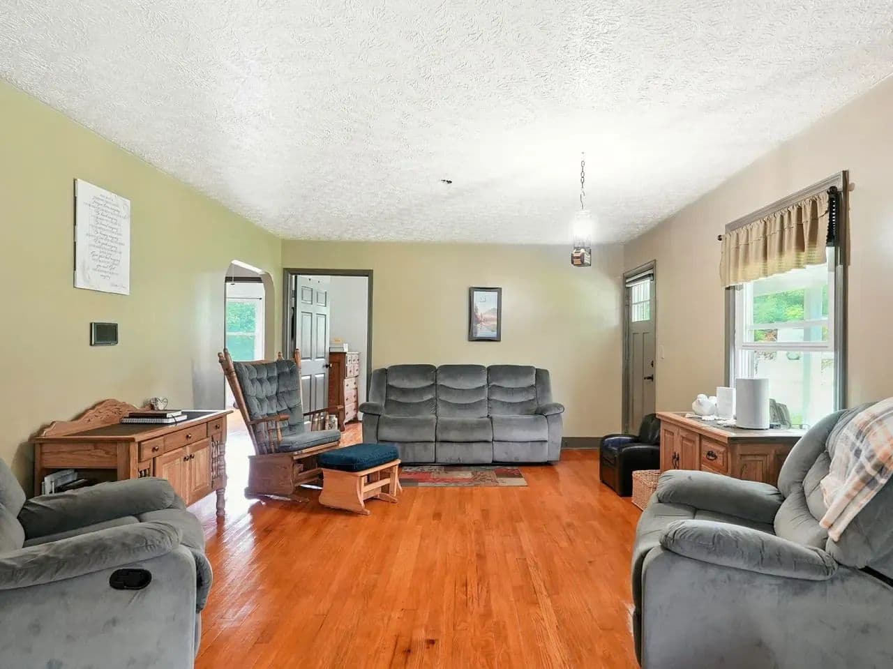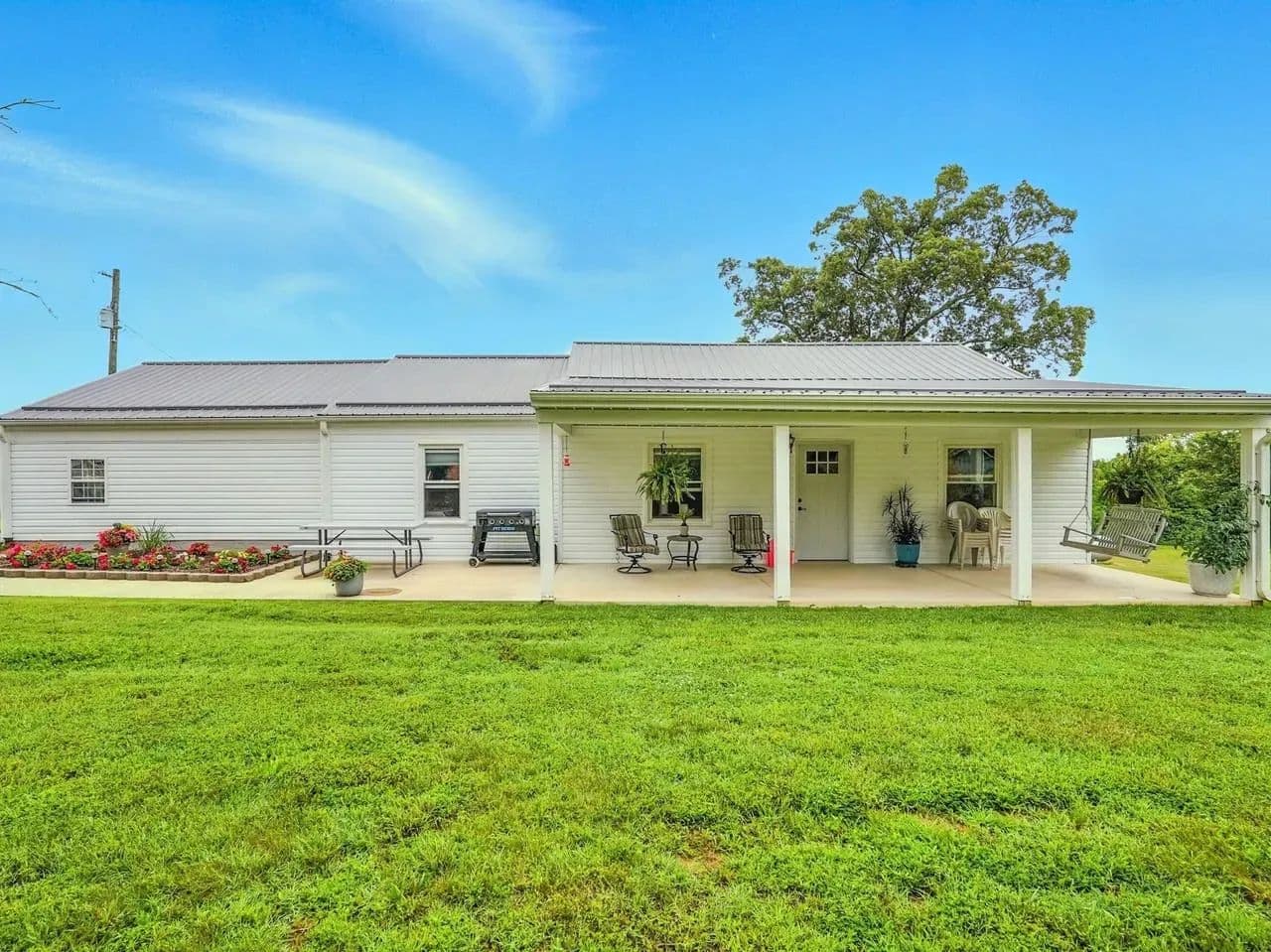 Inside, you'll find gleaming hardwood floors throughout and an inviting open floorplan that connects the kitchen, dining area, and living room - ideal for both everyday living and entertaining. Step outside onto the country-style front porch where you can unwind in the swing or enjoy an evening of grilling while taking in the tranquil surroundings.