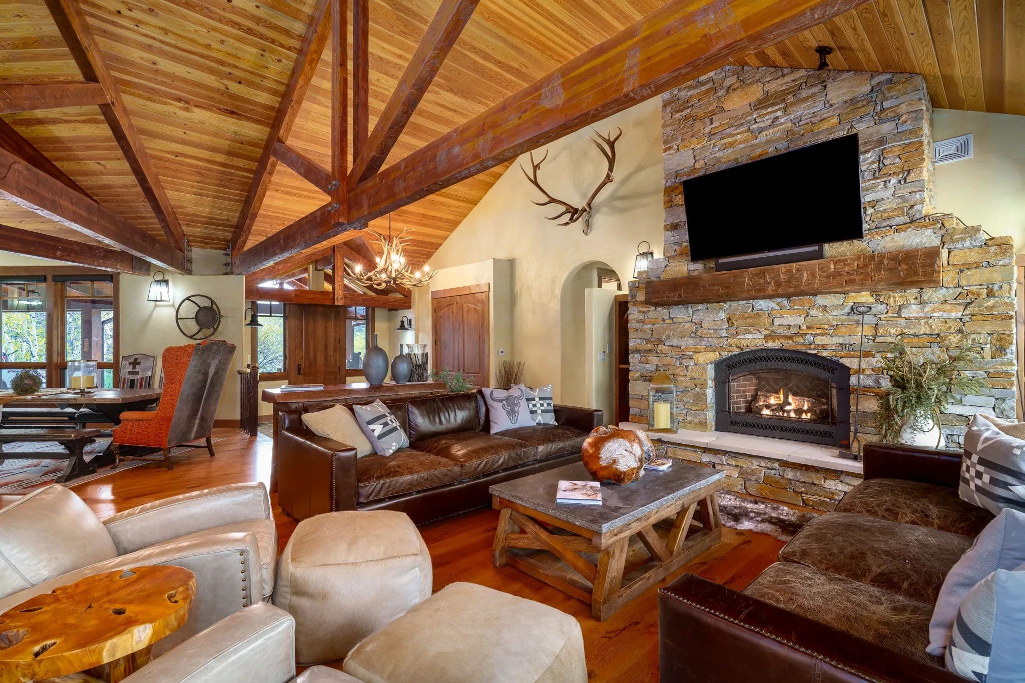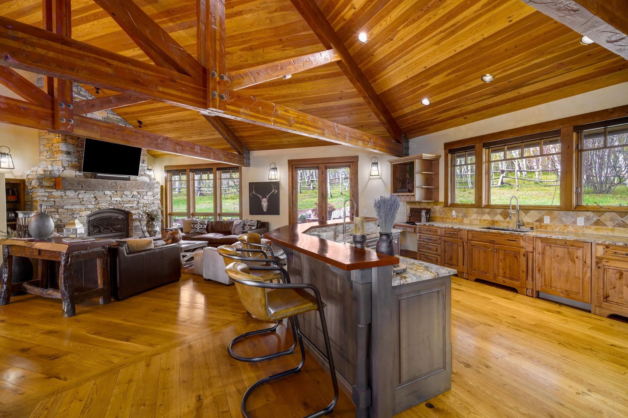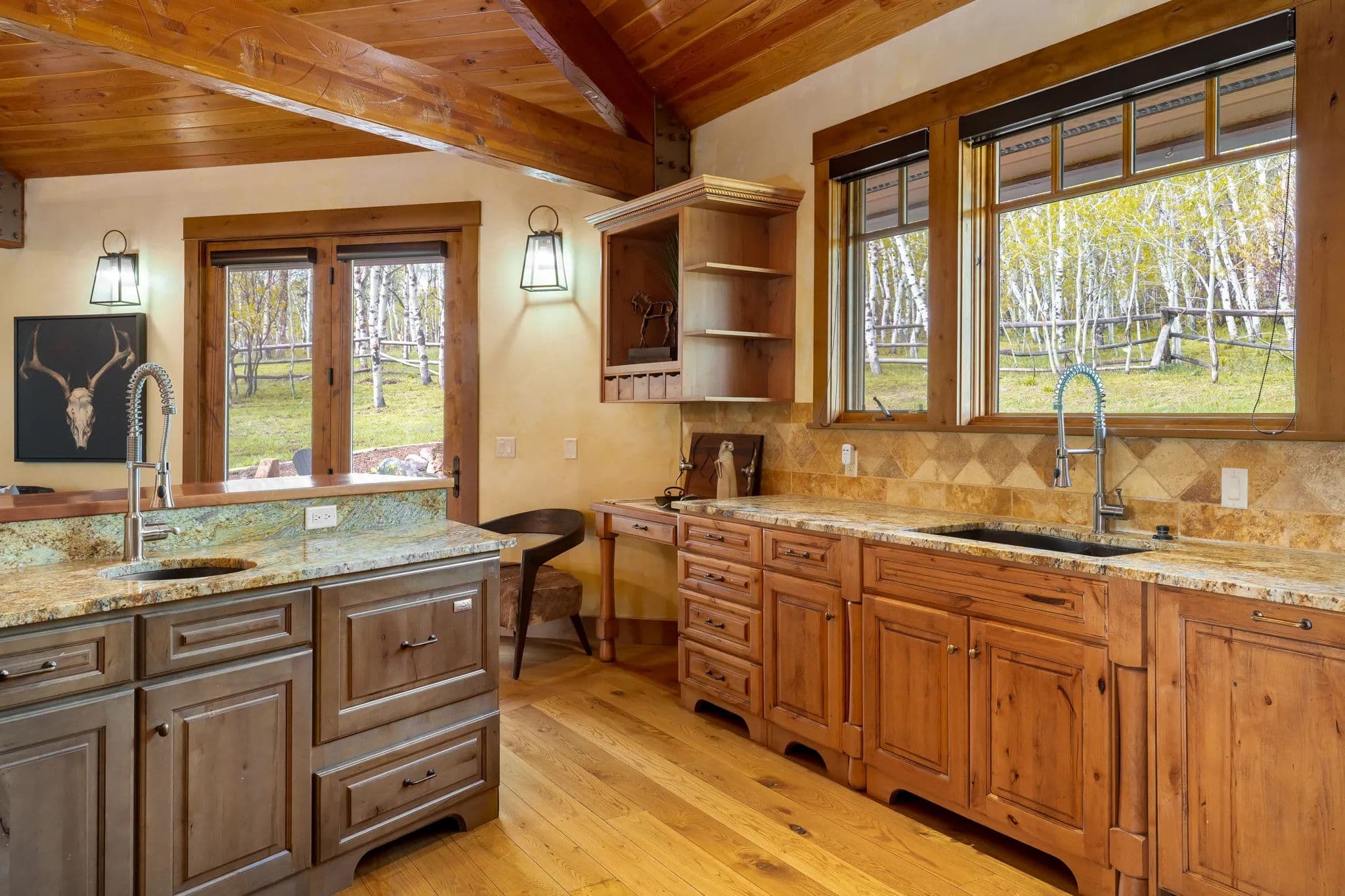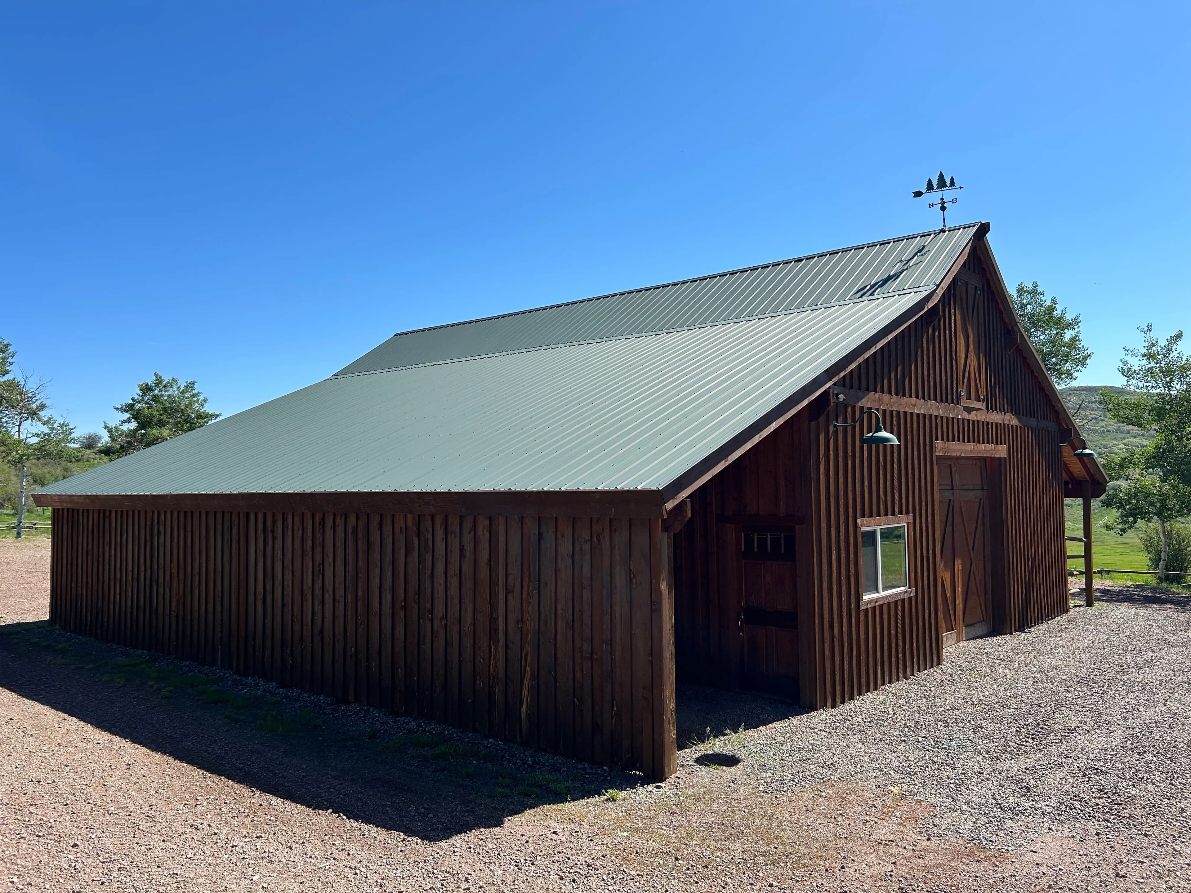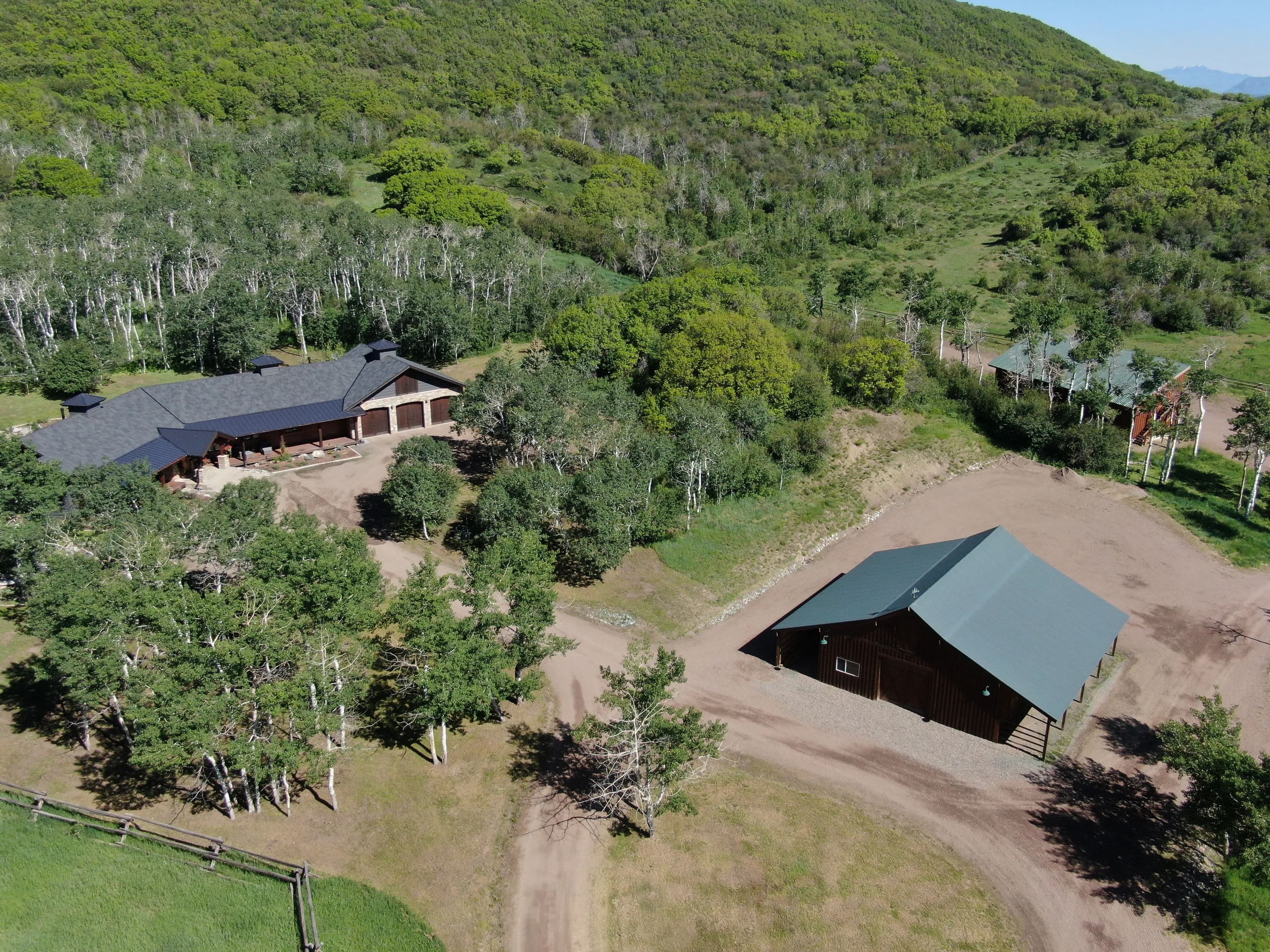 This custom-built home is located on 38 acres in the south valley of Steamboat Springs and is surrounded by a beautiful aspen grove. The floorplan is intelligently designed, featuring a master wing and a guest wing separated by the great room. The kitchen, open to the living and dining areas, showcases impressive hand-hewn beams that elevate the architectural elegance of the vaulted ceilings. Outfitted with granite counters and bar seating for chef-worthy cooking and entertaining, the kitchen also features premium appliances, custom cabinetry, and a large pantry. The dining room accommodates a large table and buffet, while the living room centers around a stone fireplace topped with a striking antique mantel. The master wing includes convenient access to an office and the laundry room. The master suite offers views of the landscaped yard and surrounding aspens, which are teeming with birds and wildlife throughout the seasons. The 5-piece bathroom includes a steam shower, jetted tub, double sink, and separate water closet, and is adjacent to a carpeted walk-in closet with personalized shelving and ample hanging space. The guest wing has a large den (presently used as a bunk room), a hall powder room, and two stylish guest suites, each with its own en-suite bathroom. A mudroom with built-in storage leads to an oversized three-car garage with fresh epoxy flooring. Outdoor living is just as refined, with a wide deck that spans the length of the home, a beautiful back deck, and a professionally landscaped yard supported by an irrigation system. Outbuildings include a dual-purpose barn with finished space for recreational vehicles and ample room to customize for horses, as well as an additional 5-bay garage. The water is supplied by a neighboring central water system, and a pond is fed by a decreed spring. Situated at the end of the road in a private valley setting with no covenants, the property lies just 12 miles from Steamboat Springs.