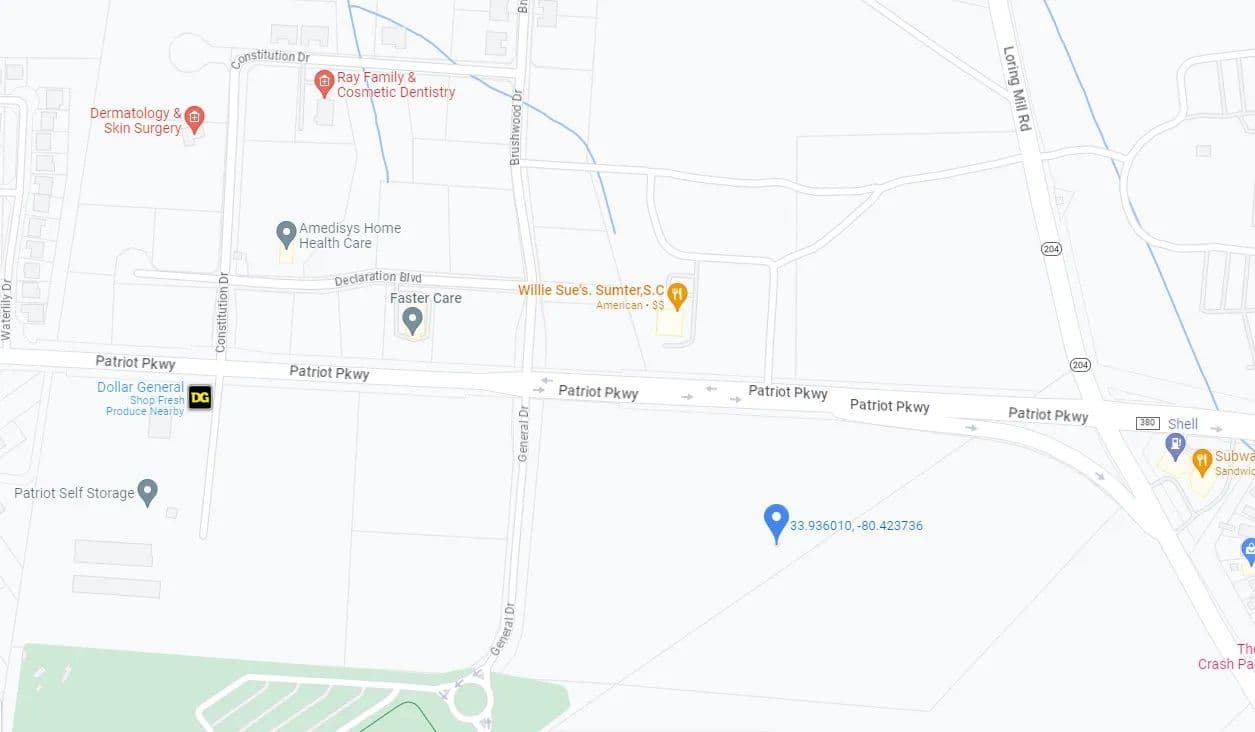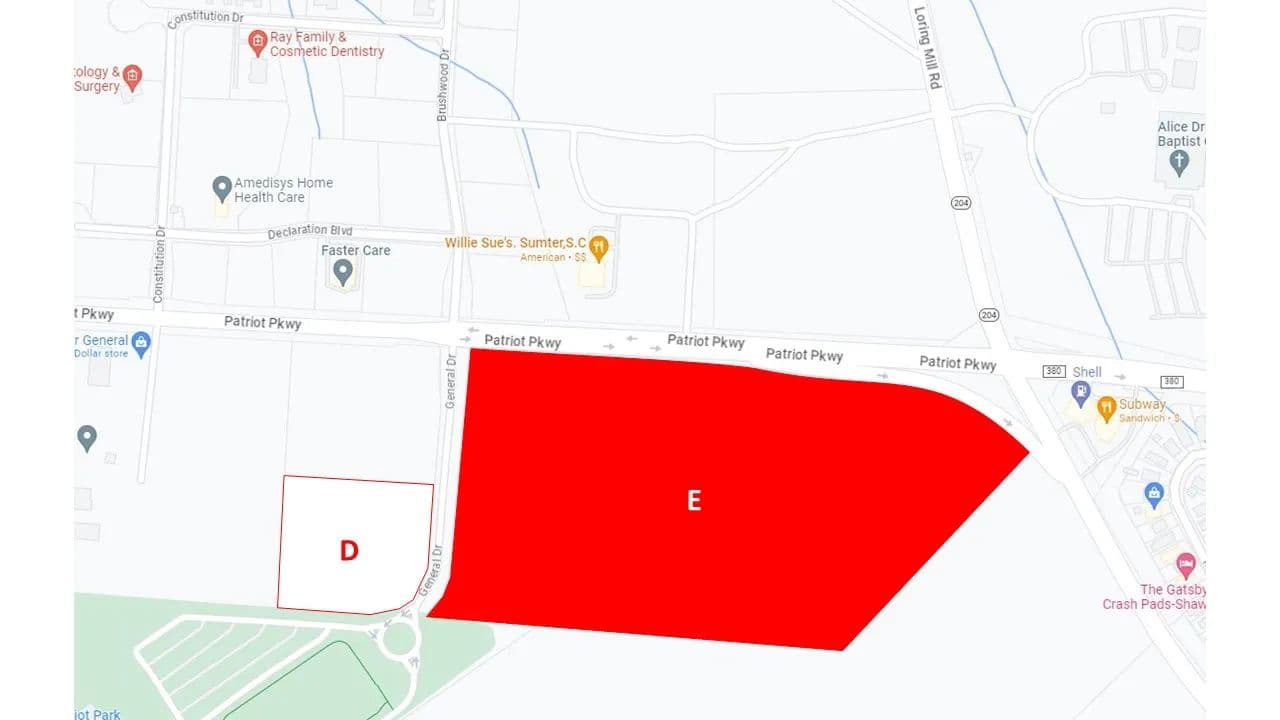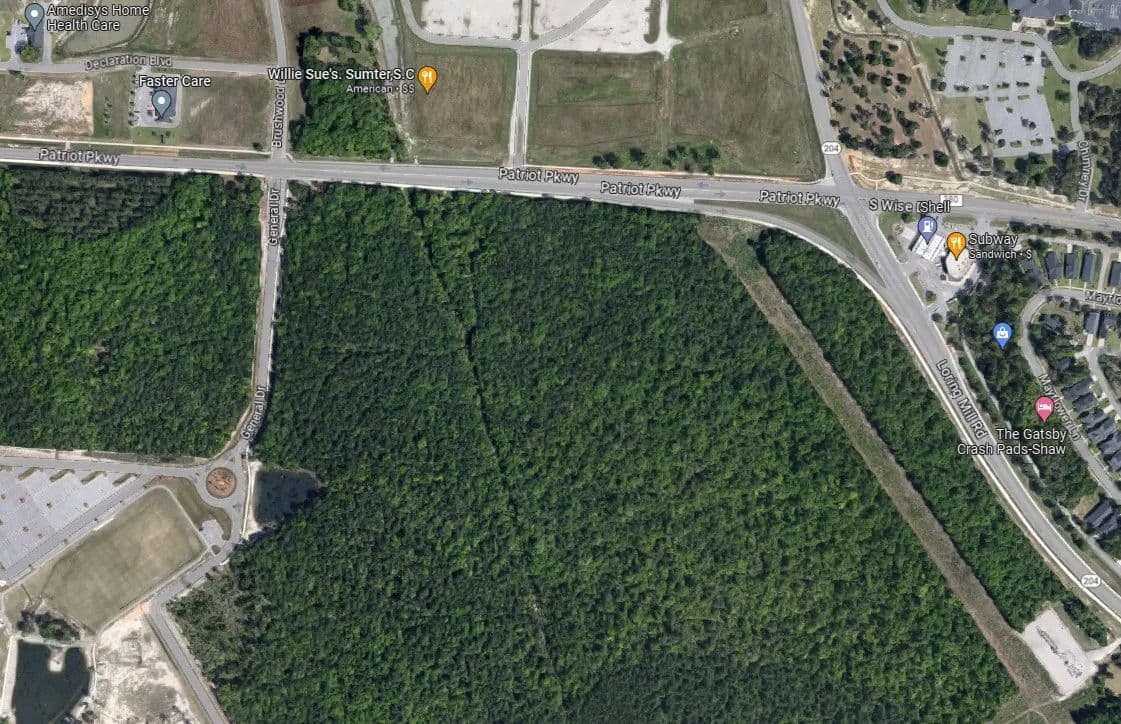 51 Acres of subdivided commercial property on Patriot Parkway. Front and back lots available to suit specific needs. Great location in Sumter West, a 720 acre planned development featuring six residential subdivisions and Sumter County’s newest recreational park. Property is located at a lighted intersection across from proposed Patriot Centre, an upscale grocery anchored retail development