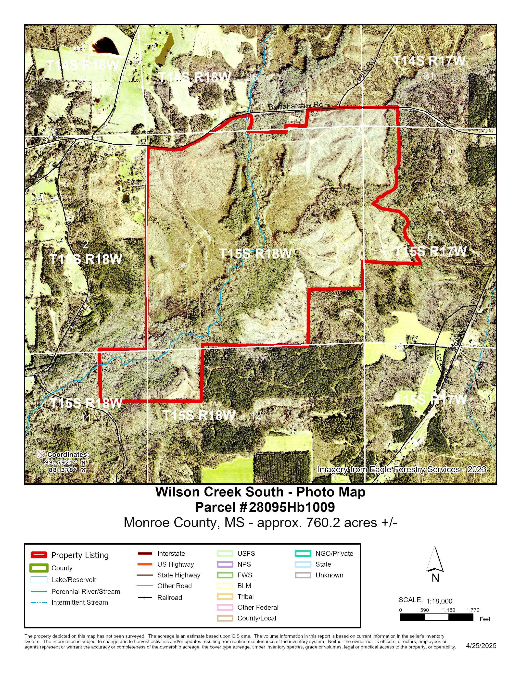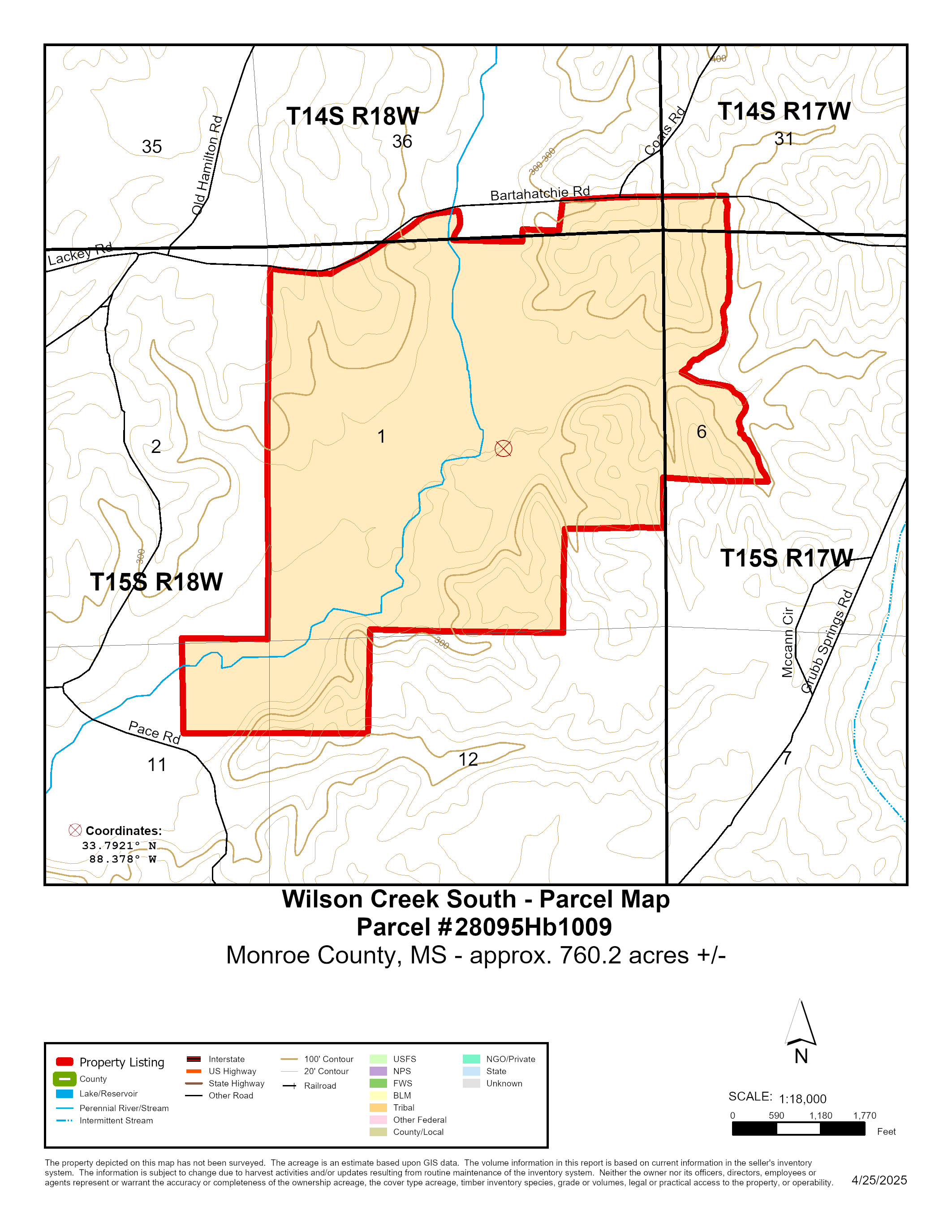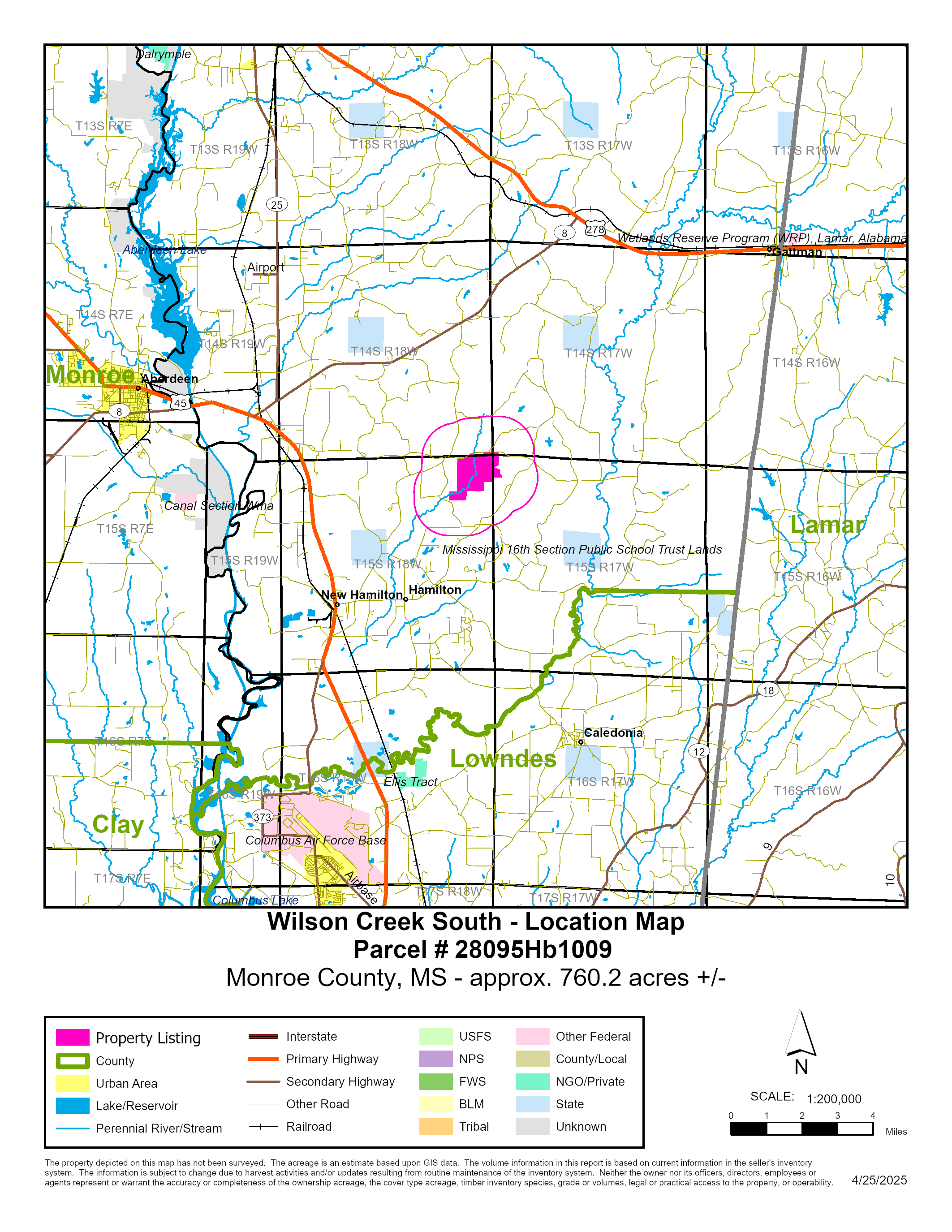 Located in Monroe County, MS, this 760.2 ± acre tract is a rare opportunity for timber investors and outdoor enthusiasts alike. With paved frontage on Bartahatchie Road, the property features 446.8 ± acres of pine plantations established in 2023 and 2024, along with 296.5 ± acres of mature hardwoods—offering immediate and long-term timber income potential. Wilson Creek runs north to south through the property, feeding into a large slough in the southwestern corner—perfect for a duck hunting hole. The land also offers excellent deer, turkey, and small game hunting. Conveniently located just 6.5 miles from Hamilton, 10 miles from Aberdeen, and 13 miles from Caledonia, this tract combines strong investment value with prime recreational appeal. A true multi-use property in a desirable location.