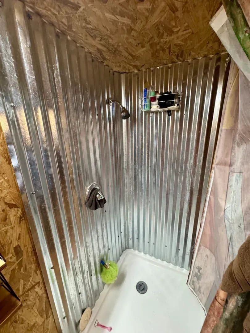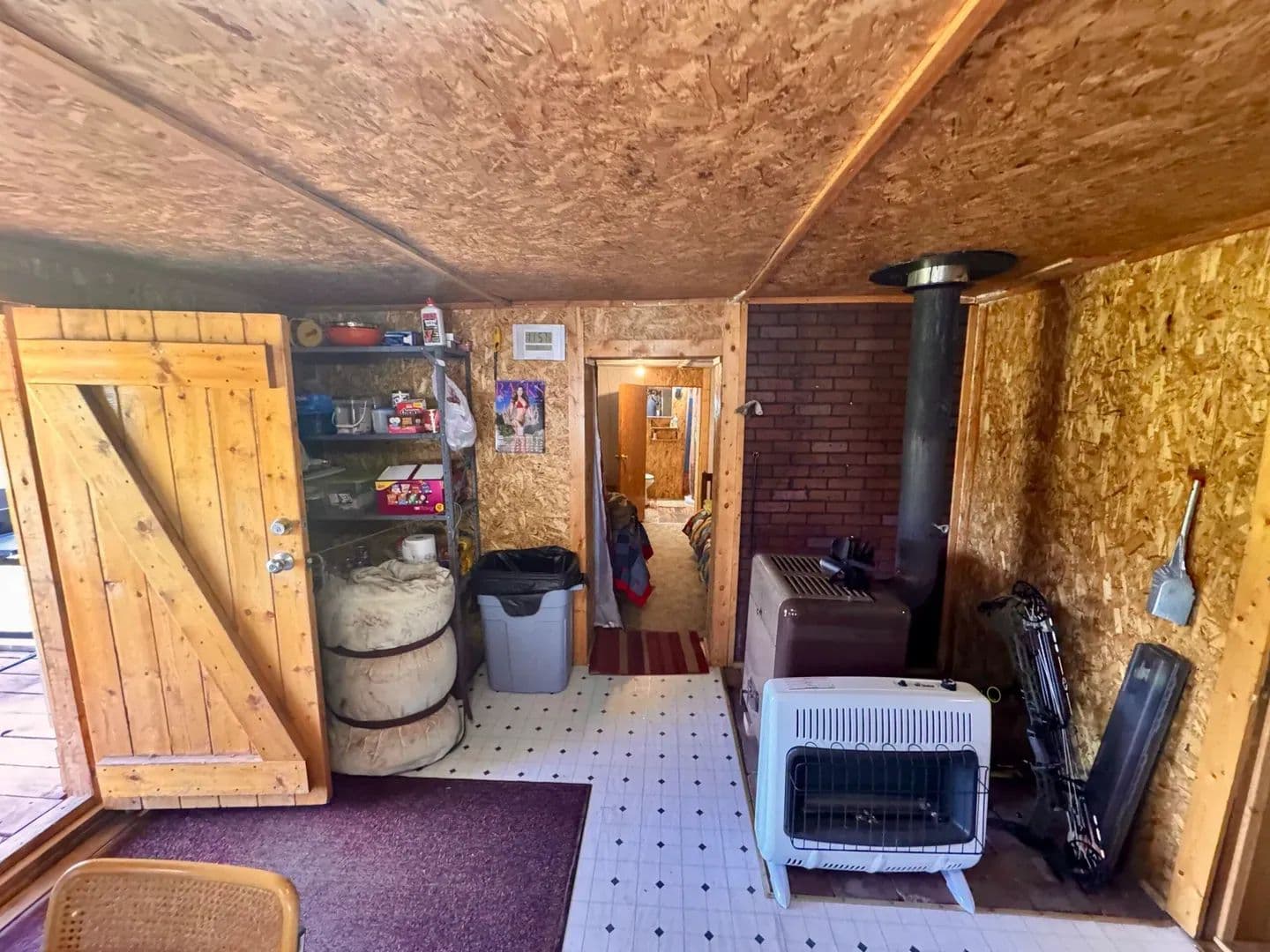 The structure is topped with a durable metal roof and includes a covered front porch, offering a sheltered spot to relax and enjoy the quiet setting. In addition to the enclosed interior, the cabin offers roughly 500 square feet of roof-covered open space—used for a carport, firewood storage, and additional gear staging. Total roof-covered footprint is approximately 1,350 square feet.