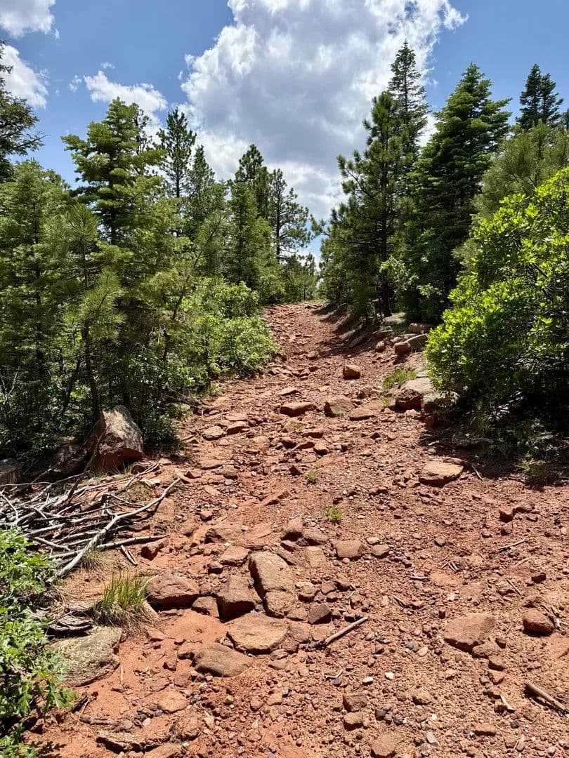 Soils are primarily loamy and well-drained, derived from basaltic volcanic material typical of the Ocate volcanic field. Red sandstone outcroppings are visible in several areas, and surface textures range from grassy flats to forest duff and shallow rocky slopes.