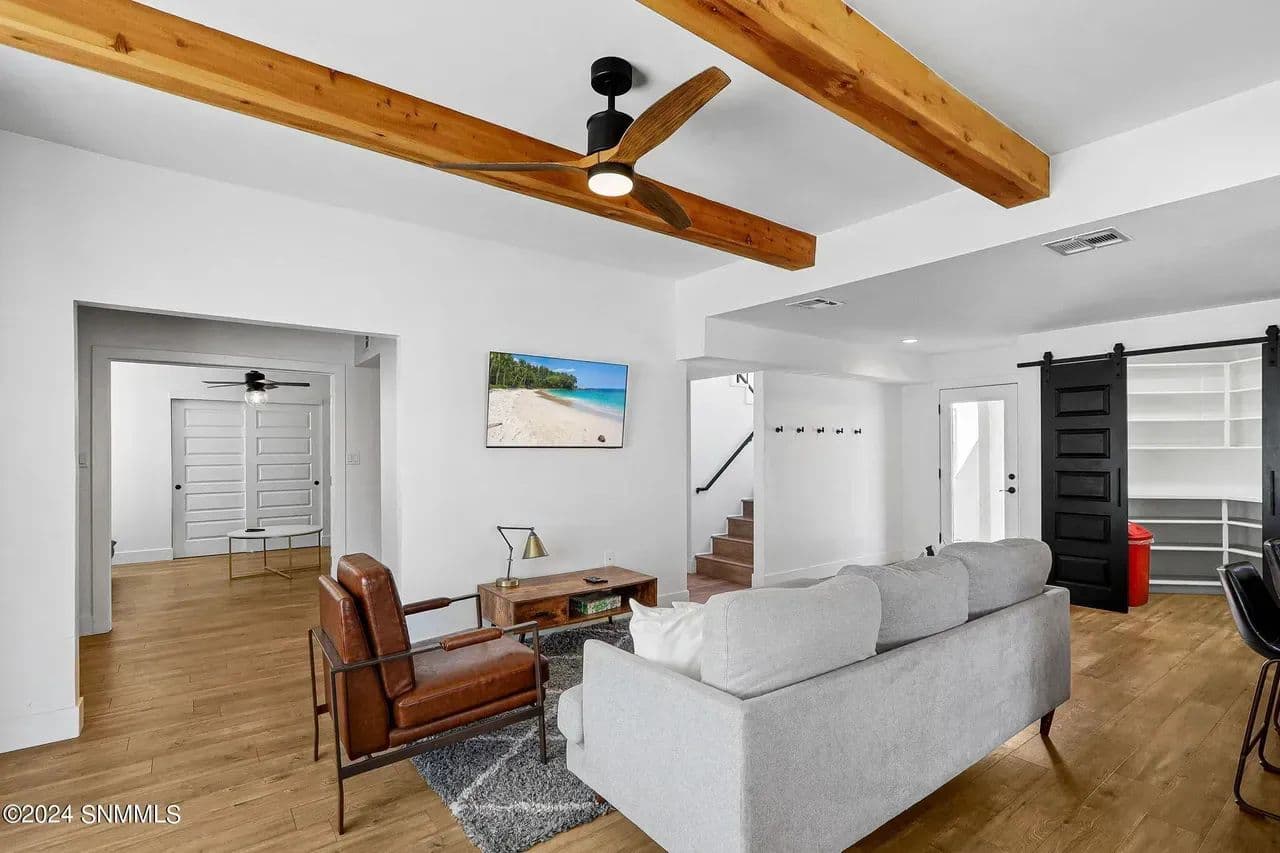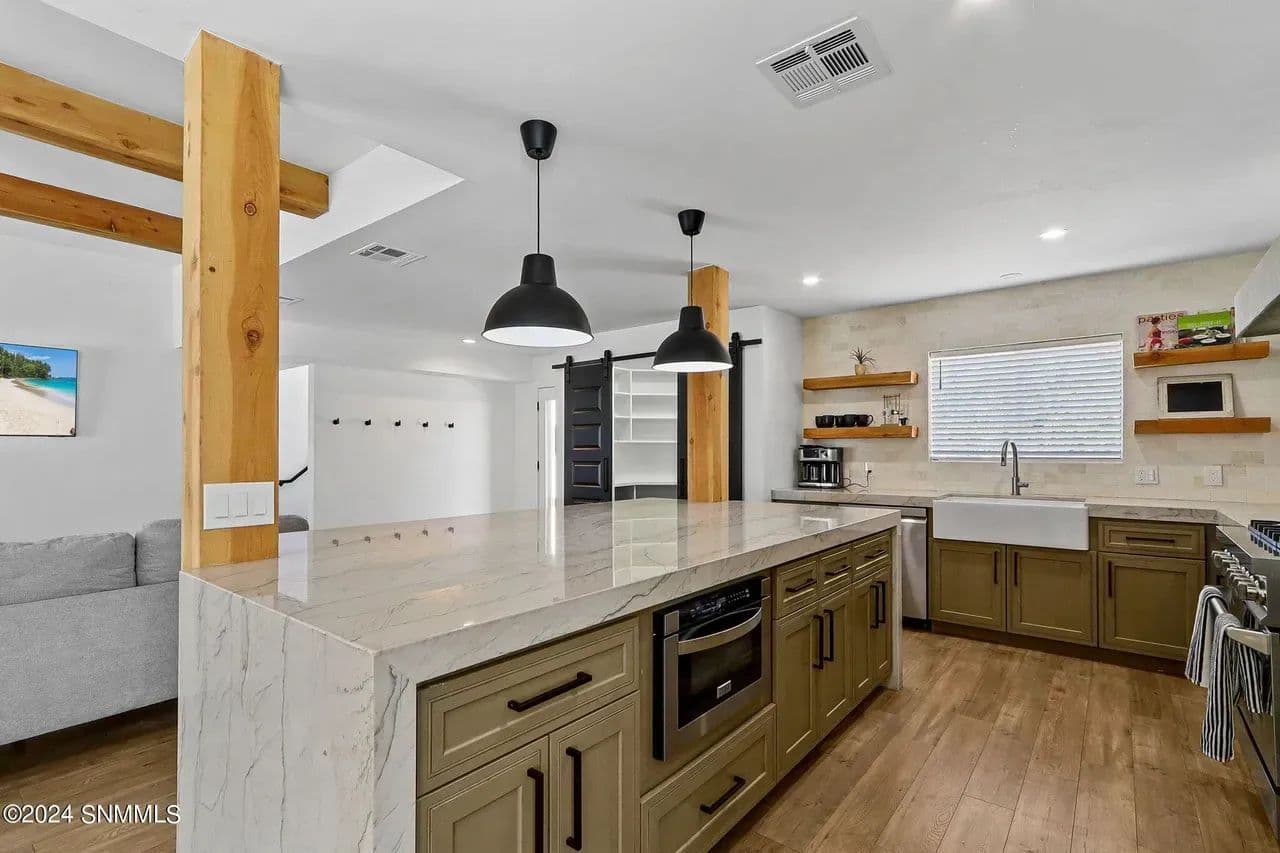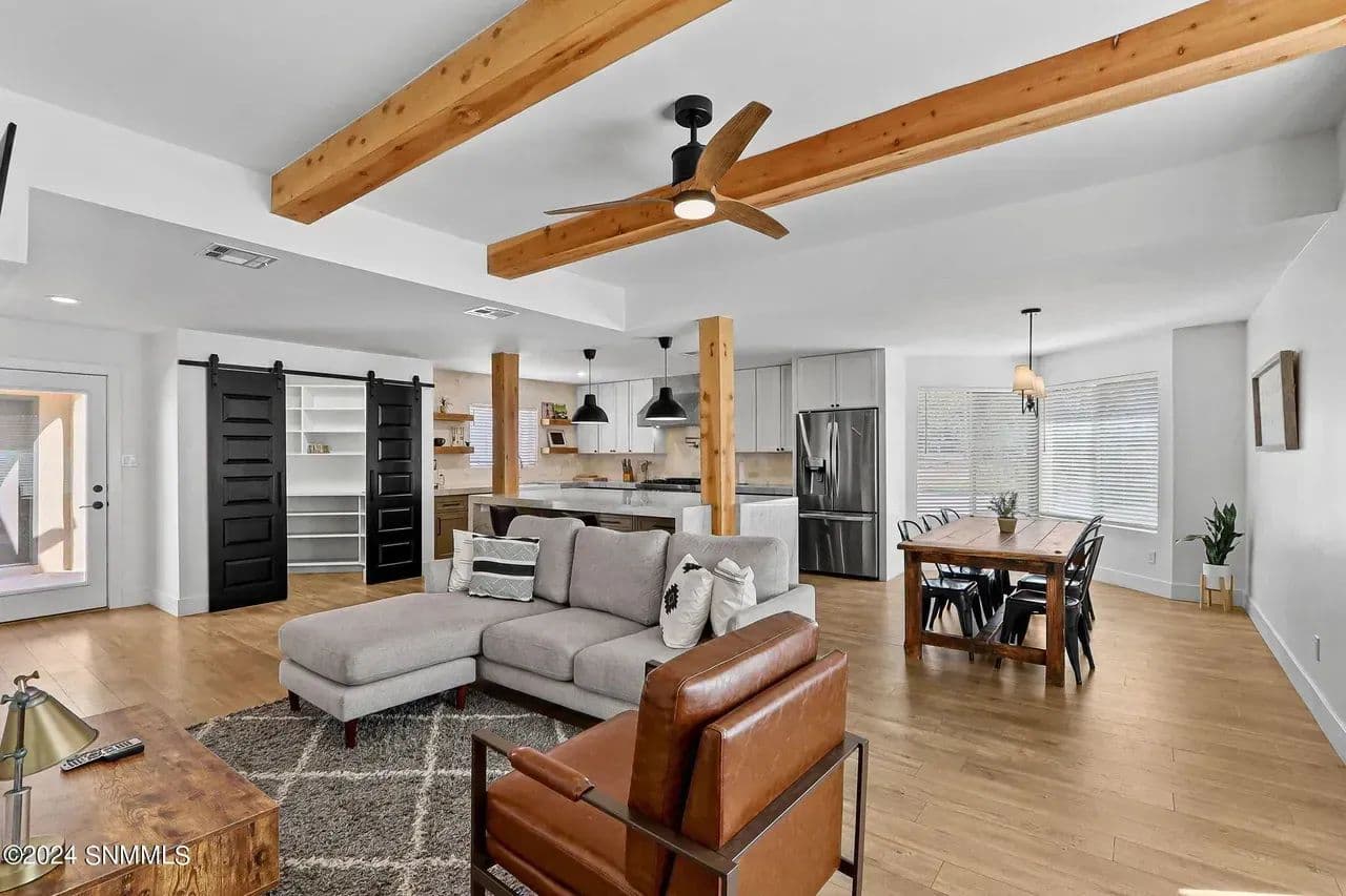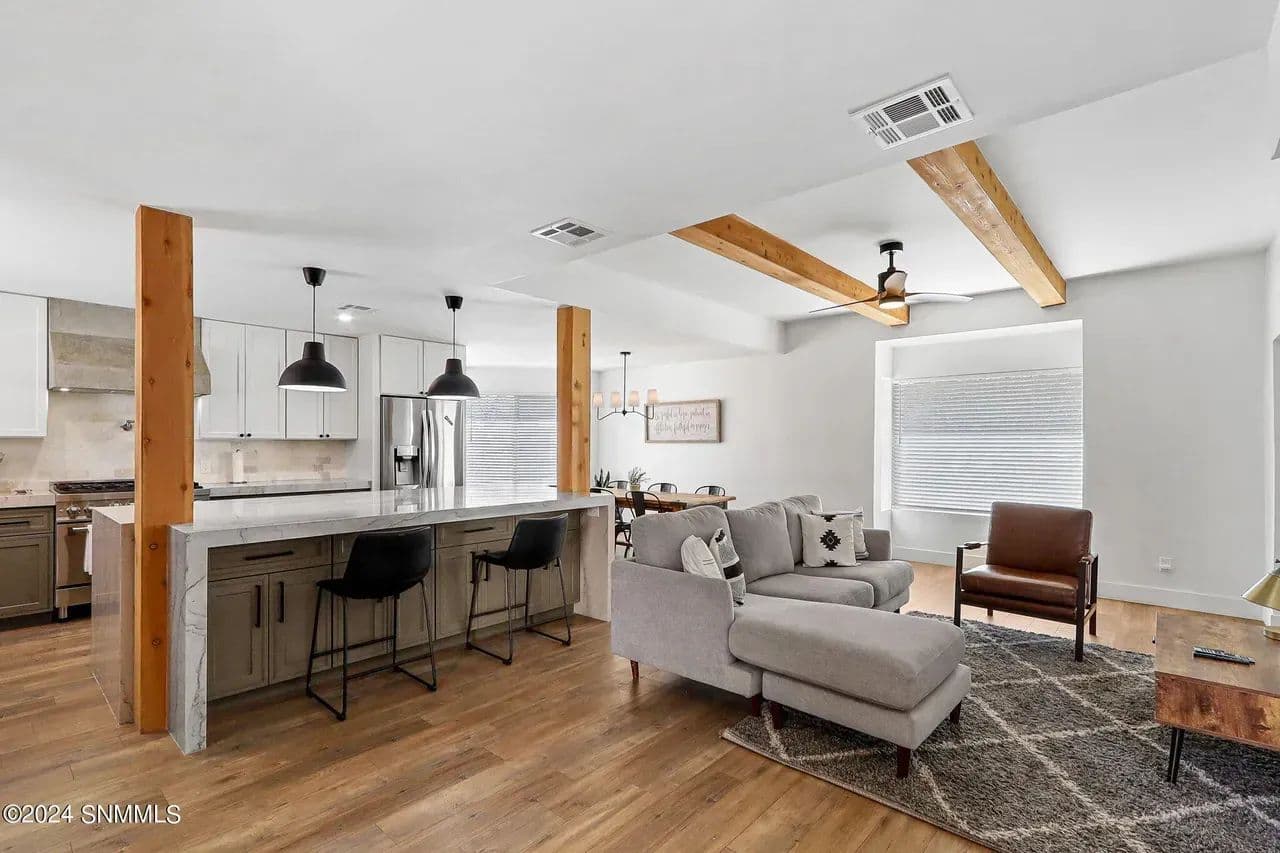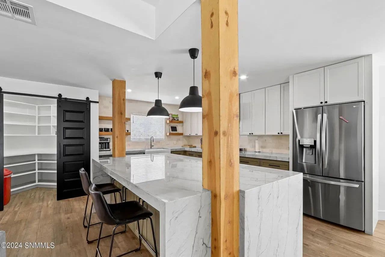 The primary residence is a beautifully remodeled 2170 sqft, 3-bedroom, 2-bathroom, two-story home that underwent a full, top-to-bottom renovation in 2022. The interior blends modern design with southwestern character, featuring exposed wood beams, custom wood columns, and an open-concept layout ideal for entertaining. The kitchen is a true centerpiece, showcasing custom shaker cabinetry with two-tone finishes, a large quartz island with waterfall edges, and a commercial-style gas range with pot filler. Stainless steel appliances, open shelving, designer pendant lighting, and a spacious walk-in pantry with double barn doors complete the space.