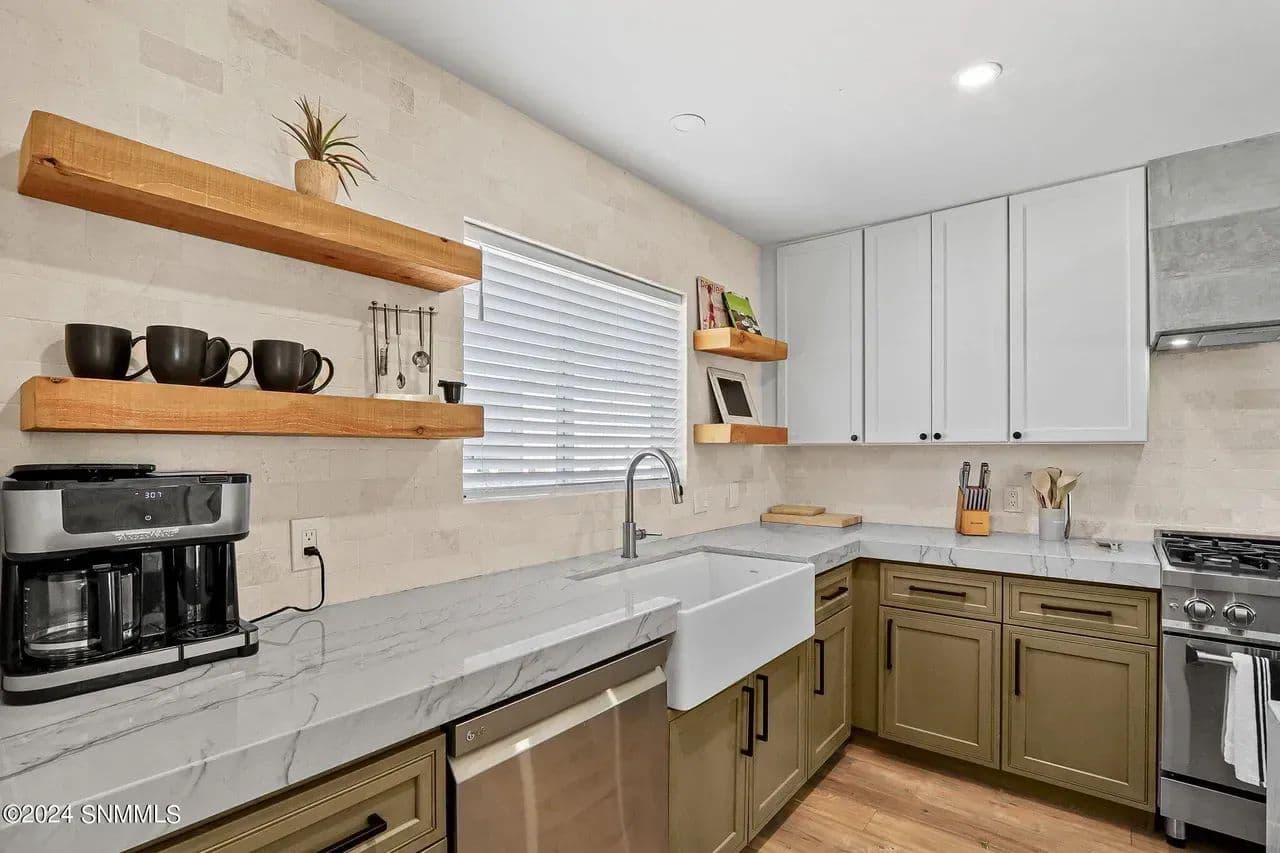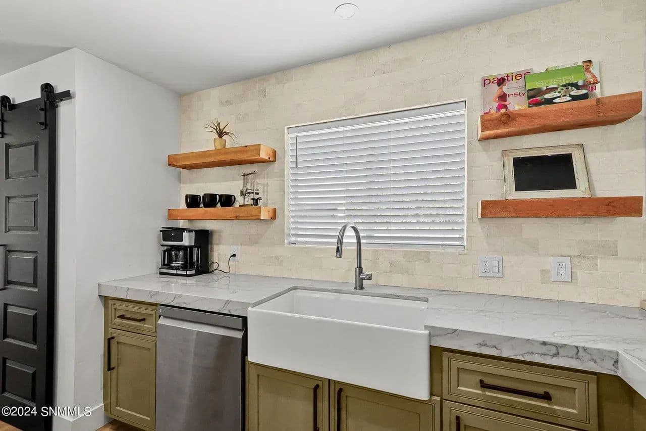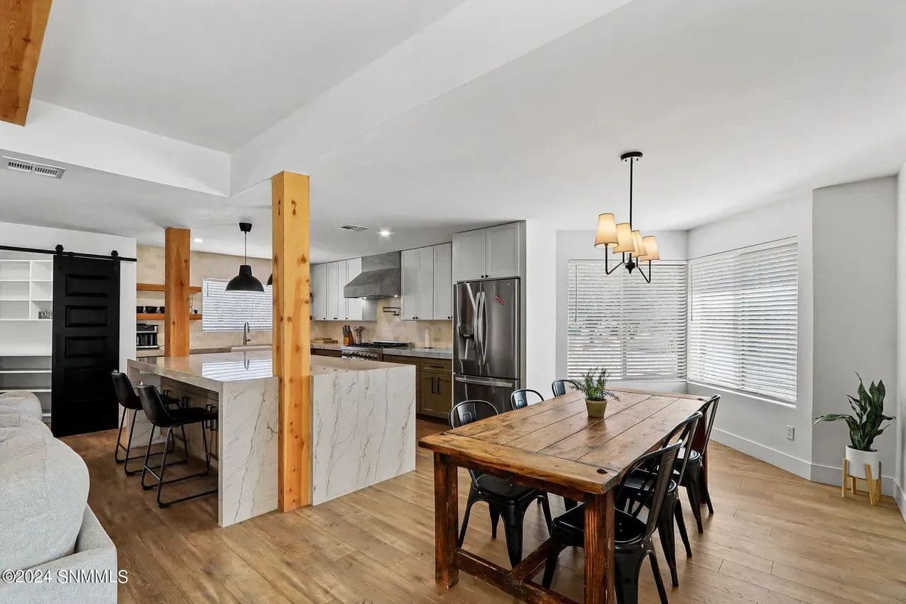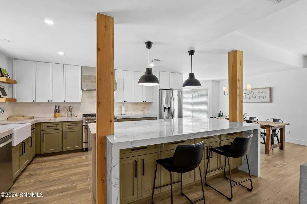The primary residence is a beautifully remodeled 2170 sqft, 3-bedroom, 2-bathroom, two-story home that underwent a full, top-to-bottom renovation in 2022. The interior blends modern design with southwestern character, featuring exposed wood beams, custom wood columns, and an open-concept layout ideal for entertaining. The kitchen is a true centerpiece, showcasing custom shaker cabinetry with two-tone finishes, a large quartz island with waterfall edges, and a commercial-style gas range with pot filler. Stainless steel appliances, open shelving, designer pendant lighting, and a spacious walk-in pantry with double barn doors complete the space.