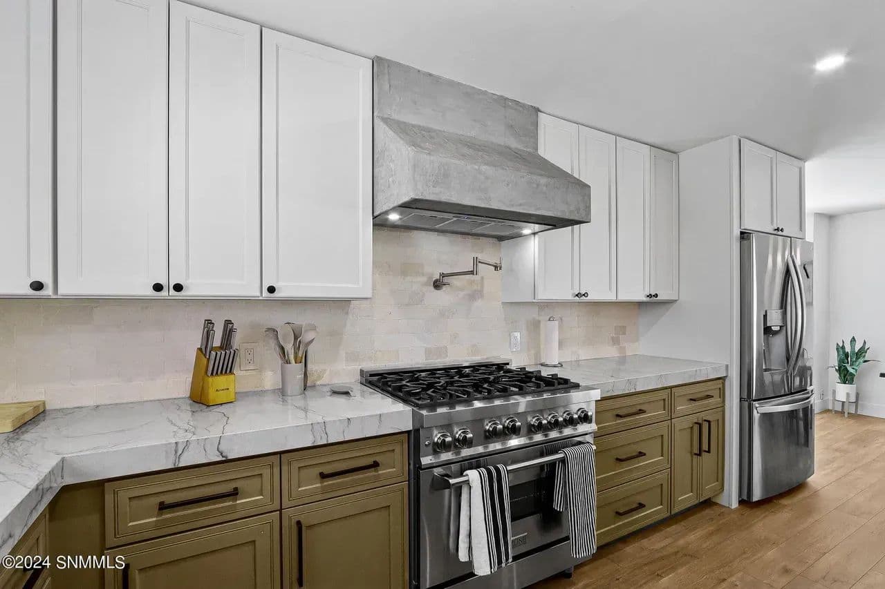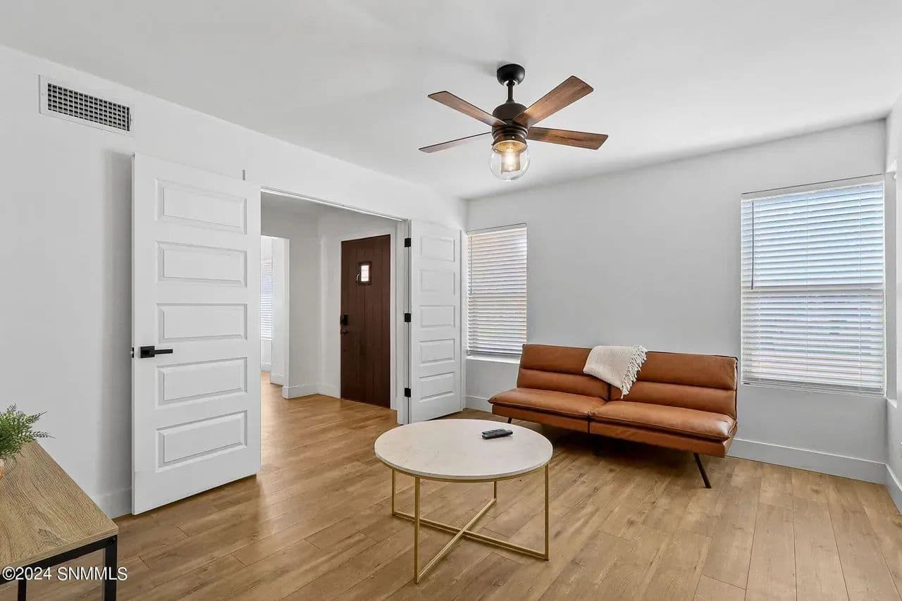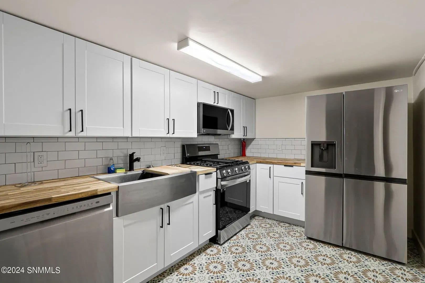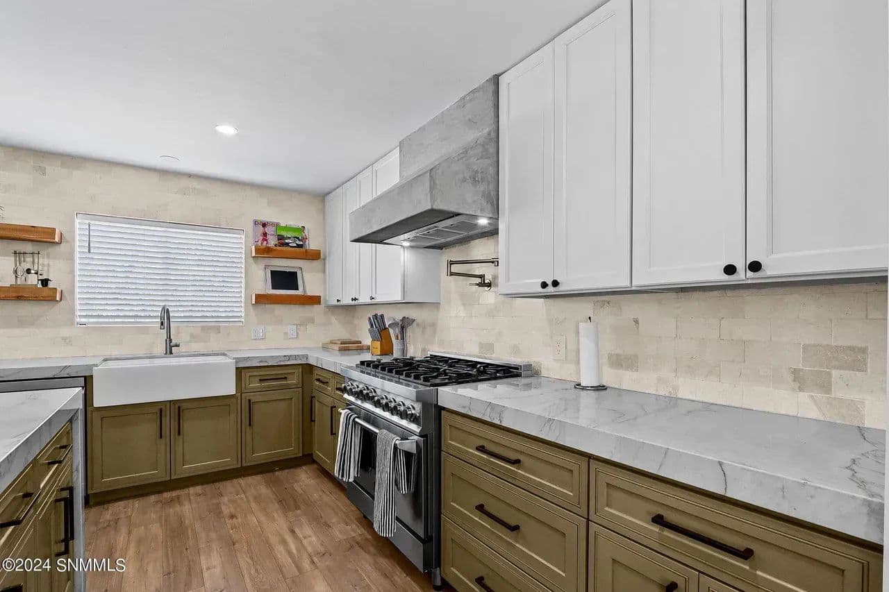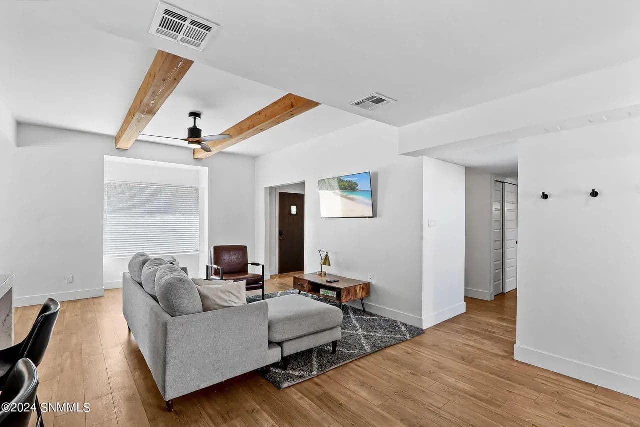The primary residence is a beautifully remodeled 2170 sqft, 3-bedroom, 2-bathroom, two-story home that underwent a full, top-to-bottom renovation in 2022. The interior blends modern design with southwestern character, featuring exposed wood beams, custom wood columns, and an open-concept layout ideal for entertaining. The kitchen is a true centerpiece, showcasing custom shaker cabinetry with two-tone finishes, a large quartz island with waterfall edges, and a commercial-style gas range with pot filler. Stainless steel appliances, open shelving, designer pendant lighting, and a spacious walk-in pantry with double barn doors complete the space.