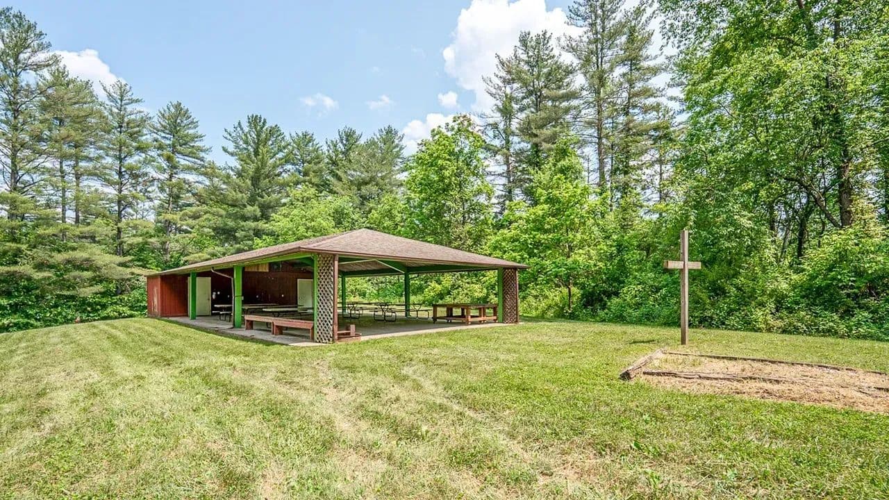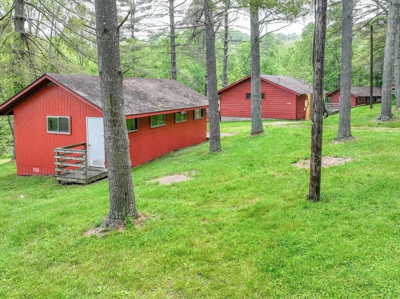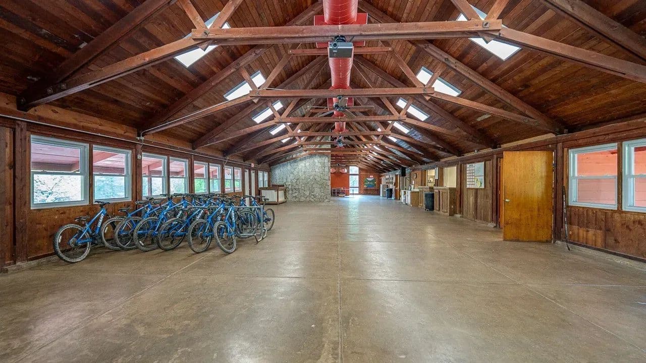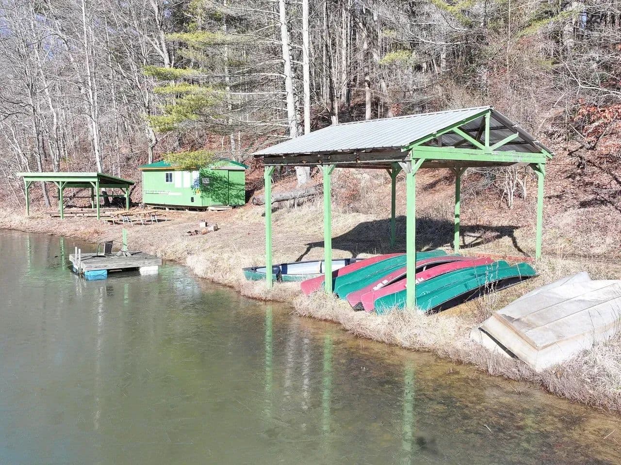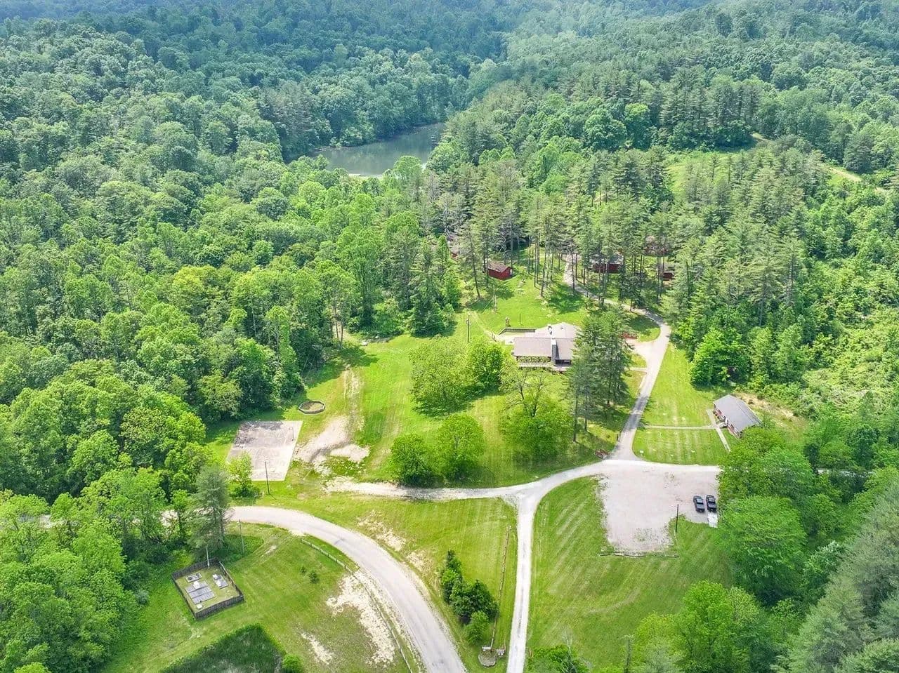Parcel 3 is approximately 50 acres and is the crown jewel of the property. This parcel boasts a 3-acre lake that offers fishing, swimming, and boating, complemented by a large diving platform with an attached rock climbing wall. The main lodge is over 6,600 sq ft, and features a fully working large commercial kitchen, open floor plan, stone fireplace, and restroom facilities, making it well-suited for large gatherings. Additionally, the property includes 8 cabins, 2 shower houses, a 5-bedroom 2-full bath ranch home along with outdoor basketball/volleyball courts. County water service