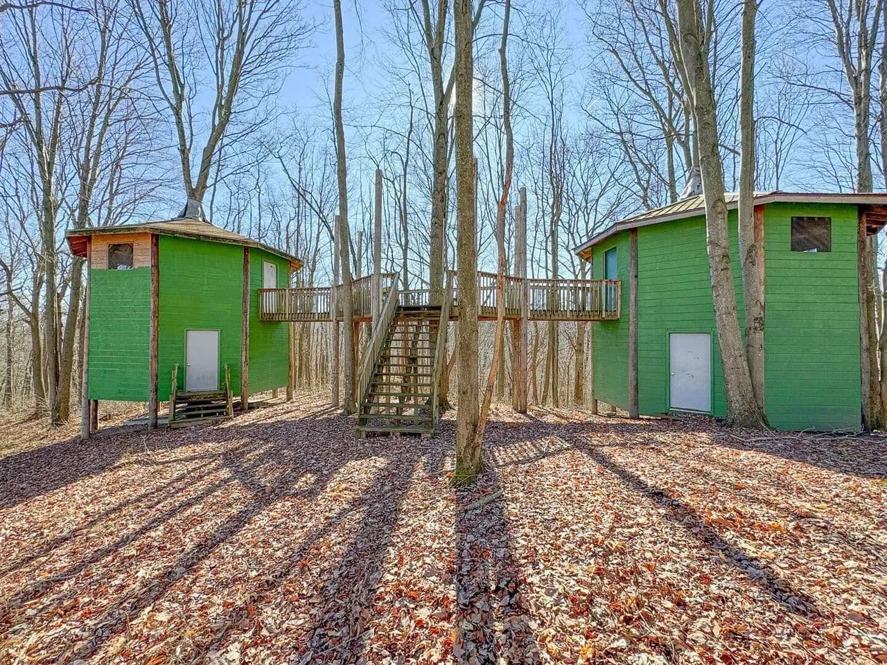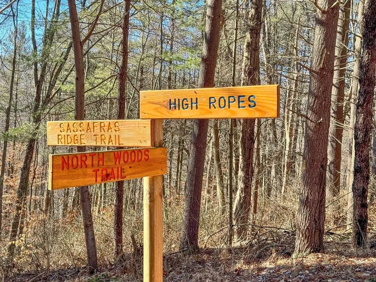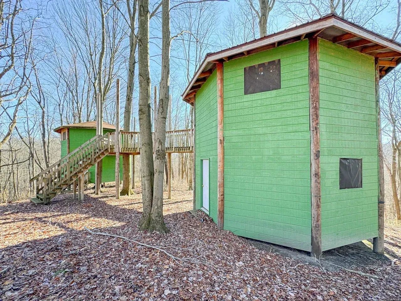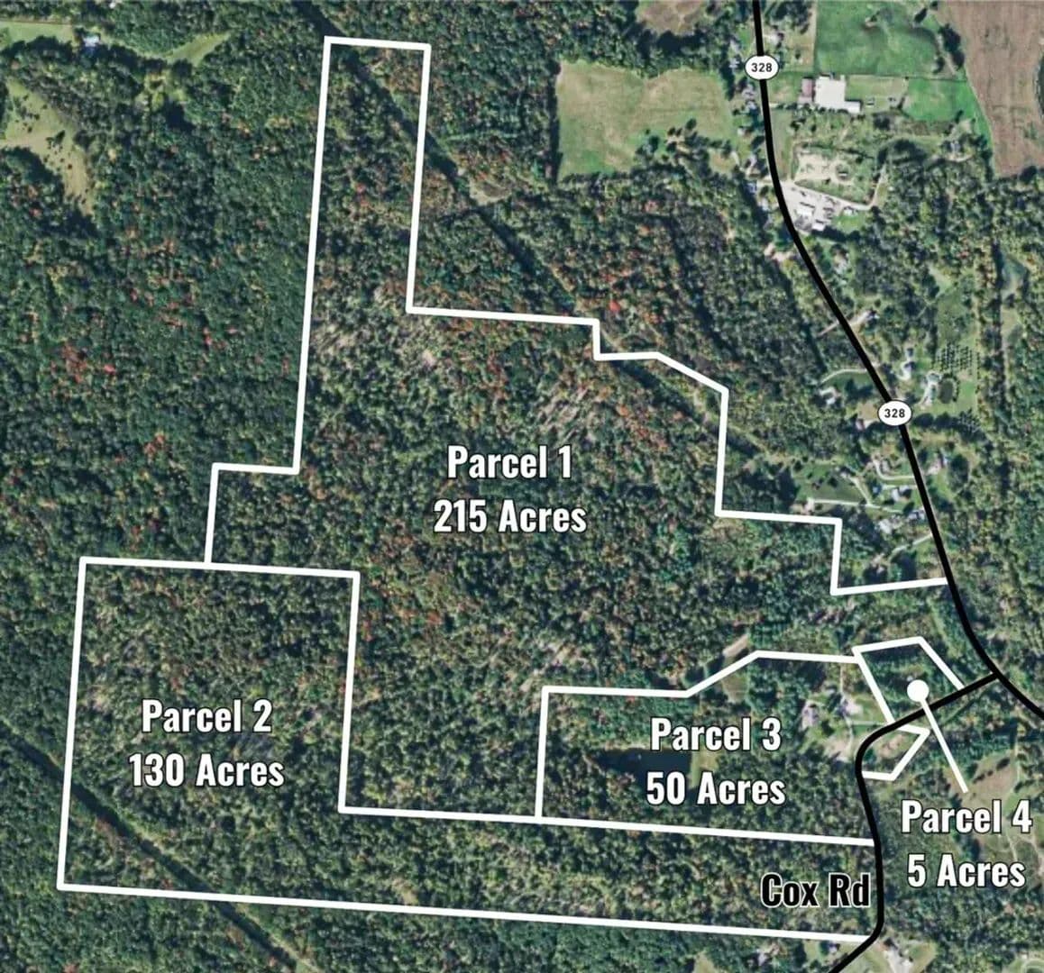 Parcel 1 is approximately 215 acres with road frontage along St Rt 328, Cox Rd, and a driveway easement from St Rt 328. This parcel is entirely wooded, featuring multiple building sites, a ropes course, 2 connected treehouses, excellent trails, and a seasonal creek.