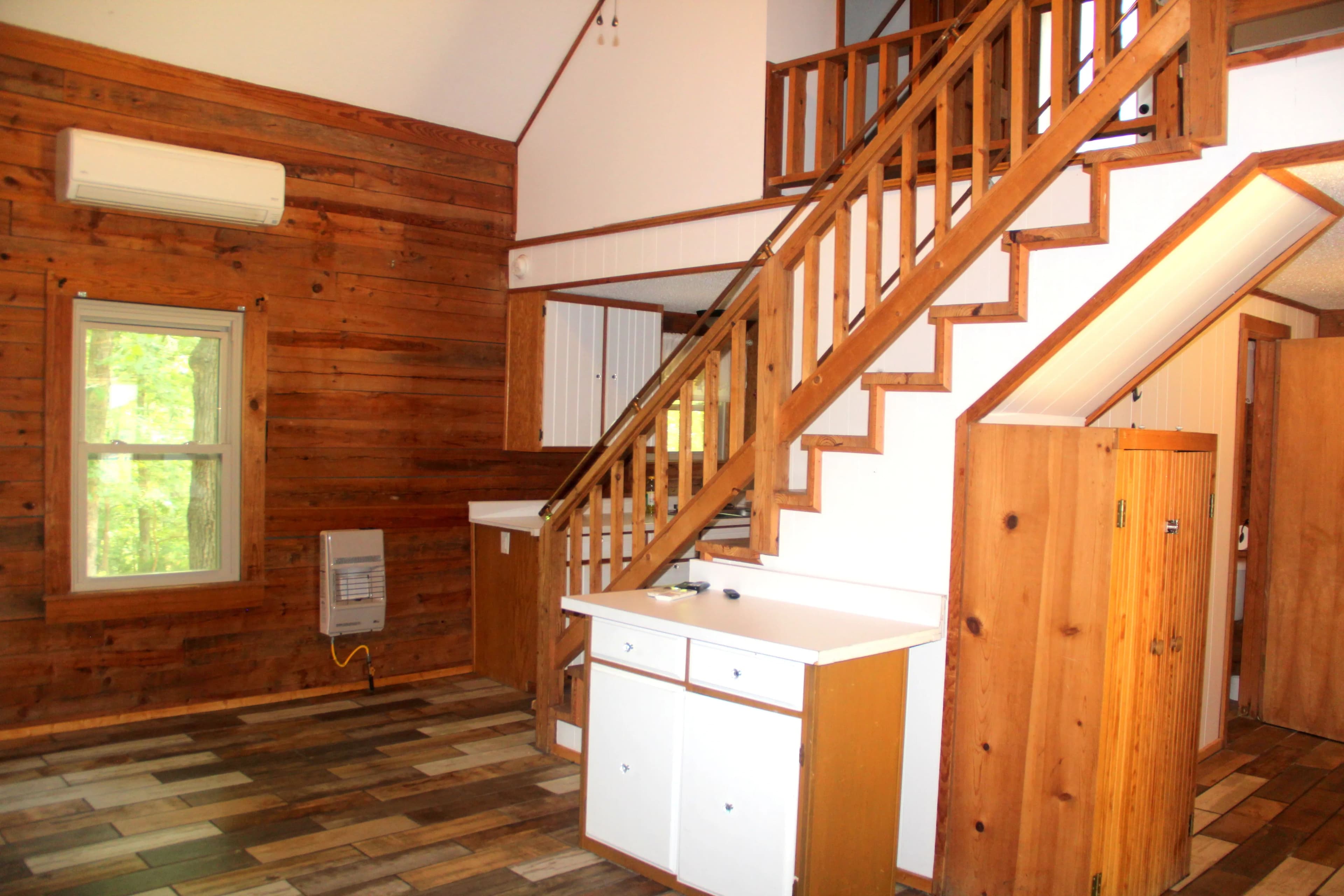 This waterfront Cabin is a 1 Bedroom with a loft and 1.5 baths. Wood burning Fireplace, 800 sq. ft. of Decks nestled in the woods and fire pit create a natural outdoor living space. The Private Red Bud Valley community Common area consists of walking trails, gardens, 2 fishing ponds and playground area.