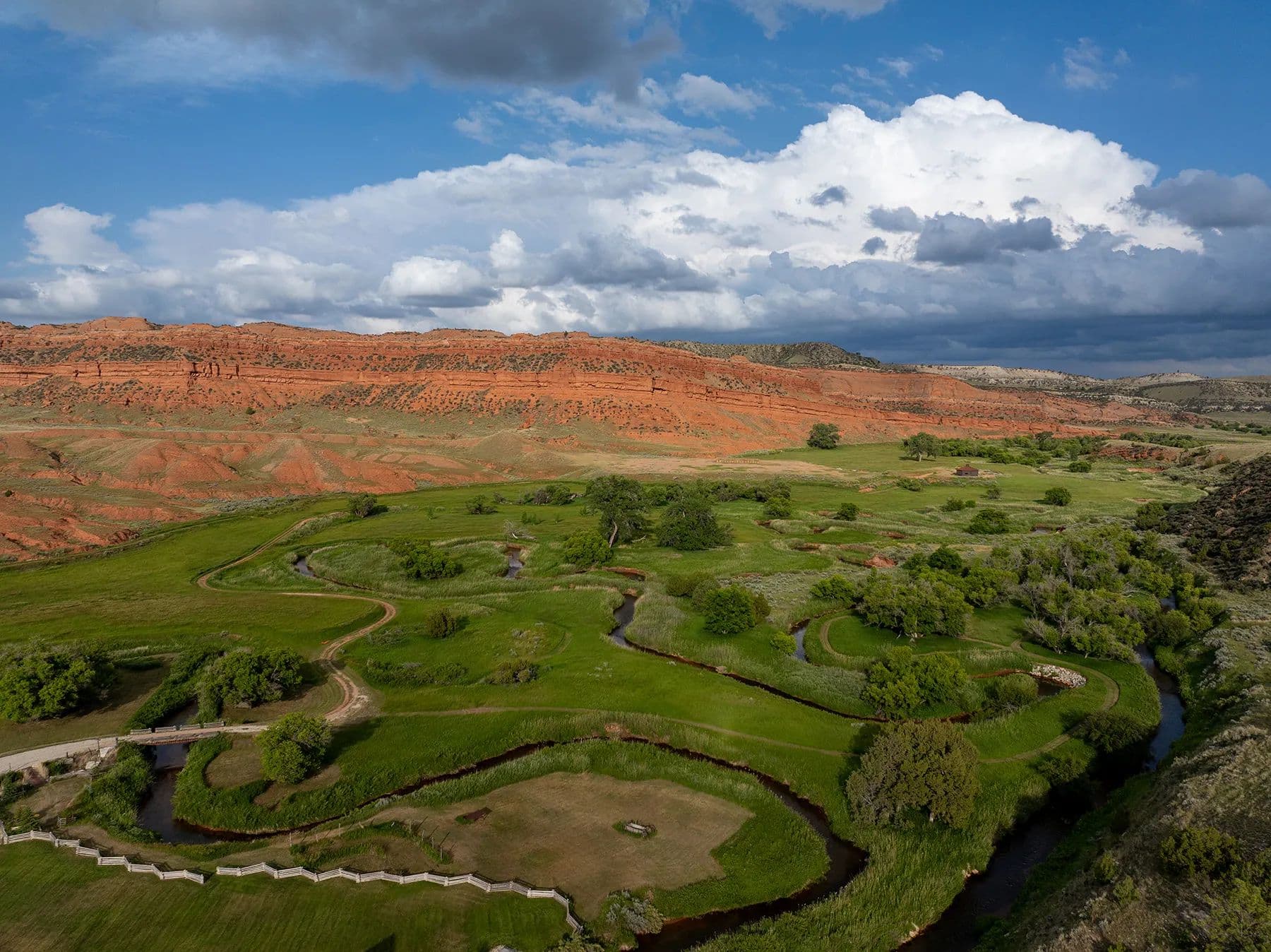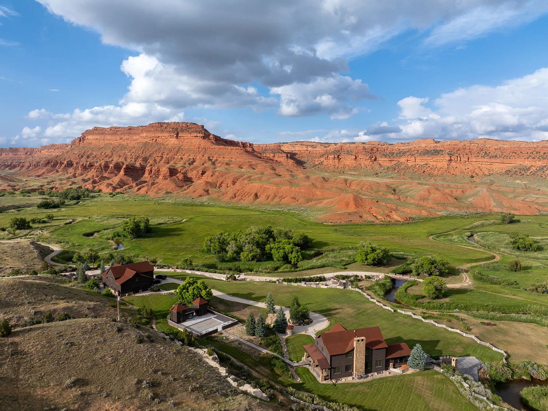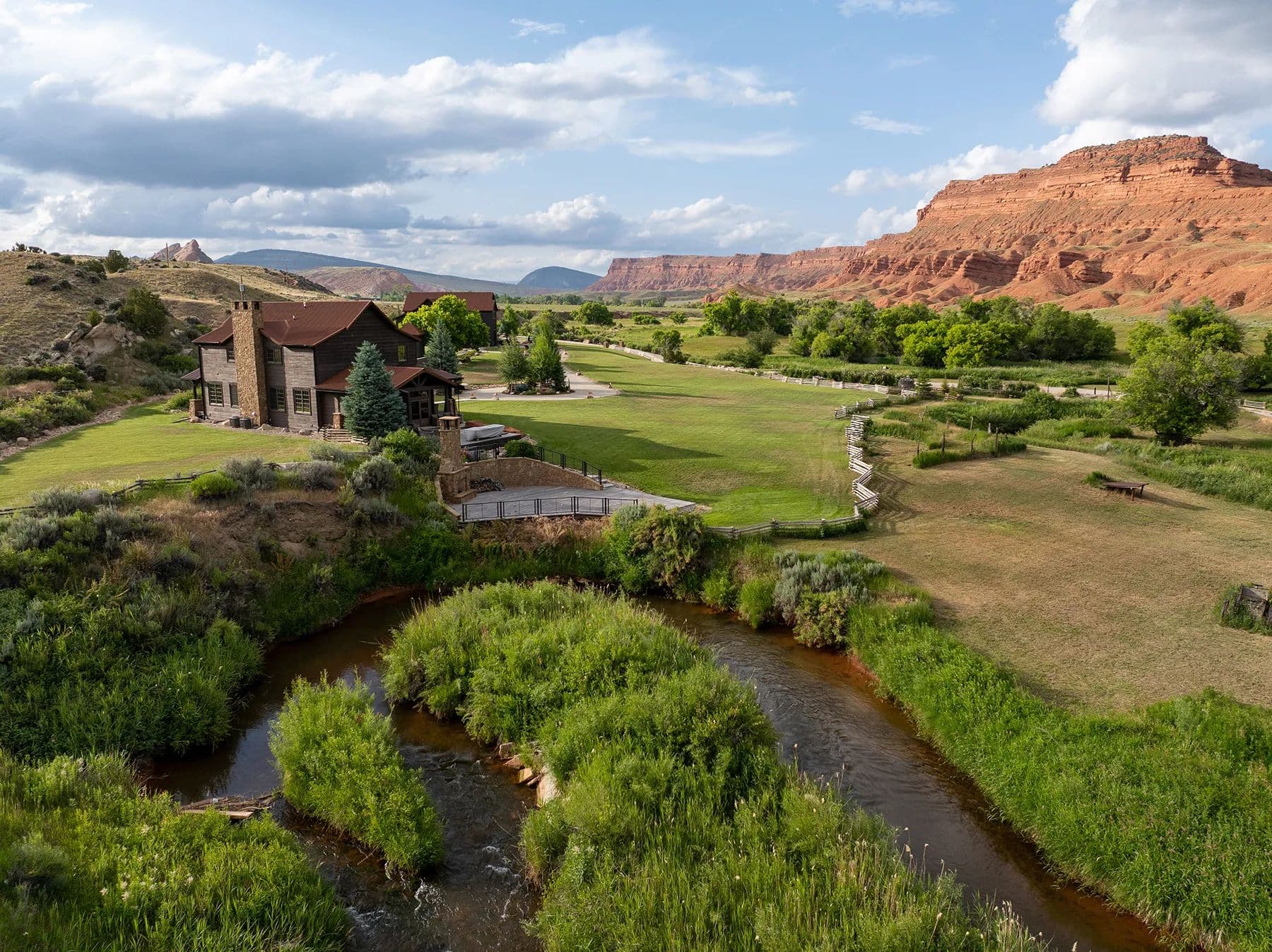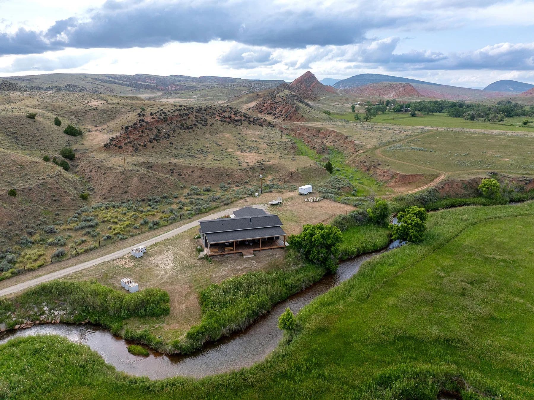 Nestled in central Wyoming's rugged Red Wall area, Lazy Frog Ranch offers 835+/- deeded acres, complemented by 584+/- acres of BLM lease, in an exceptionally private yet accessible location. Situated approximately ten miles southwest of Kaycee, Wyoming, this remarkable property combines modern living, historical richness, and unparalleled recreational opportunities. With over three miles of the Red Fork of the Powder River meandering through its boundaries and below the towering red wall, Lazy Frog Ranch encompasses a stunning landscape, productive irrigated meadows, and an exquisite custom-built home, guest accommodations, and supporting amenities. This ranch provides a secluded retreat ideal for families, corporate gatherings, or those seeking a serene escape into the unspoiled beauty of Wyoming.