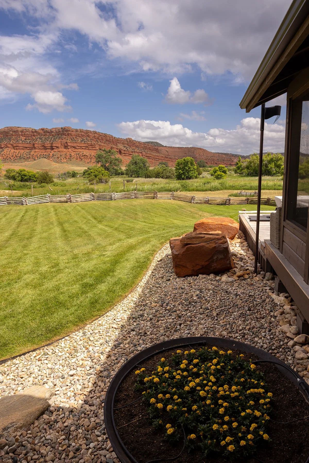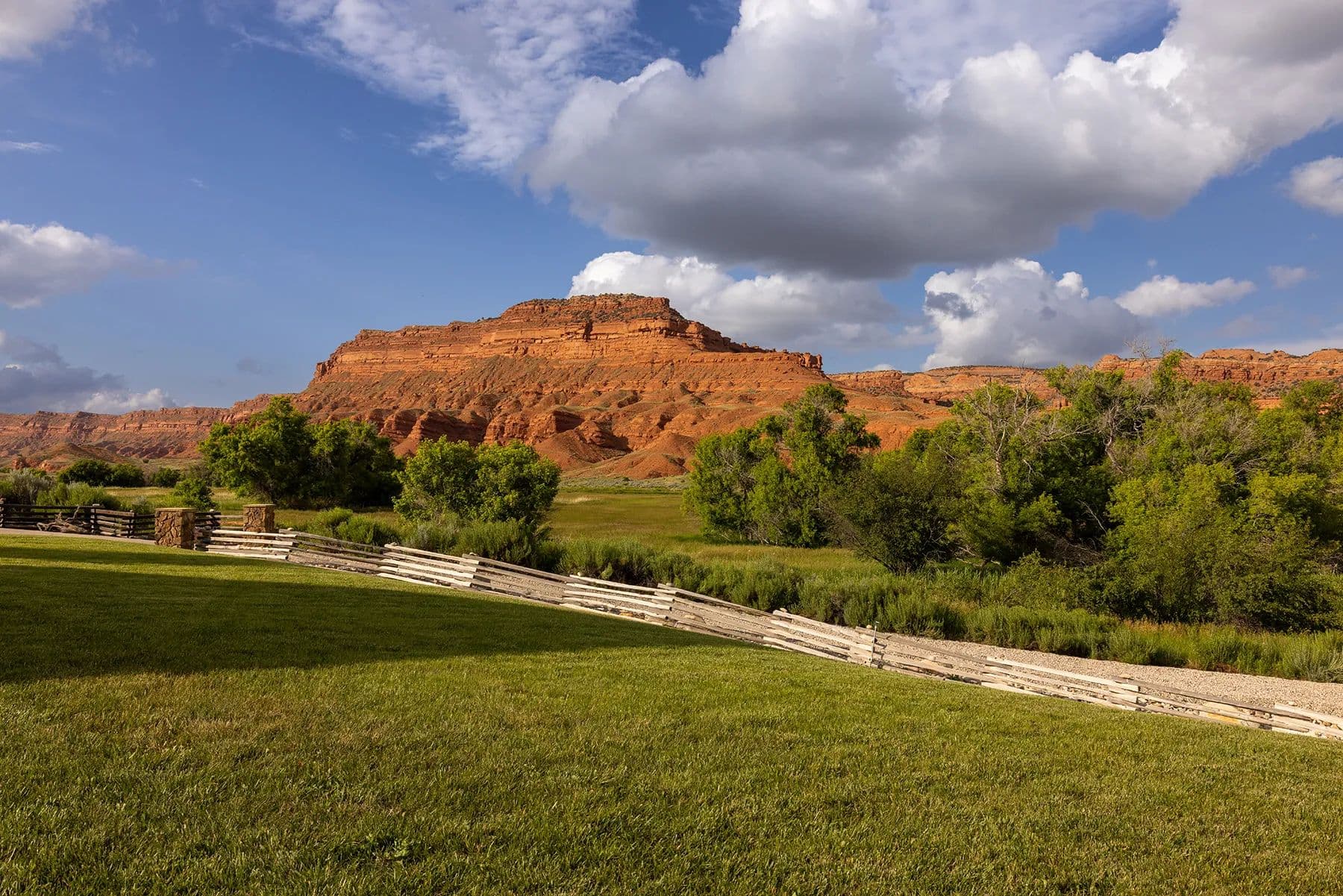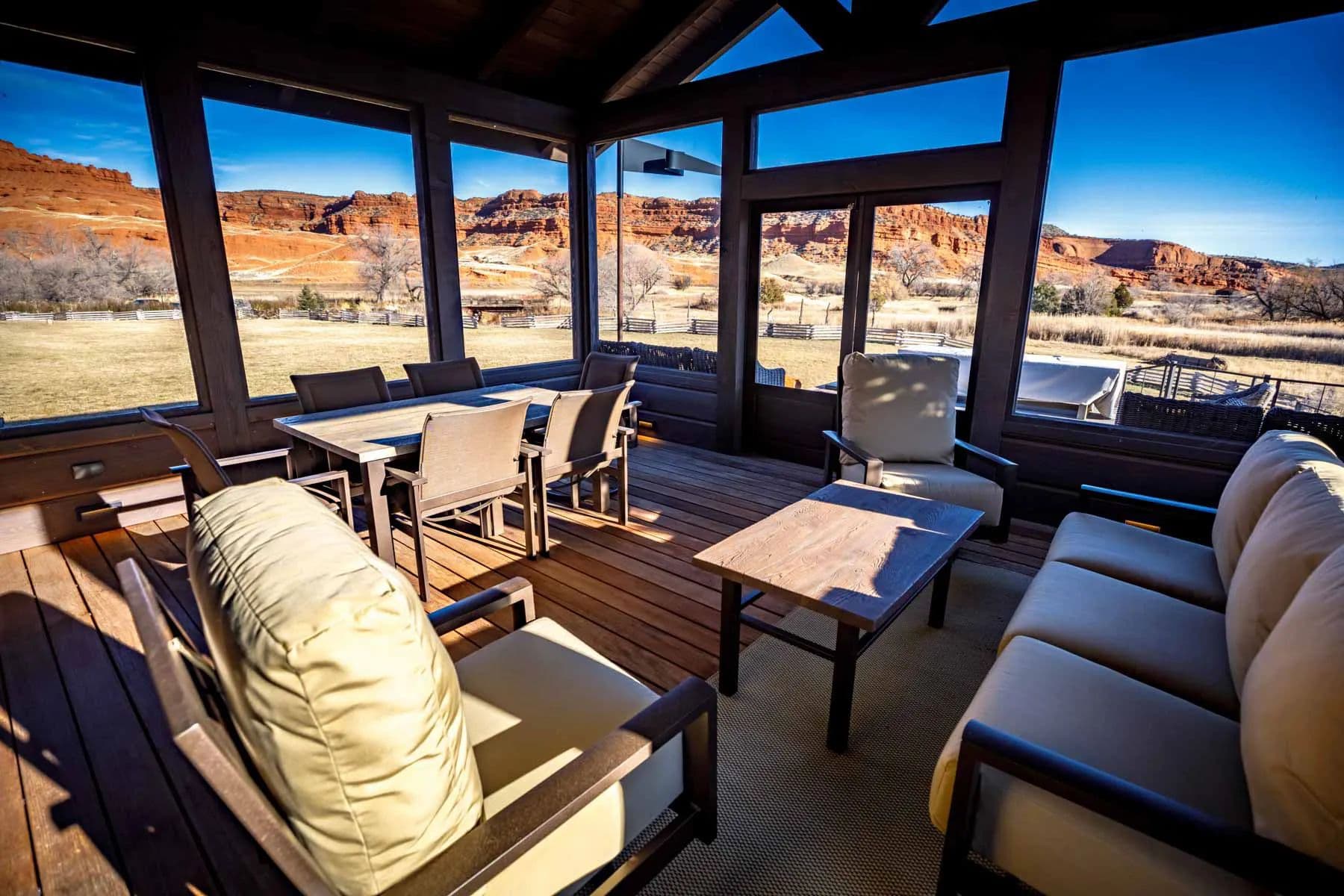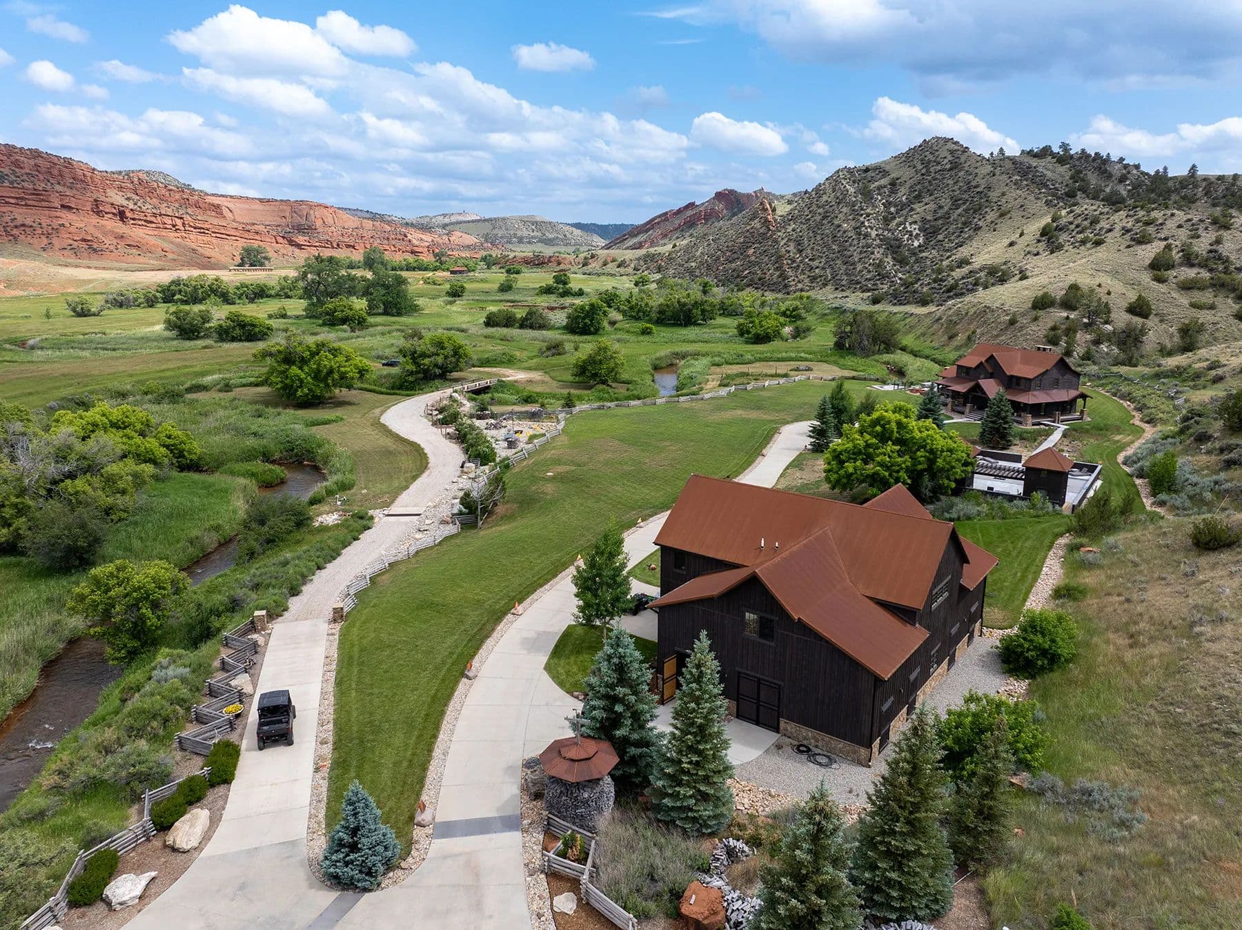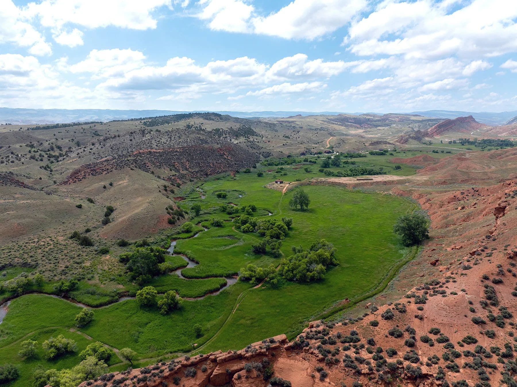 Nestled in central Wyoming's rugged Red Wall area, Lazy Frog Ranch offers 835+/- deeded acres, complemented by 584+/- acres of BLM lease, in an exceptionally private yet accessible location. Situated approximately ten miles southwest of Kaycee, Wyoming, this remarkable property combines modern living, historical richness, and unparalleled recreational opportunities. With over three miles of the Red Fork of the Powder River meandering through its boundaries and below the towering red wall, Lazy Frog Ranch encompasses a stunning landscape, productive irrigated meadows, and an exquisite custom-built home, guest accommodations, and supporting amenities. This ranch provides a secluded retreat ideal for families, corporate gatherings, or those seeking a serene escape into the unspoiled beauty of Wyoming.