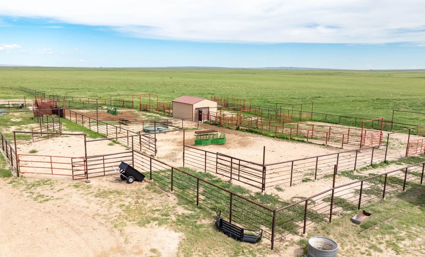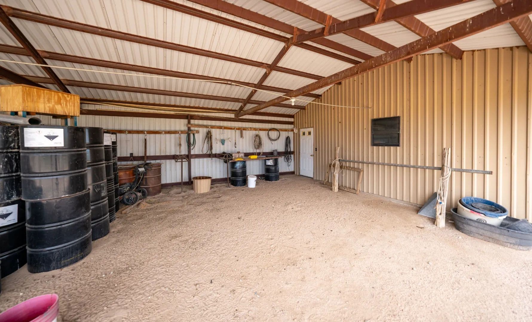 The south portion of the ranch is equally robust, with 11 wells in total—five electric submersible, two solar, two windmills, and two unused wells offering potential for expansion. This half supports 13 pastures and eight traps, alongside two additional sets of pipe working pens. Operational infrastructure includes a 10,000-pound livestock scale, two 36-ton cake bins, and a network of well-designed outbuildings: a 40' x 60' pole hay barn, 40' x 8' storage container, and a 36' x 80' barn featuring a loft, stalls, and partial concrete flooring. Equipment is housed in a 110' x 24' metal building with six stalls, complemented by an 11' x 24' tack room and a 23' x 24' shop, both set on solid concrete pads.