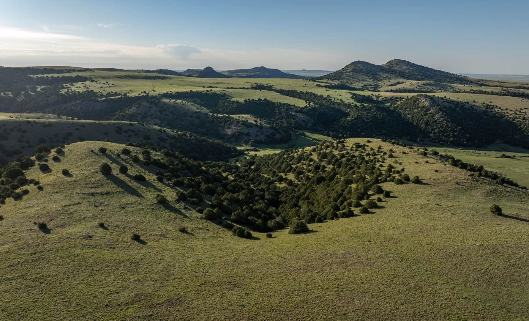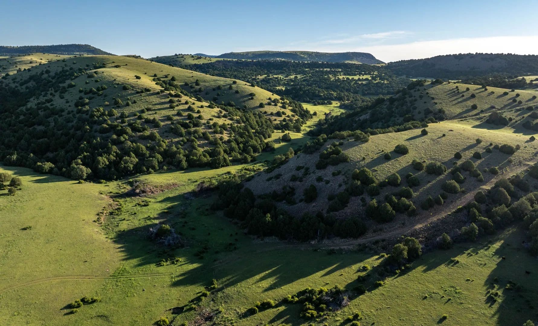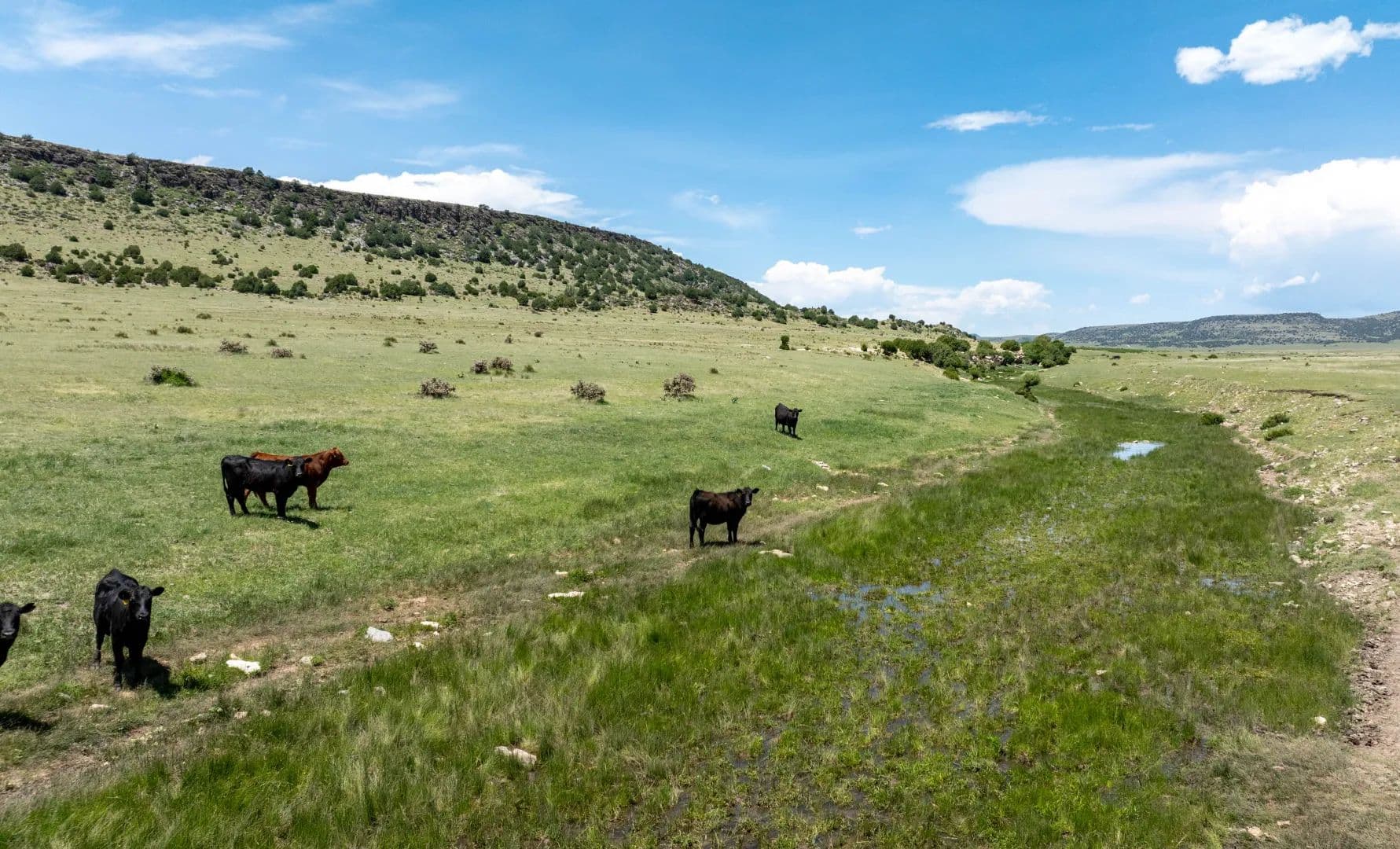 The ranch’s open grazing areas are covered with hardy, palatable native grasses such as grama, western wheatgrass, side oats, and bluestem varieties. In all, approximately 75% of the property is considered prime livestock grazing land, with the remaining 25% comprising scenic highlands, broad valleys, open meadows, and sweeping mesa tops.