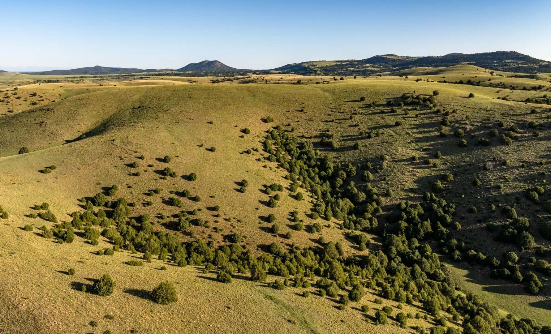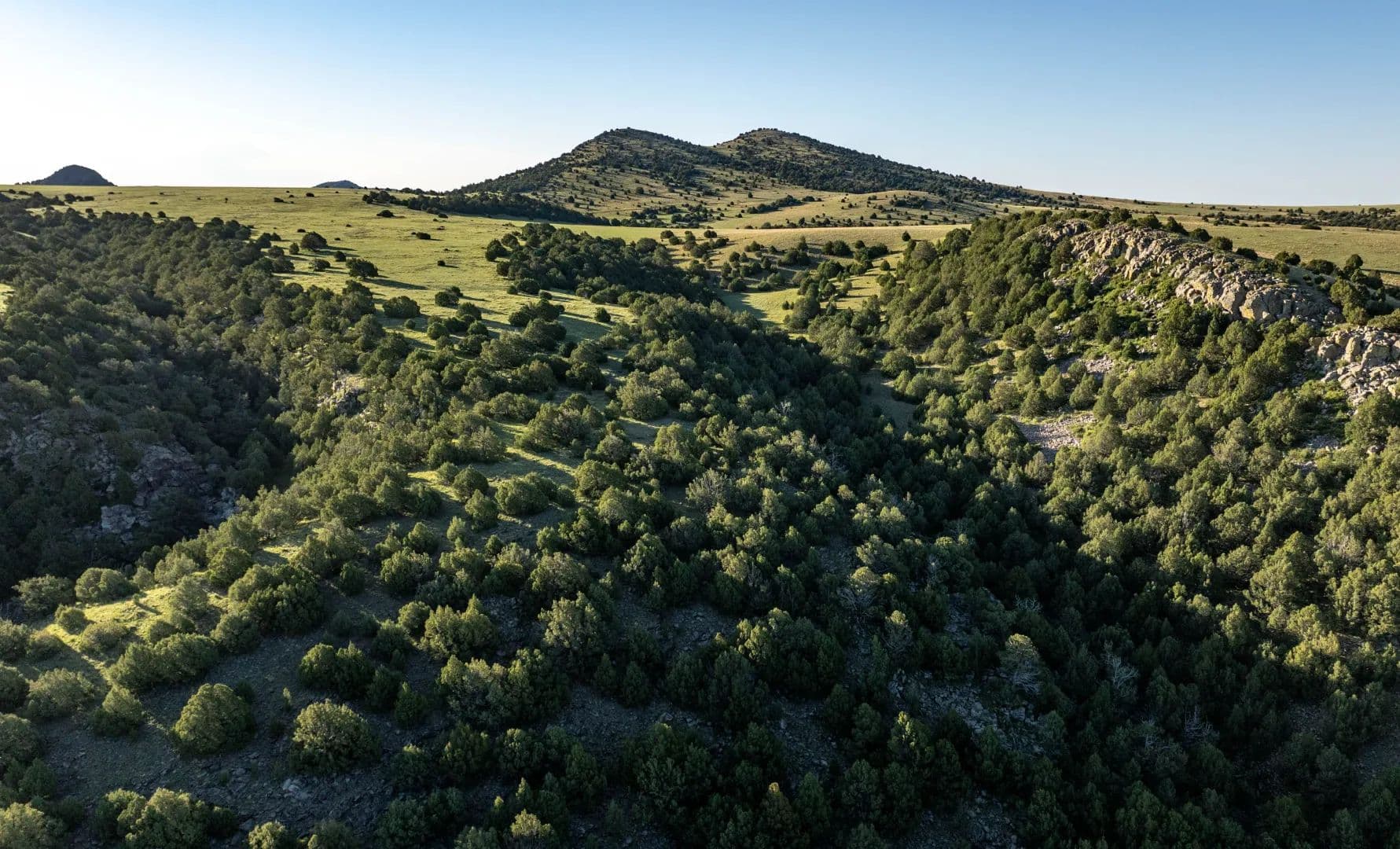 Even the mesa tops provide productive pastureland, a trait shared across much of the central and southern portions of the ranch. Several peaks rise from the northern end, with Temple Peak—reaching over 7,760 feet—standing as the highest and most prominent landmark. The more rugged slopes are marked by outcrops of limestone and sandstone, while volcanic features like craters and Malpais lava rock lend a striking and unique geological character.