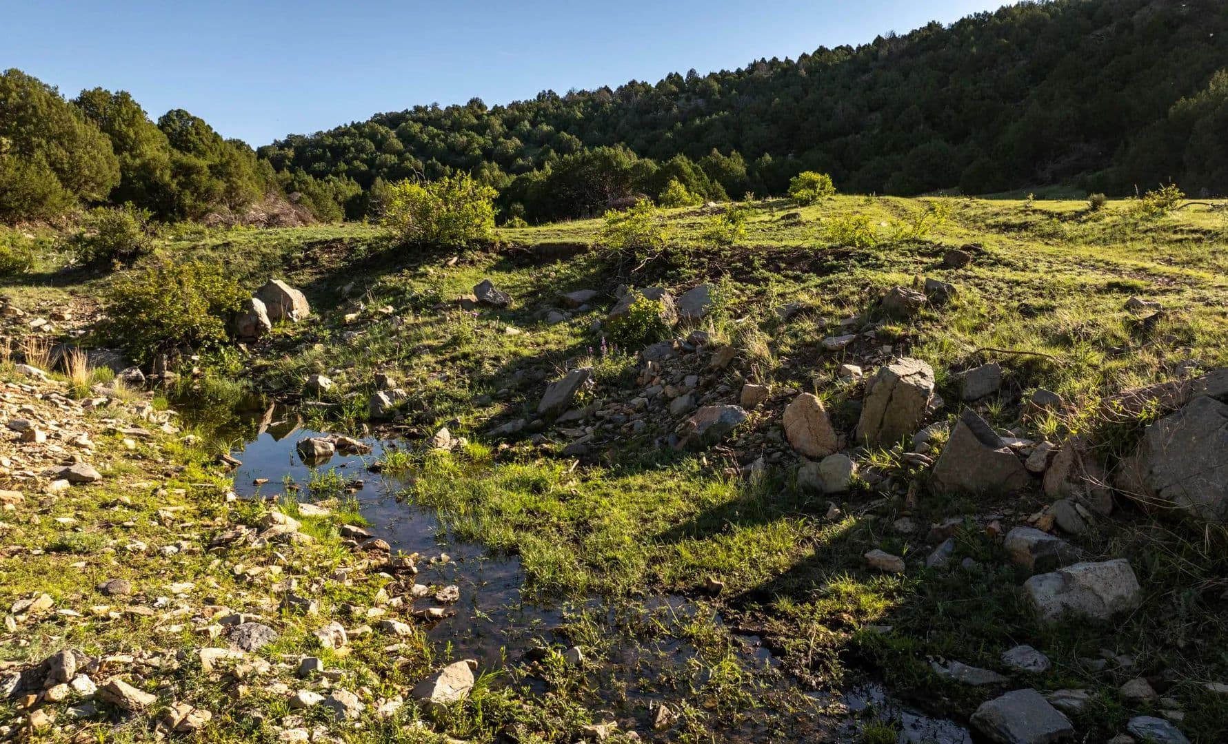 Holkeo Creek runs through the northern section of the ranch, featuring live water that surfaces intermittently before retreating underground and reemerging downstream. Numerous springs are also found in the canyons and at the base of the mesas, contributing to a strong natural water supply.